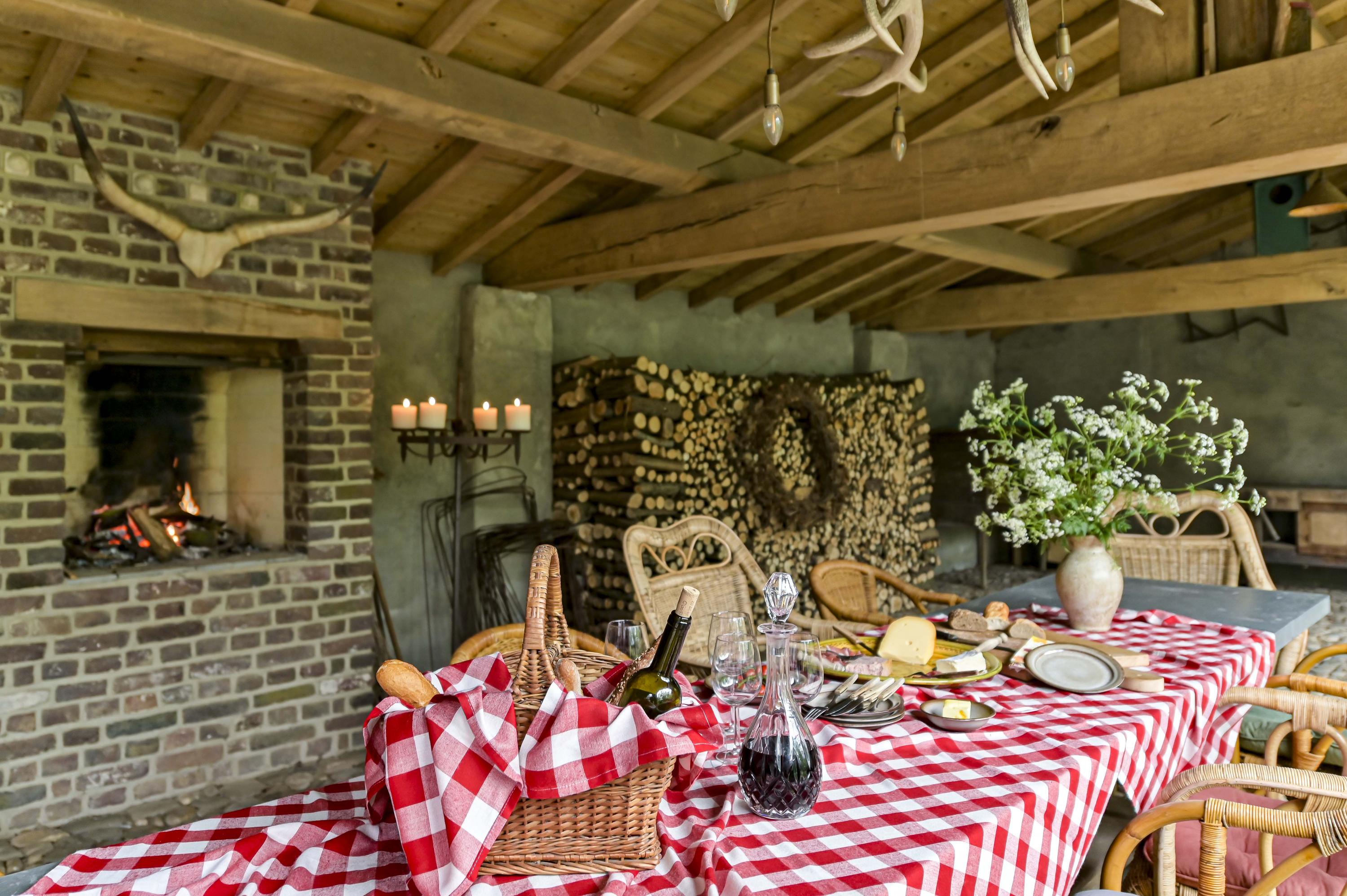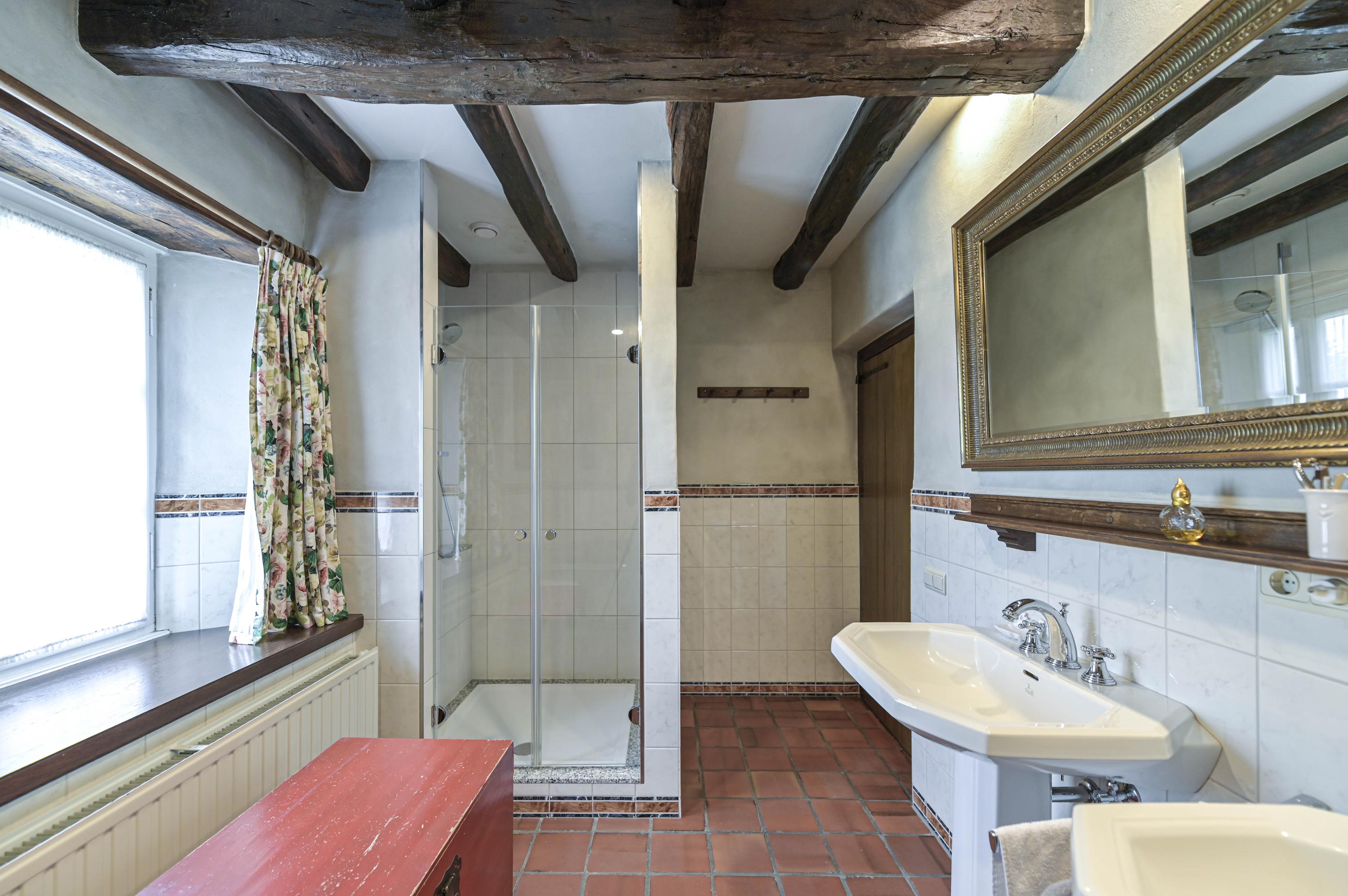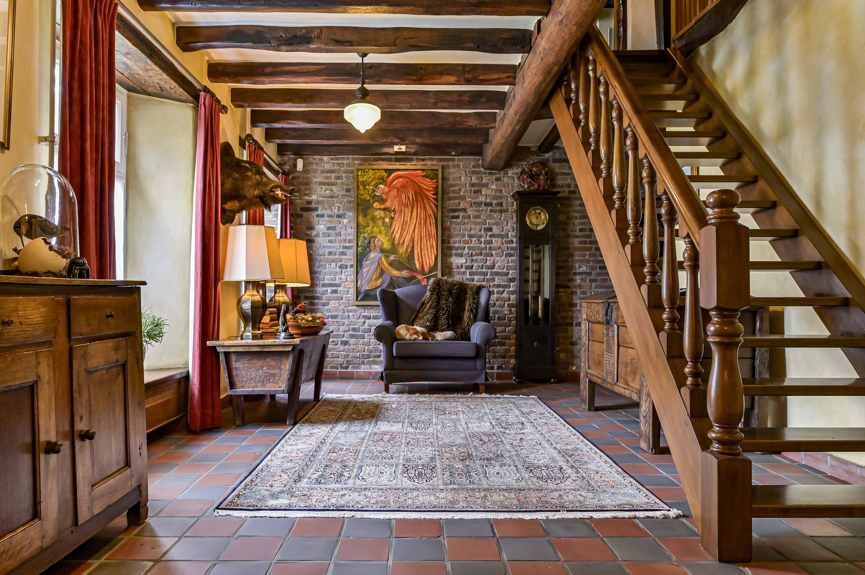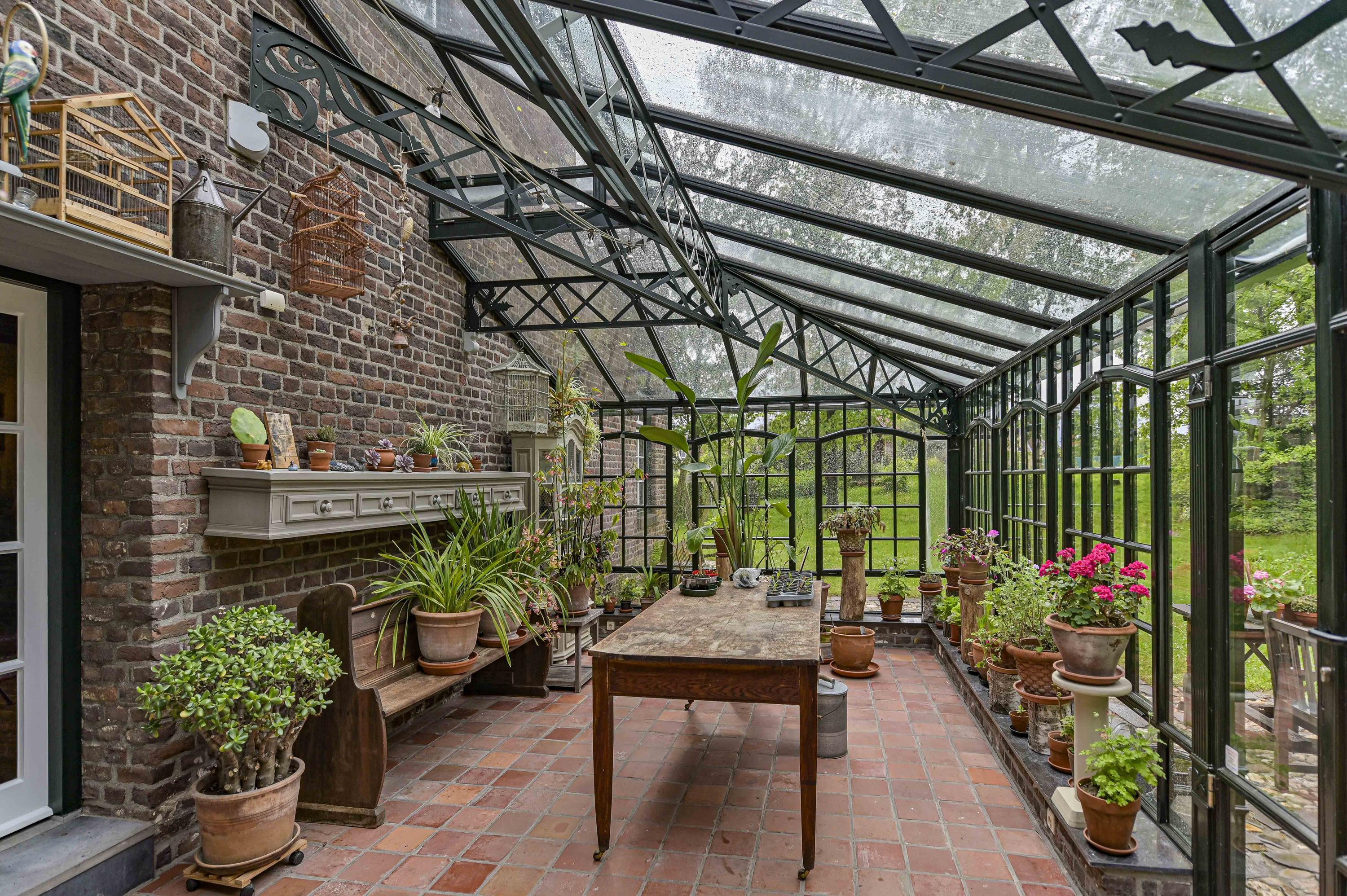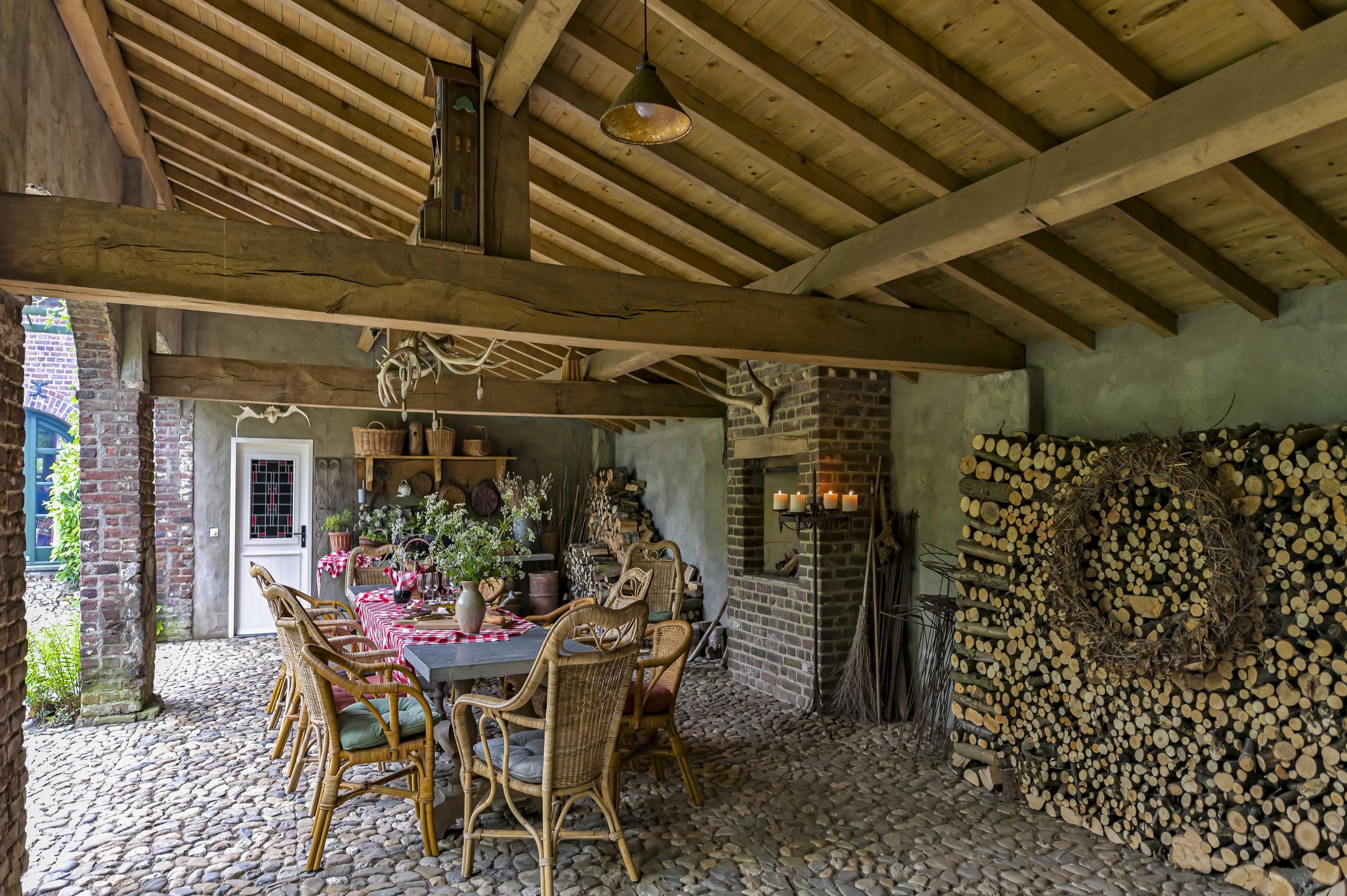Dans toute la demeure, des éléments architecturaux d’origine tels que caves voûtées, portes-fenêtres, parquets en bois et majestueuse cheminée ouverte côtoient de grandes baies vitrées et un aménagement décloisonné aux volumes confortables. La cour centrale, ornée d’élégantes arches et d’une terrasse couverte de 65 m², est le cœur de la propriété et brouille subtilement les frontières entre intérieur et espaces extérieurs soignés. La véranda en aluminium avec chauffage au sol offre un panorama sur les jardins manucurés, un étang et des arbres matures, assurant lumière et tranquillité tout au long de l’année.