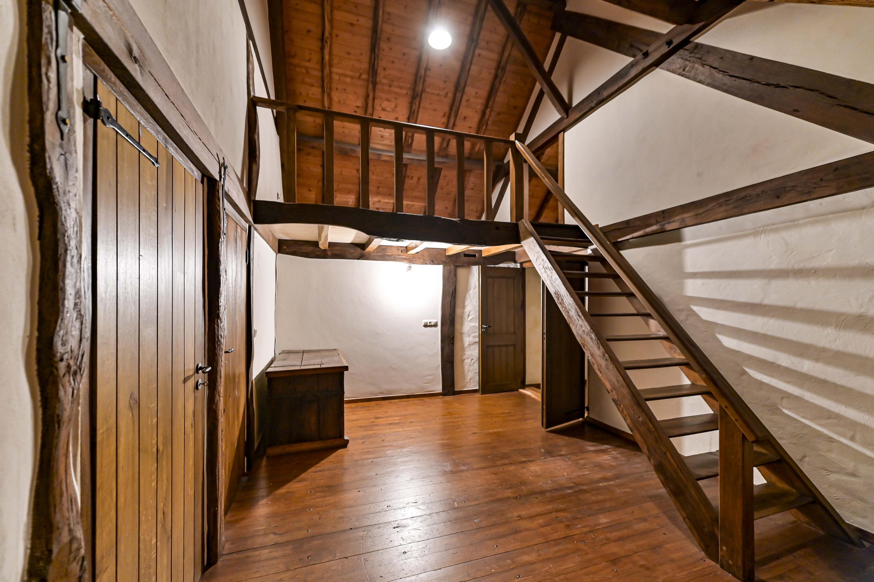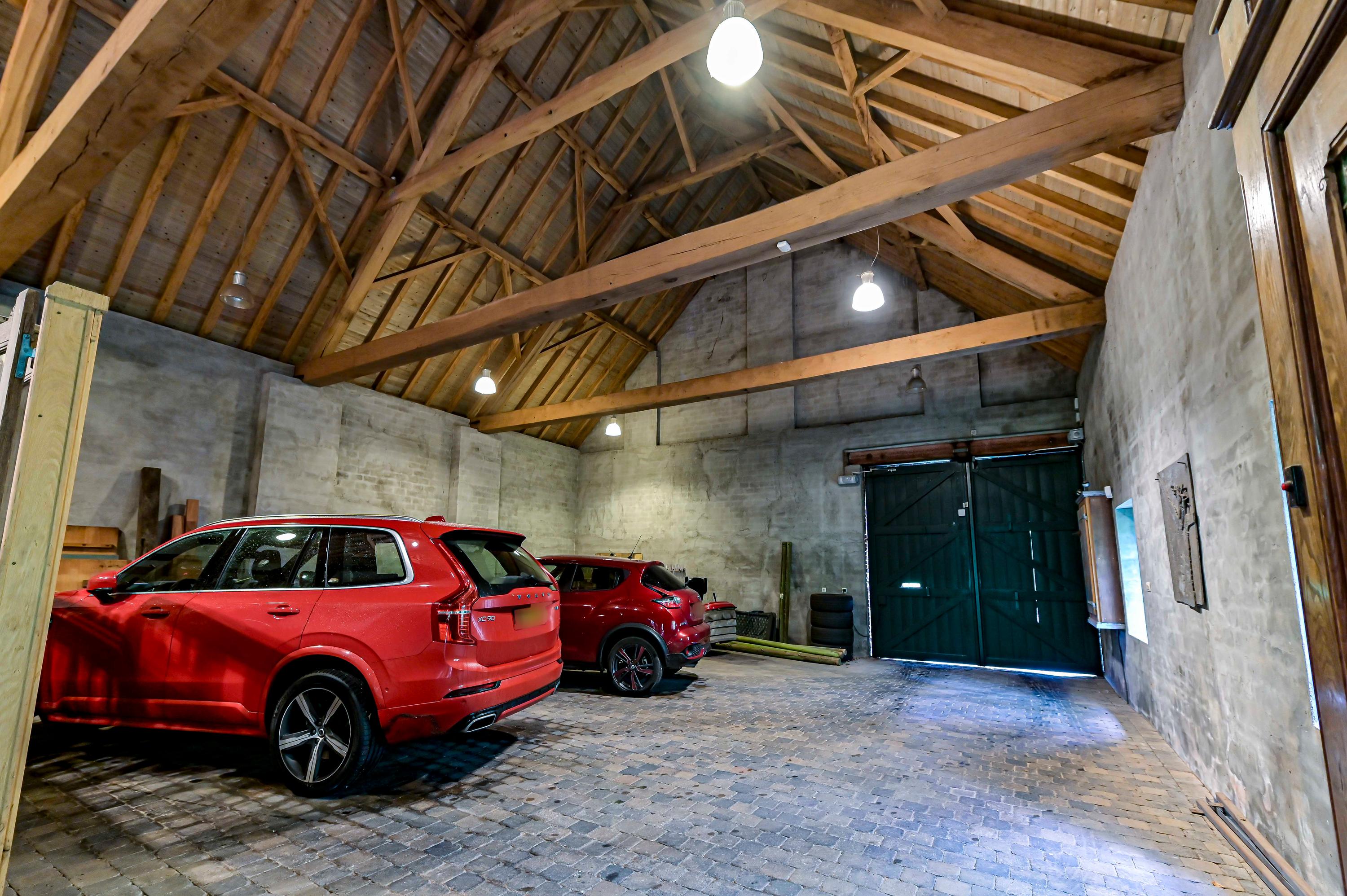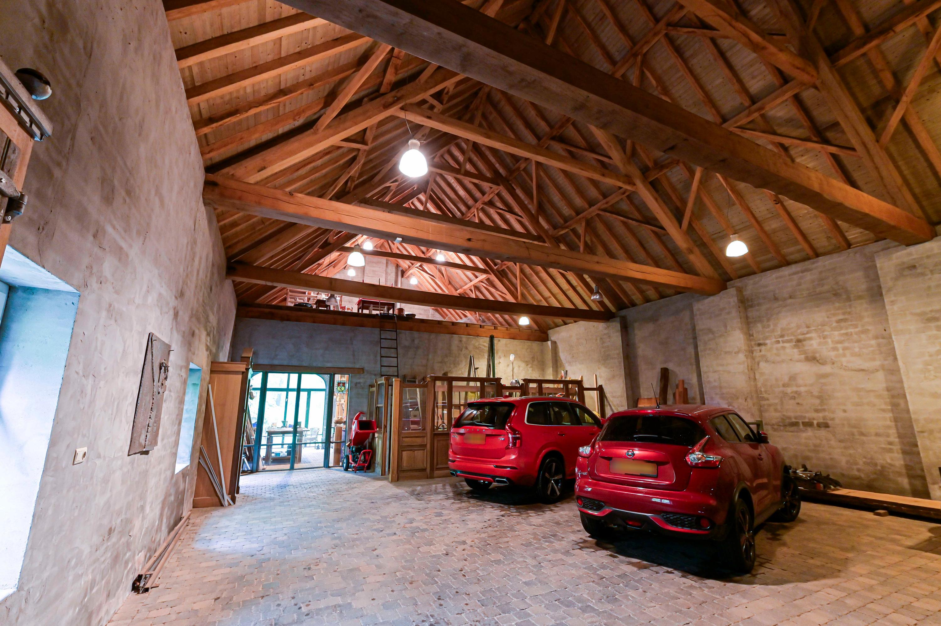 La fonctionnalité est sublimée par un garage à haut plafond et un atelier entièrement équipé, tous deux accessibles par un portail électrique privé. Les équipements contemporains tels que la ventilation mécanique, le chauffage central et la climatisation s’intègrent harmonieusement dans le rythme intemporel de la ferme. La mezzanine, les espaces en soupente et le vaste grenier promettent de belles possibilités d’aménagement.