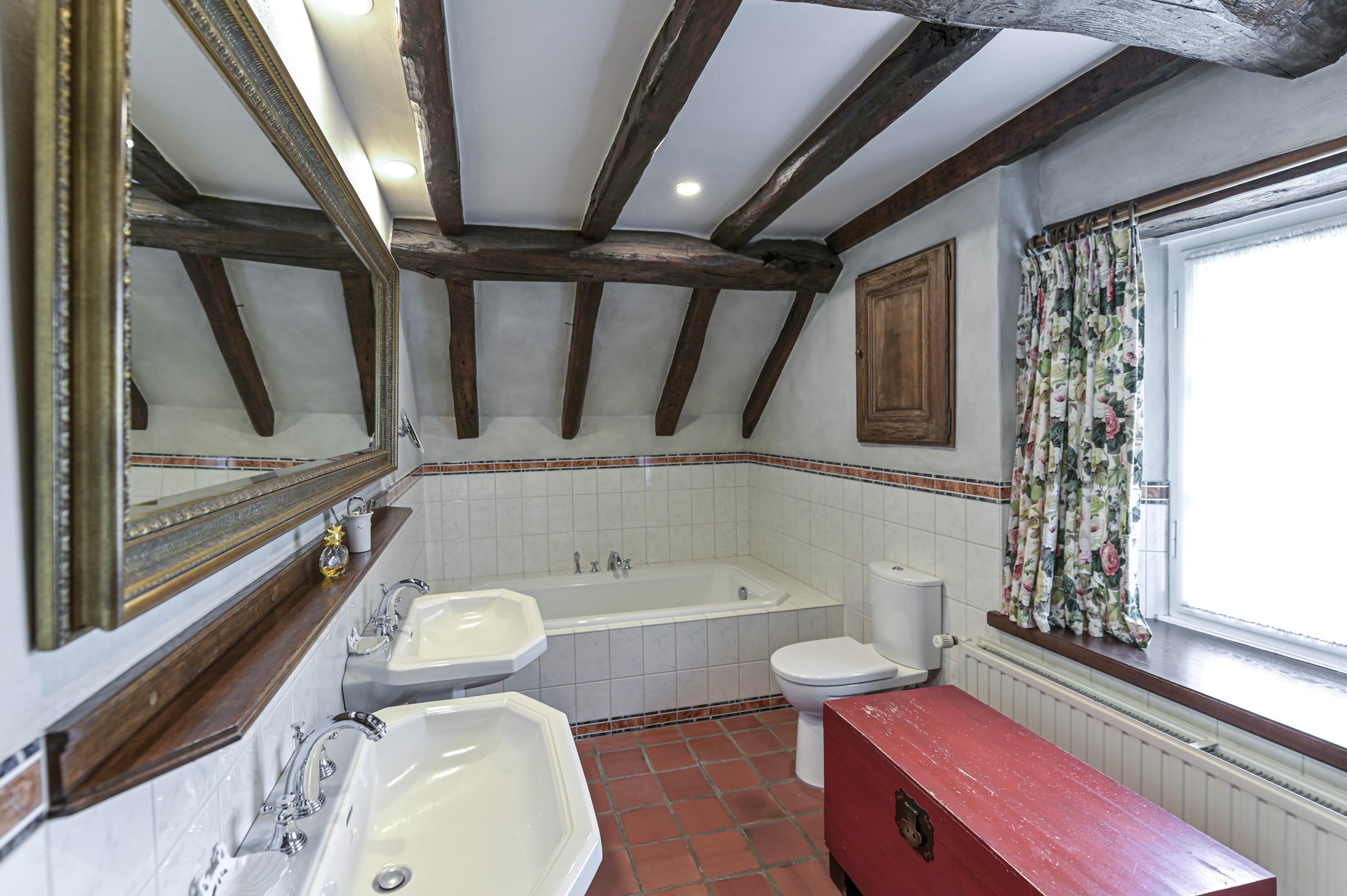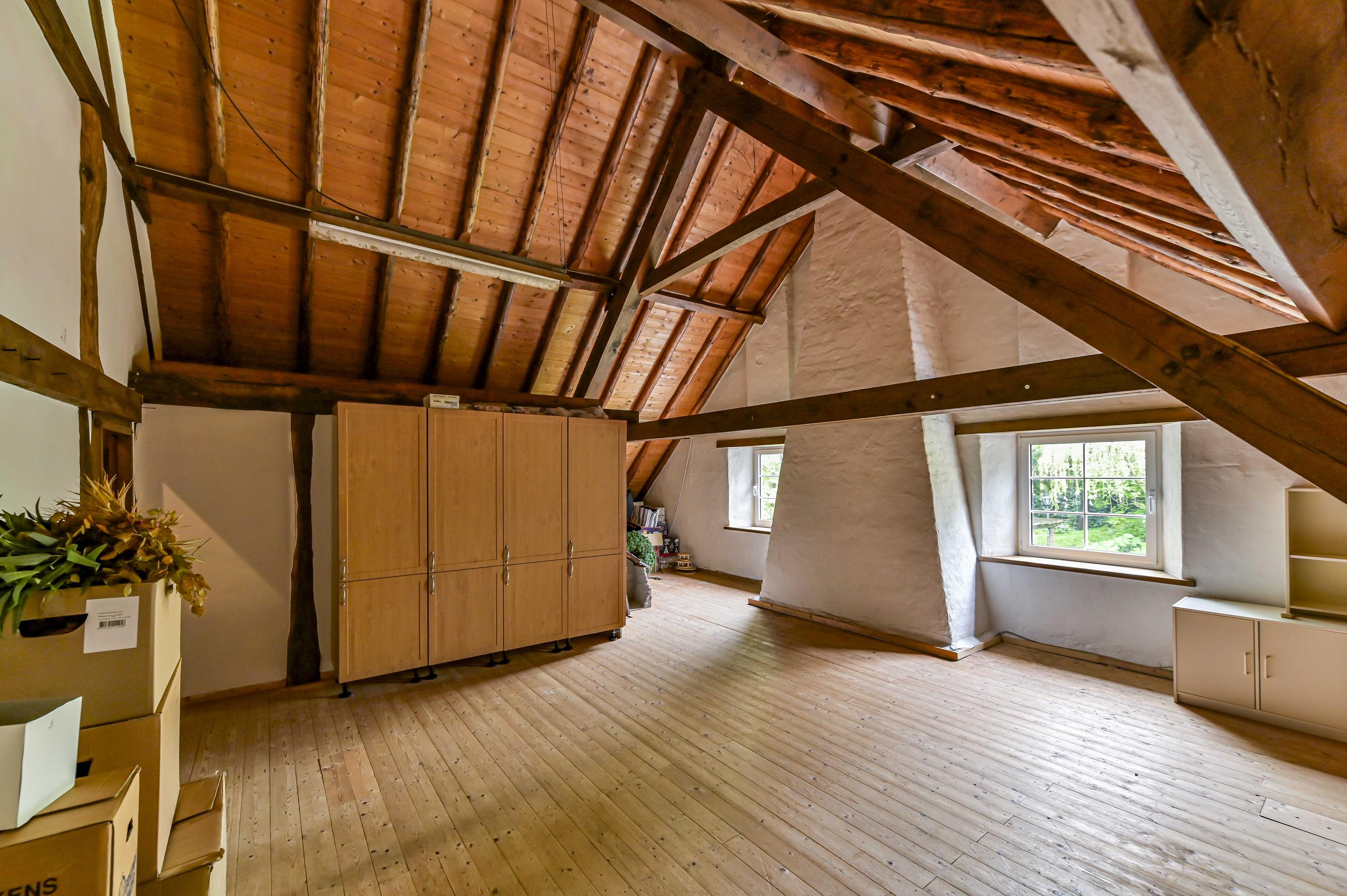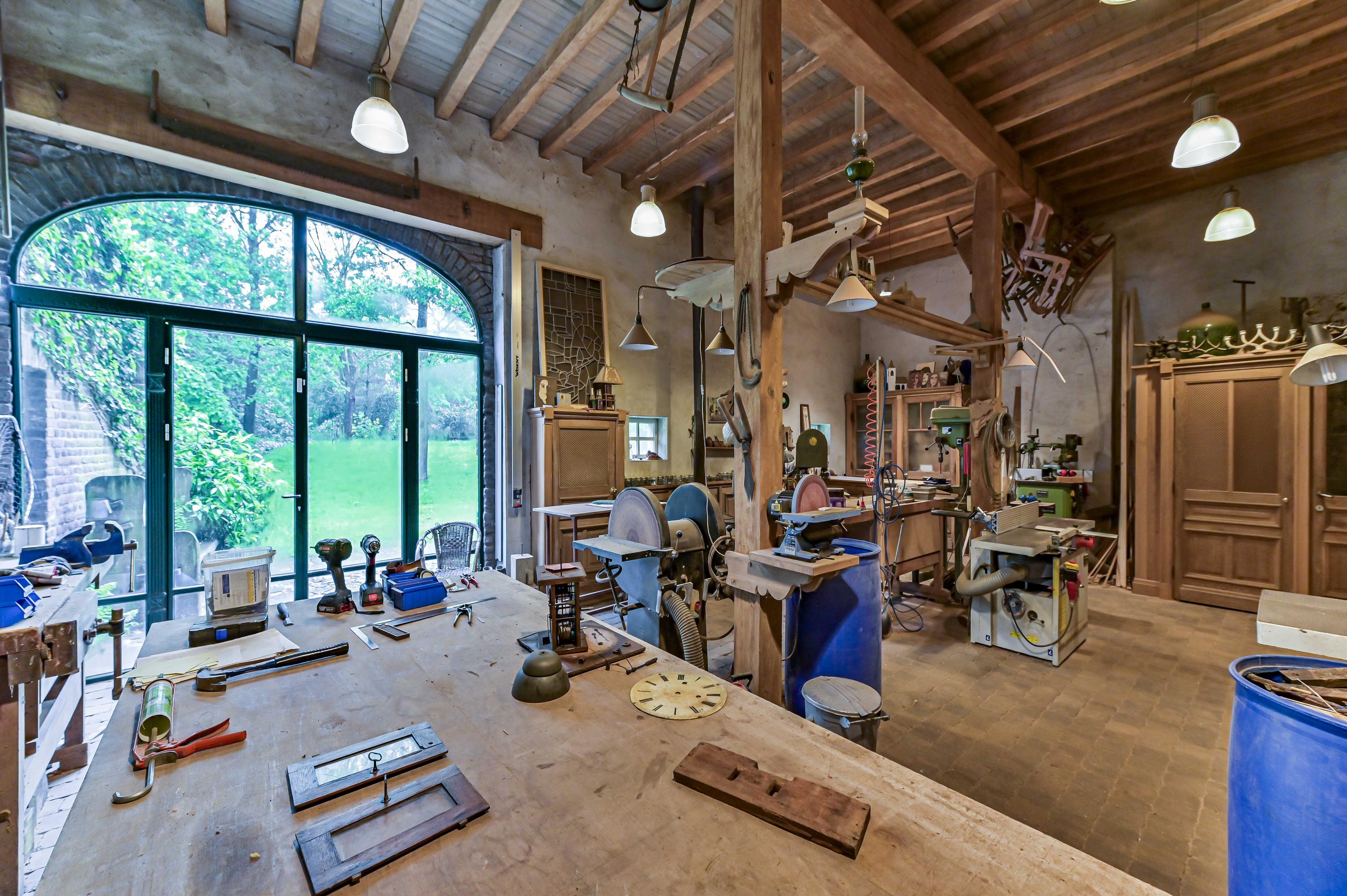 La fonctionnalité est sublimée par un garage à haut plafond et un atelier entièrement équipé, tous deux accessibles par un portail électrique privé. Les équipements contemporains tels que la ventilation mécanique, le chauffage central et la climatisation s’intègrent harmonieusement dans le rythme intemporel de la ferme. La mezzanine, les espaces en soupente et le vaste grenier promettent de belles possibilités d’aménagement.