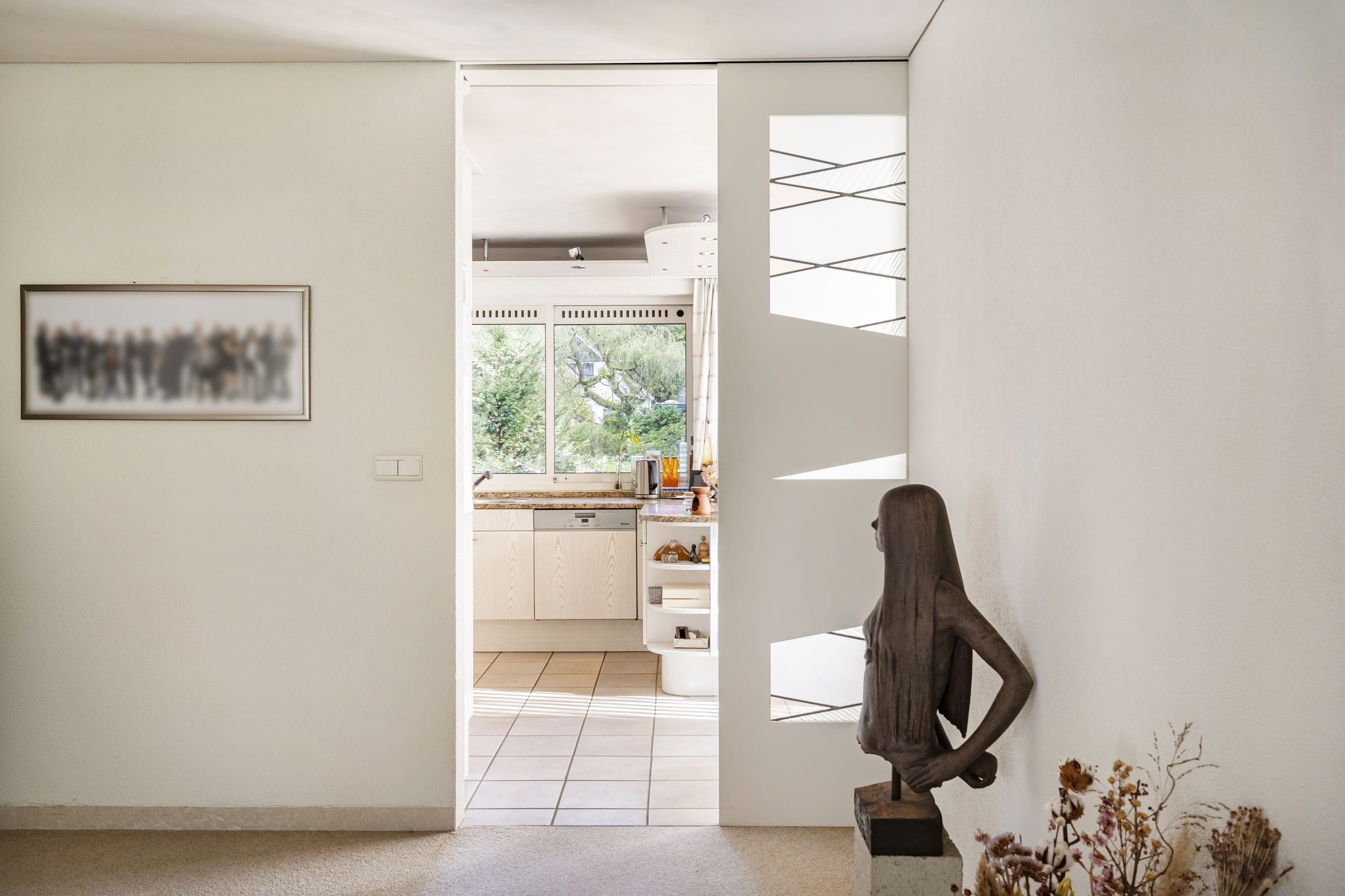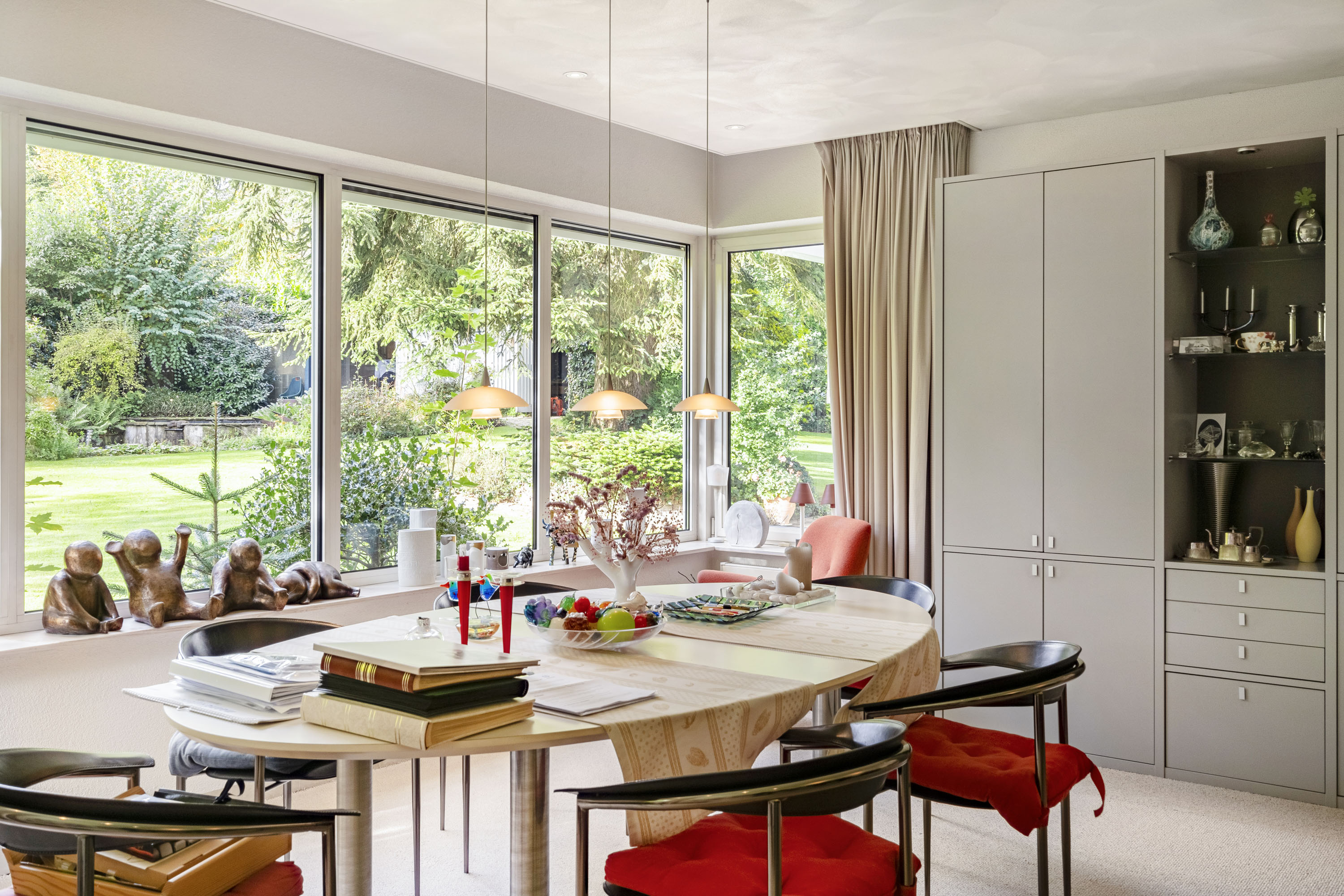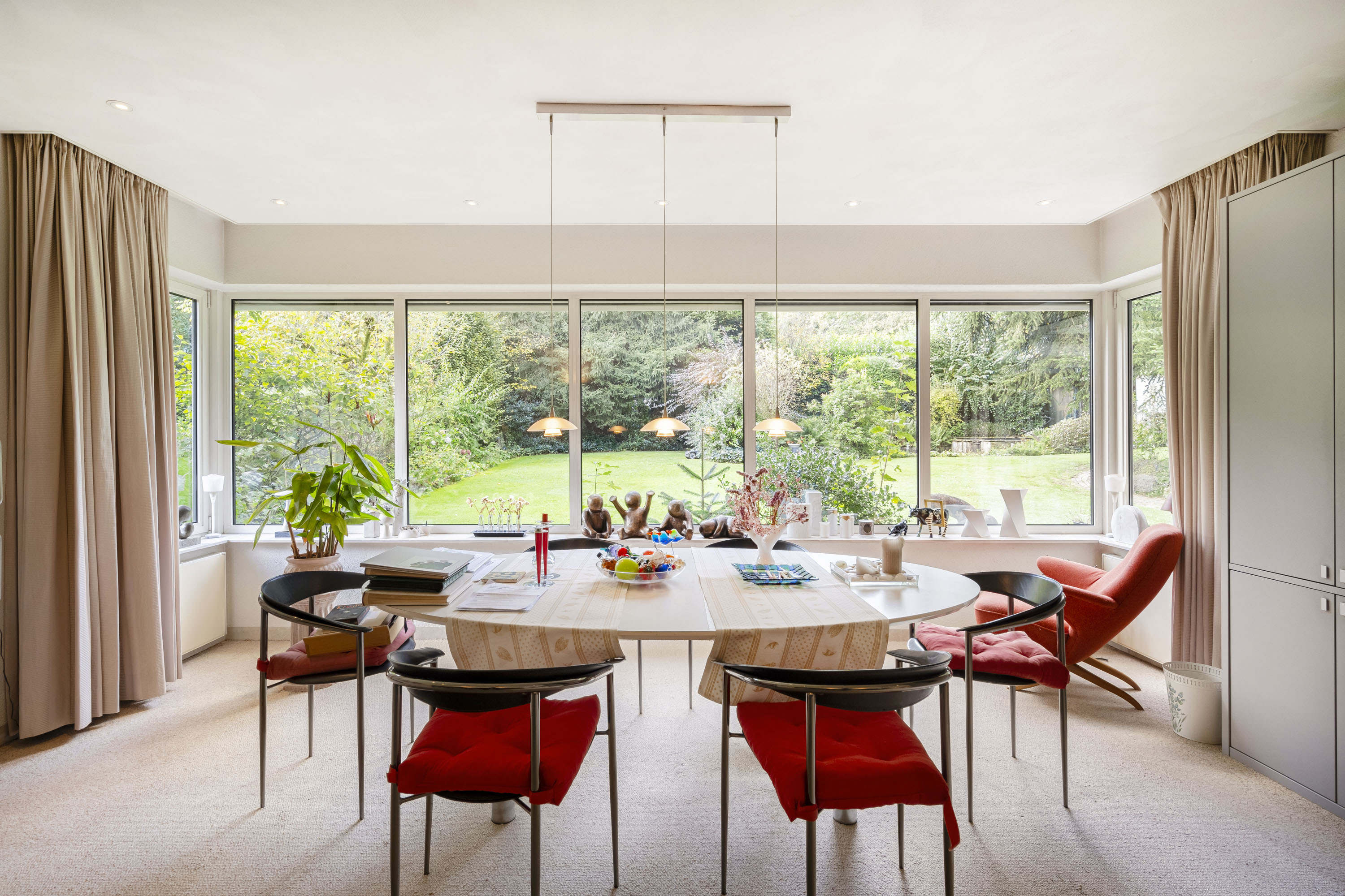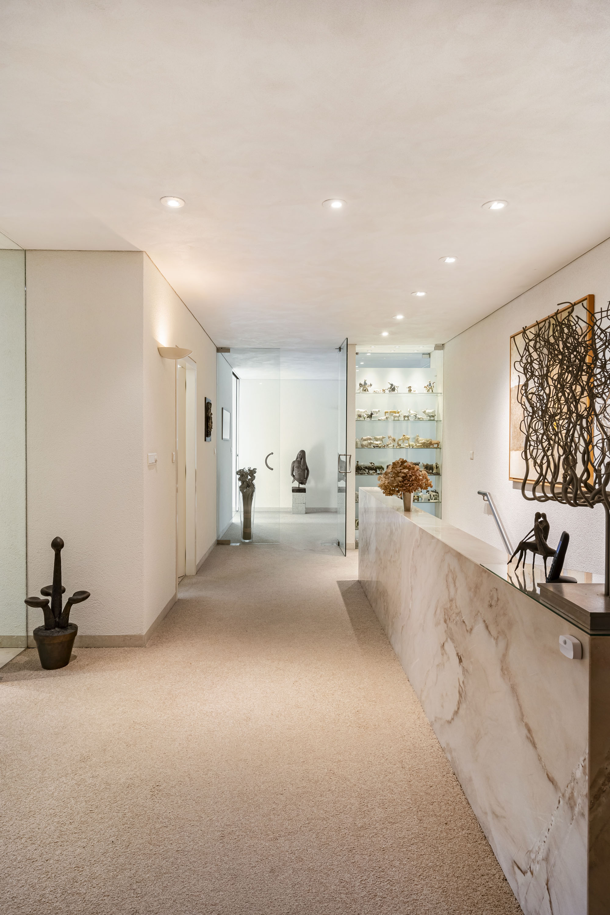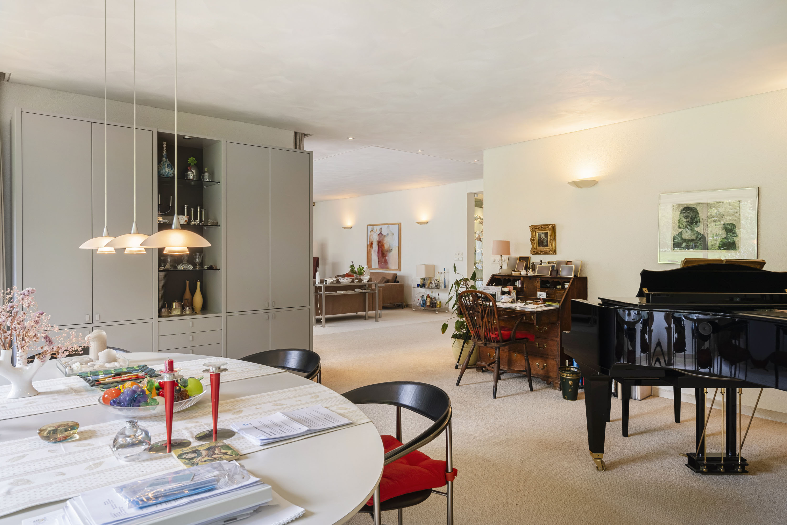 La disposition intelligente comprend un grand salon, une salle à manger tournée vers le jardin, un bureau ainsi qu’une cuisine ouverte attenante à une buanderie équipée d’un monte-plat discret. De belles portes coulissantes permettent l’équilibre idéal entre ouverture et intimité. La piscine intérieure, dotée d’un système de nage à contre-courant et de portes vitrées donnant accès au jardin, incarne le bien-être à domicile. La suite parentale dispose de la climatisation et d’un accès direct au jardin, tandis que deux salles de bains sont équipées d’une baignoire et d’une douche.