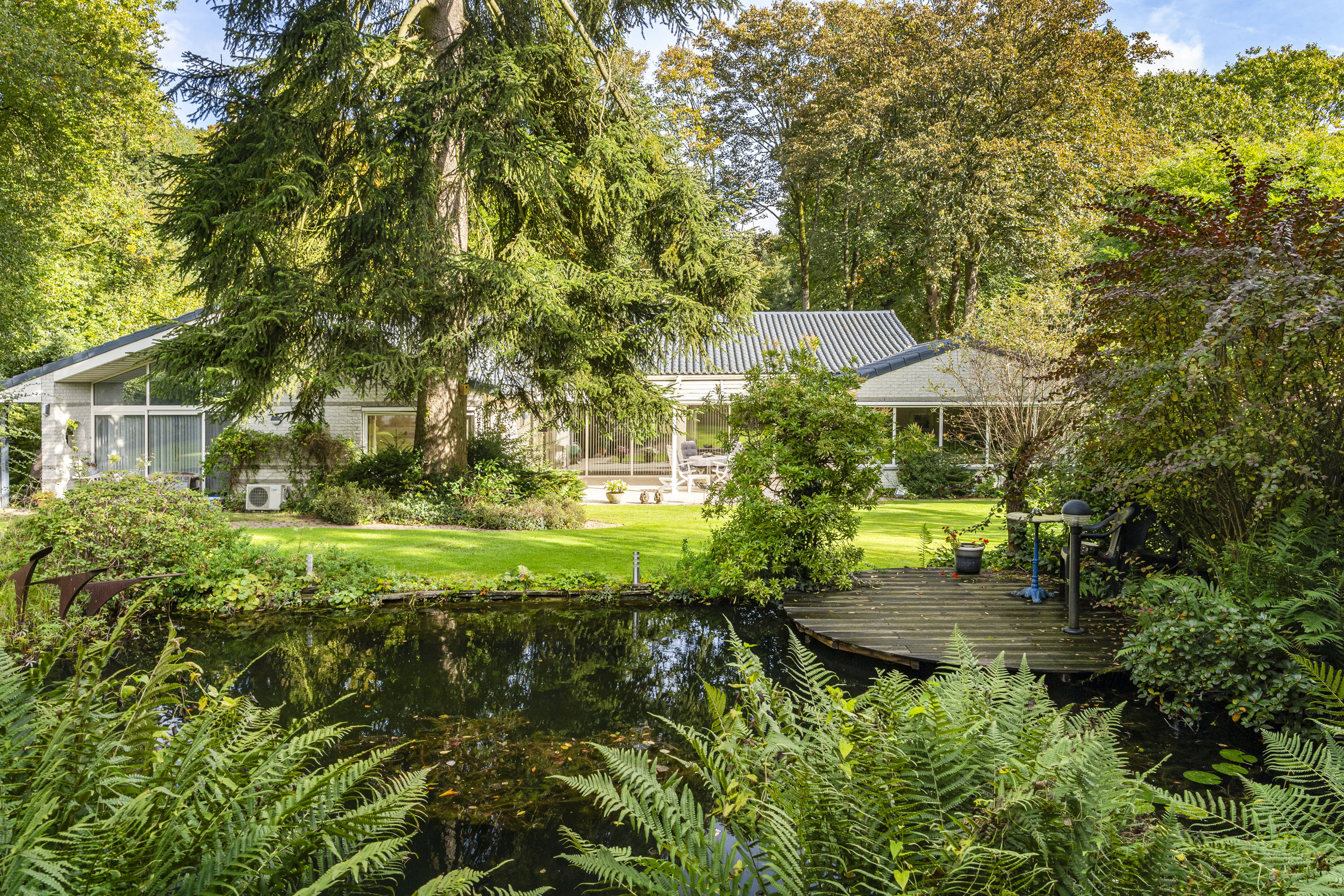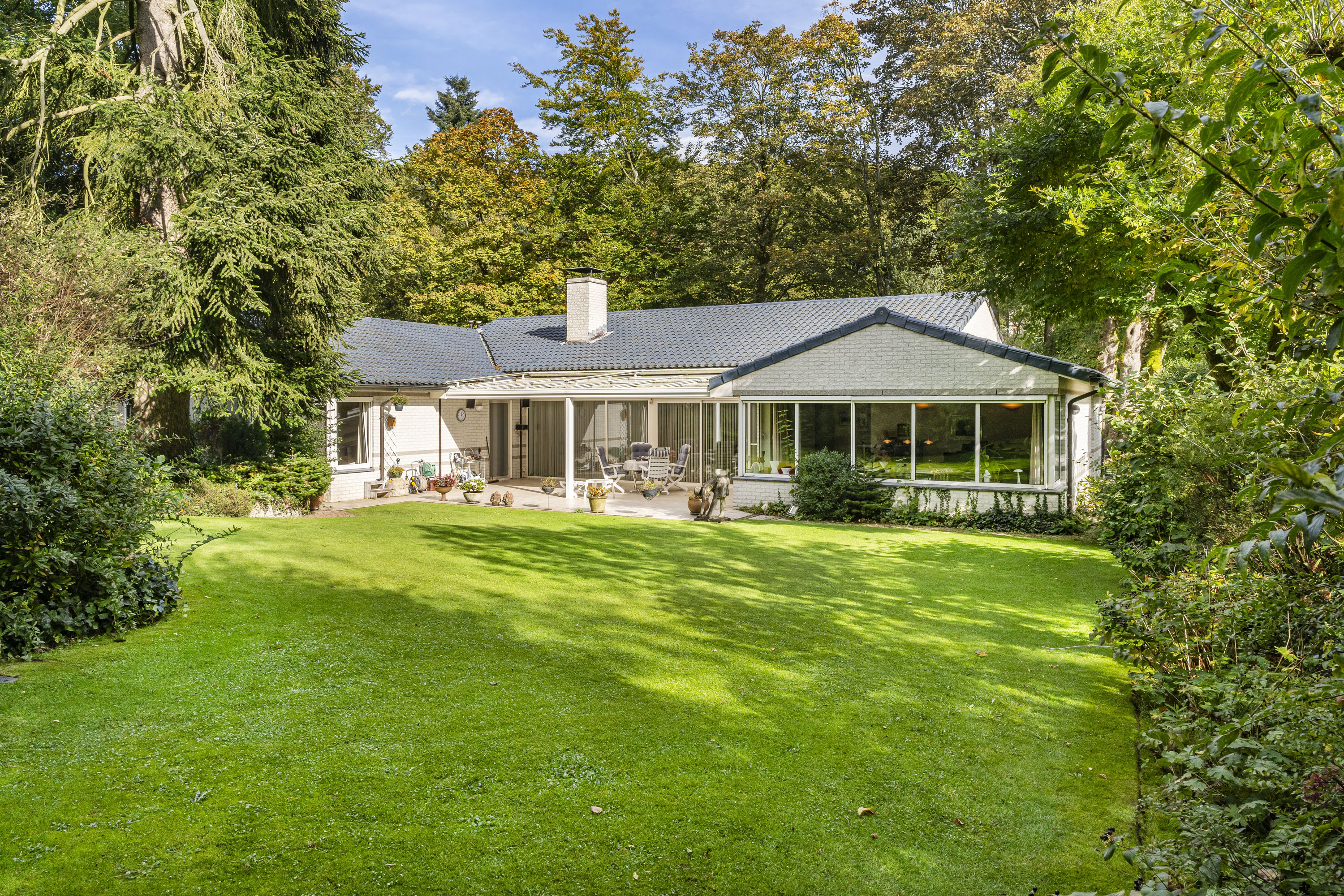 La Villa Velp avec piscine intérieure se trouve en lisière de la réserve naturelle du Posbank, offrant 350 m² habitables et une intimité totale au cœur d’un jardin paysager mature de 1 911 m². Cette villa de quatre chambres allie confort et architecture, donnant la part belle à la lumière naturelle et à une conception moderne, fluide et élégante. Les vastes pièces de vie s’ouvrent par de larges façades vitrées sur un jardin en légère pente, assurant une continuité élégante entre intérieur et extérieur.