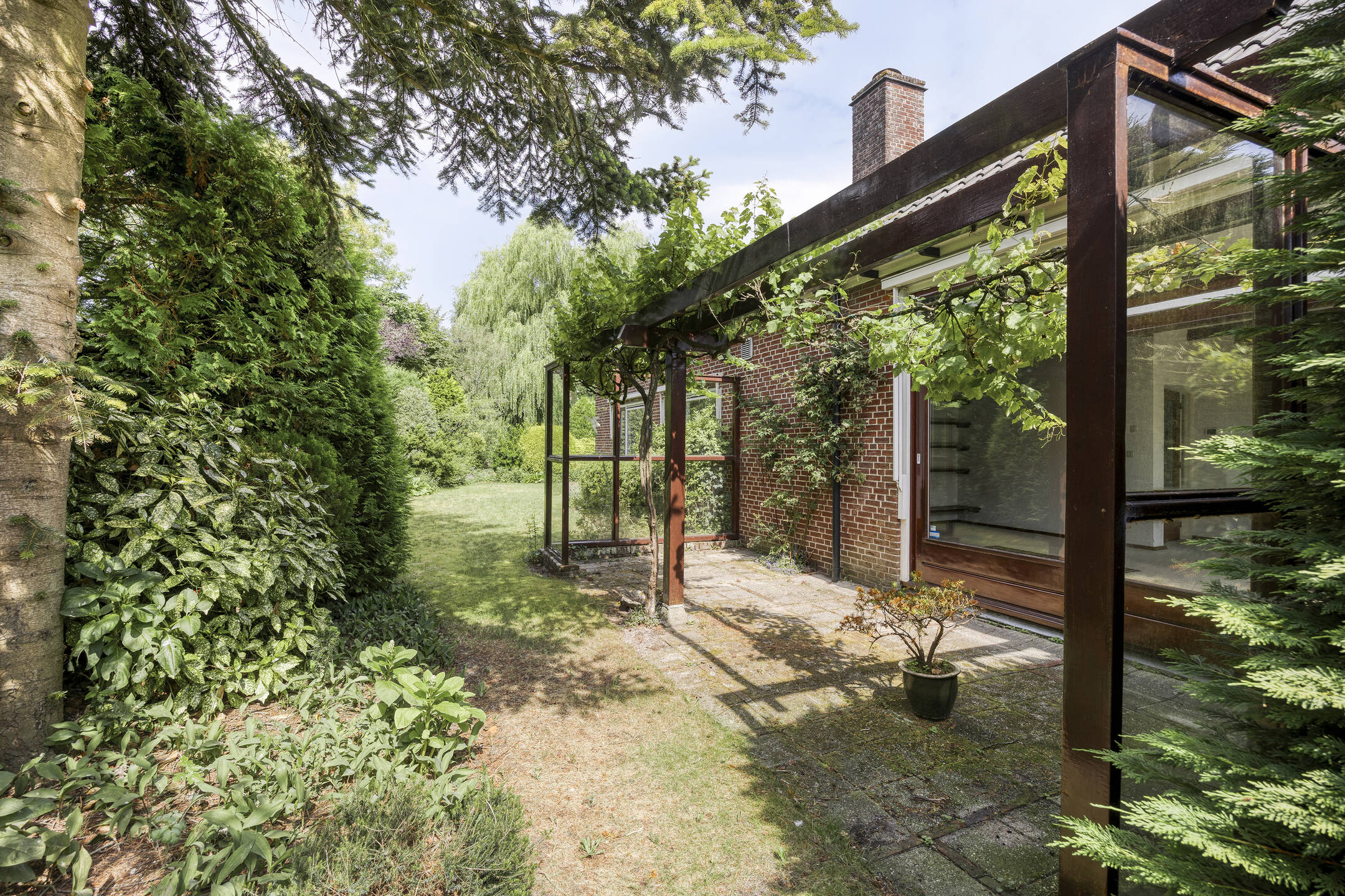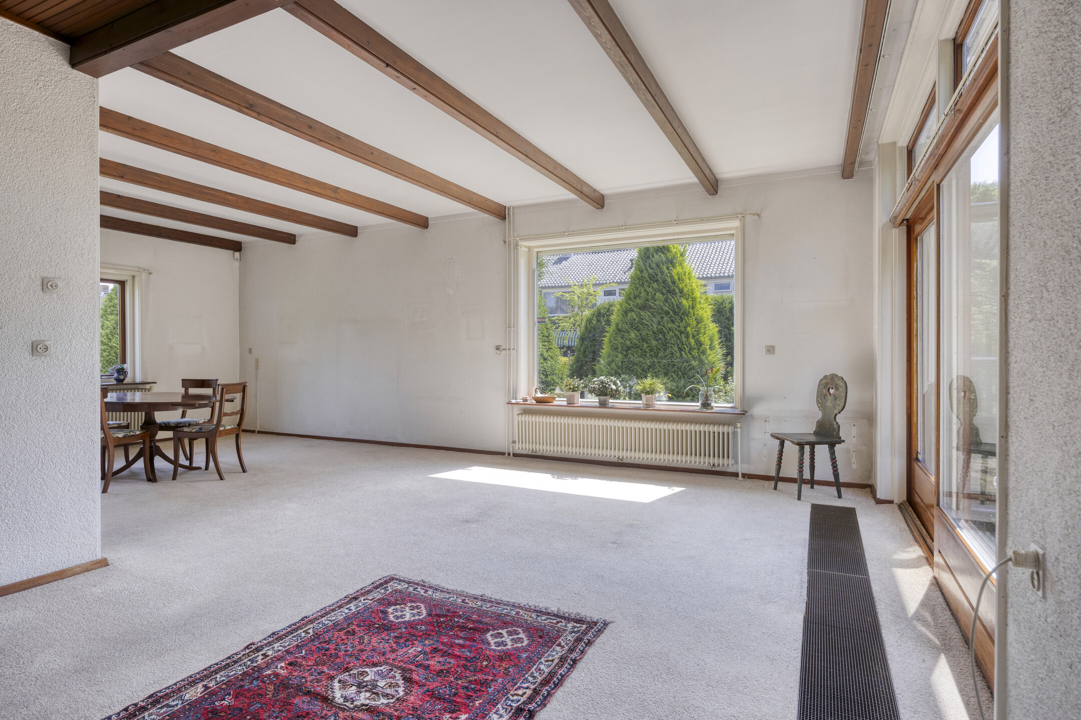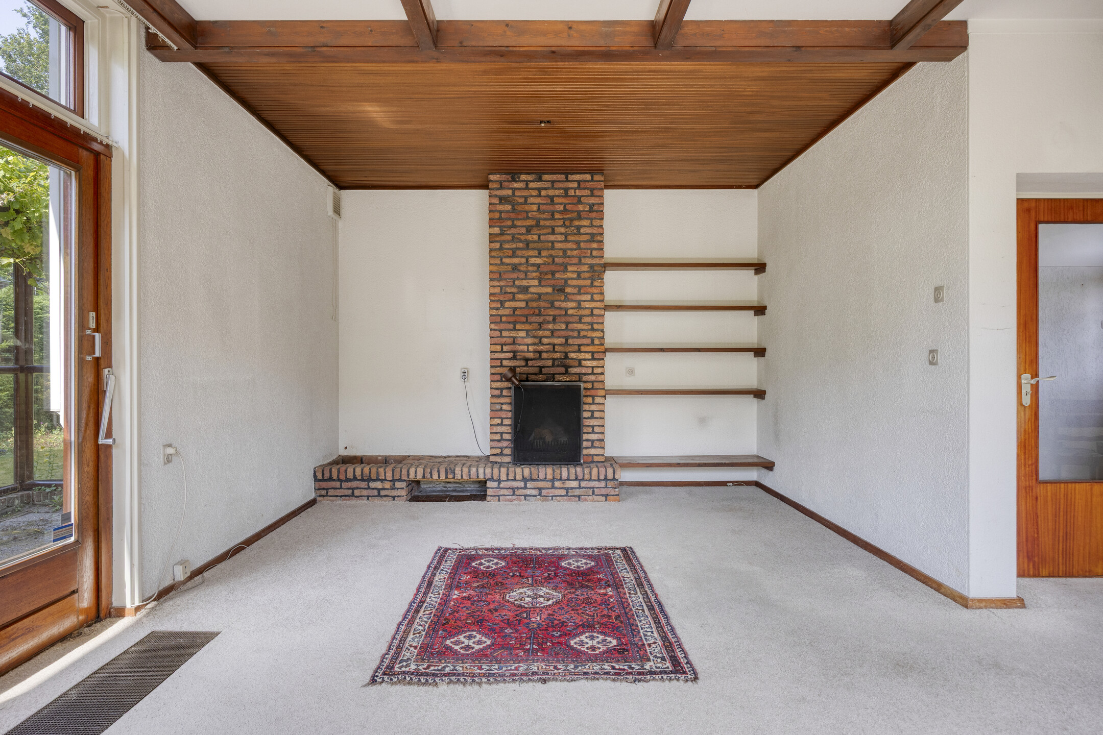 De linkerzijde van de hal geeft toegang tot een separaat toilet met fontein, de meterkast en tot de woonkamer. De woonkamer is ruim en licht, met grote raampartijen, een originele vaste kast, een open haard en een schuifpui naar de volgroeide voor-, zij- en achtertuin.