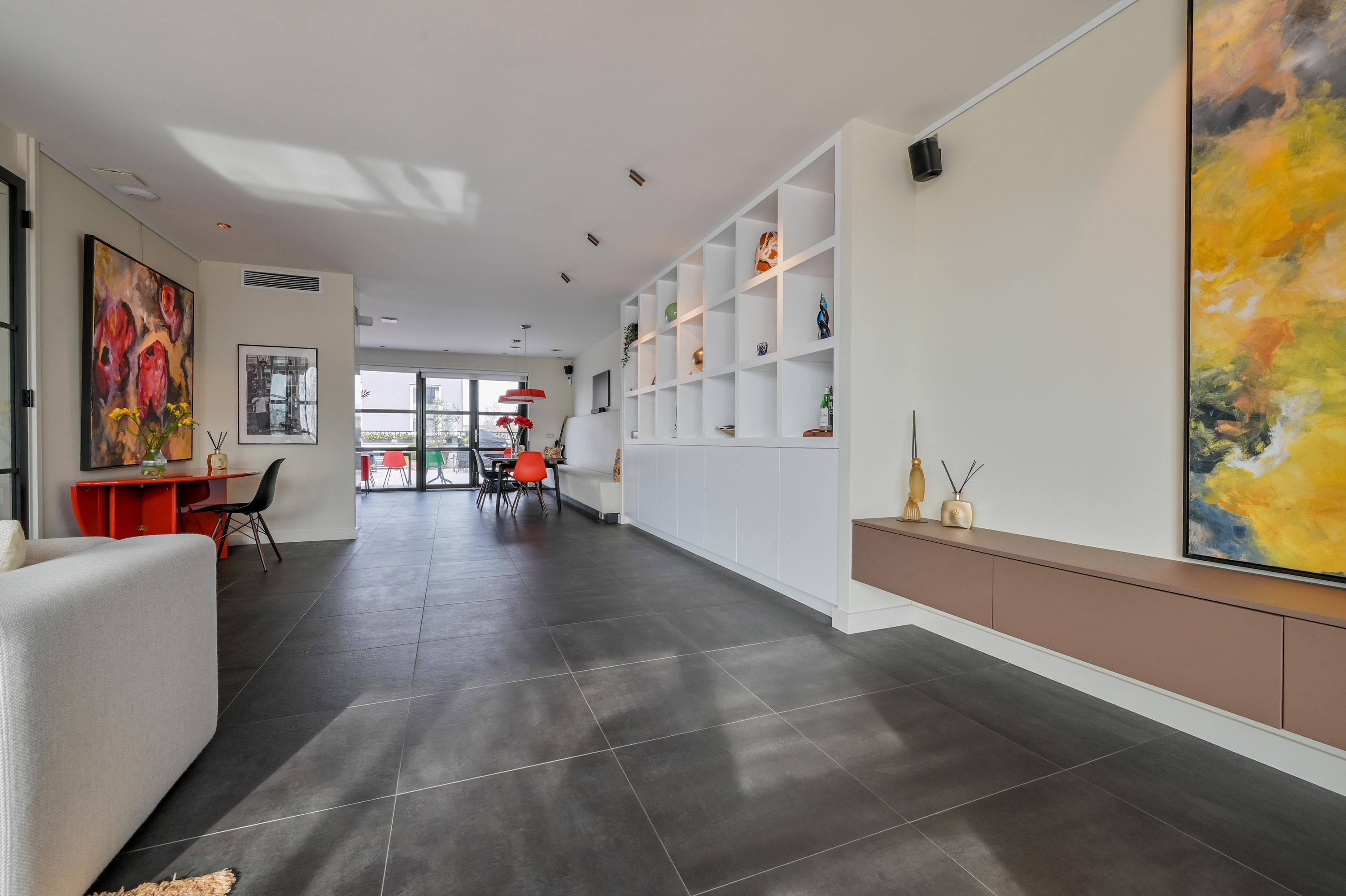 Via de oprit bereikt u de voordeur en de ruime hal, voorzien van garderobekast, toilet en trap naar de verdieping. De woonkamer ligt aan de voorzijde van de woning en biedt een adembenemend uitzicht over de Amstel. Grote raampartijen laten het licht binnenstromen, terwijl het gemotoriseerde gordijn via een app te bedienen is. Tevens hangen hier ook Luxaflex Silhouttes (gemotoriseerd, met stand geheugen). De stijlvolle zwarte plavuizenvloer met vloerverwarming, ingebouwde dimbare spots van Modular en de grote designkasten maken het geheel af.