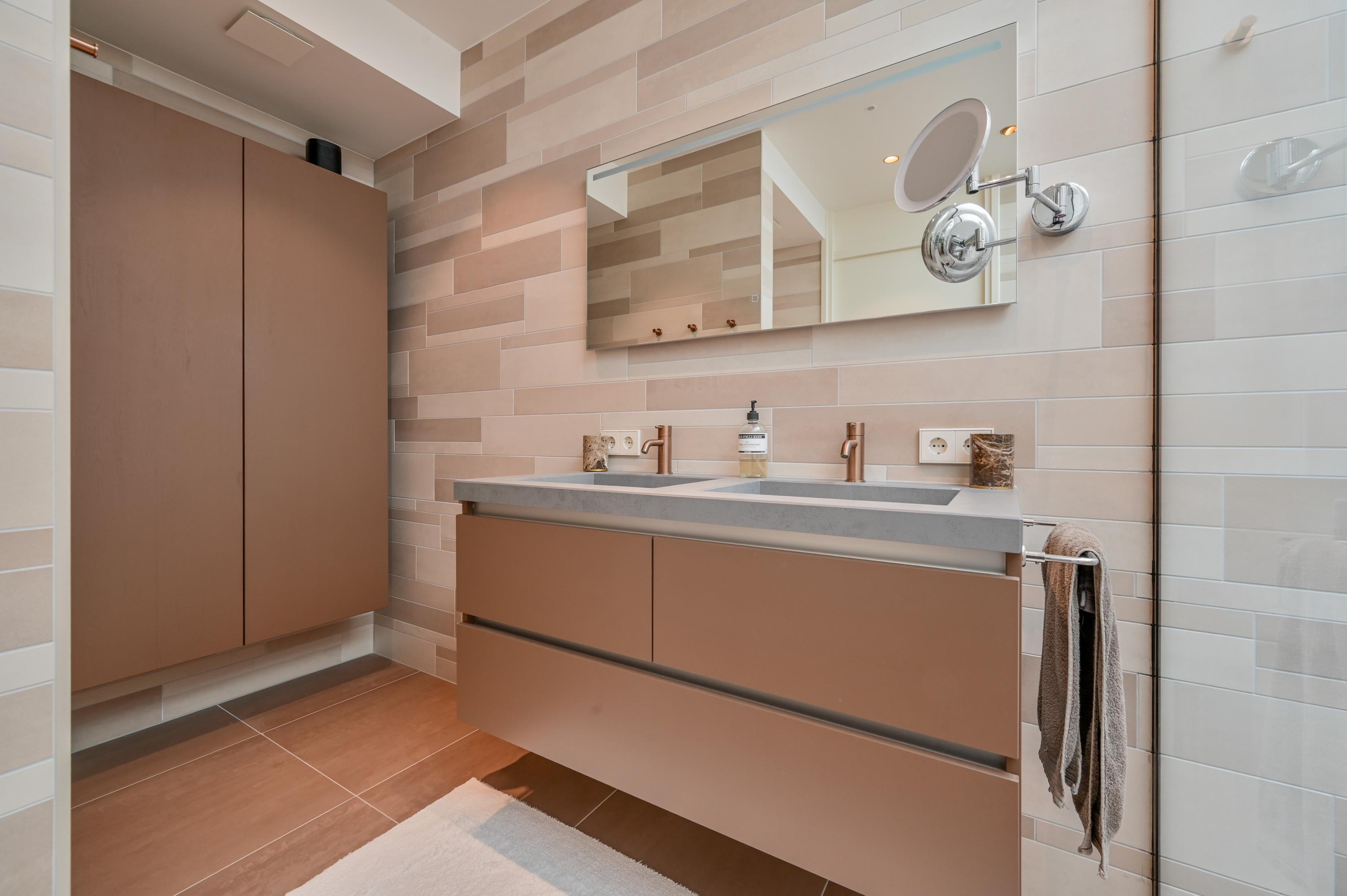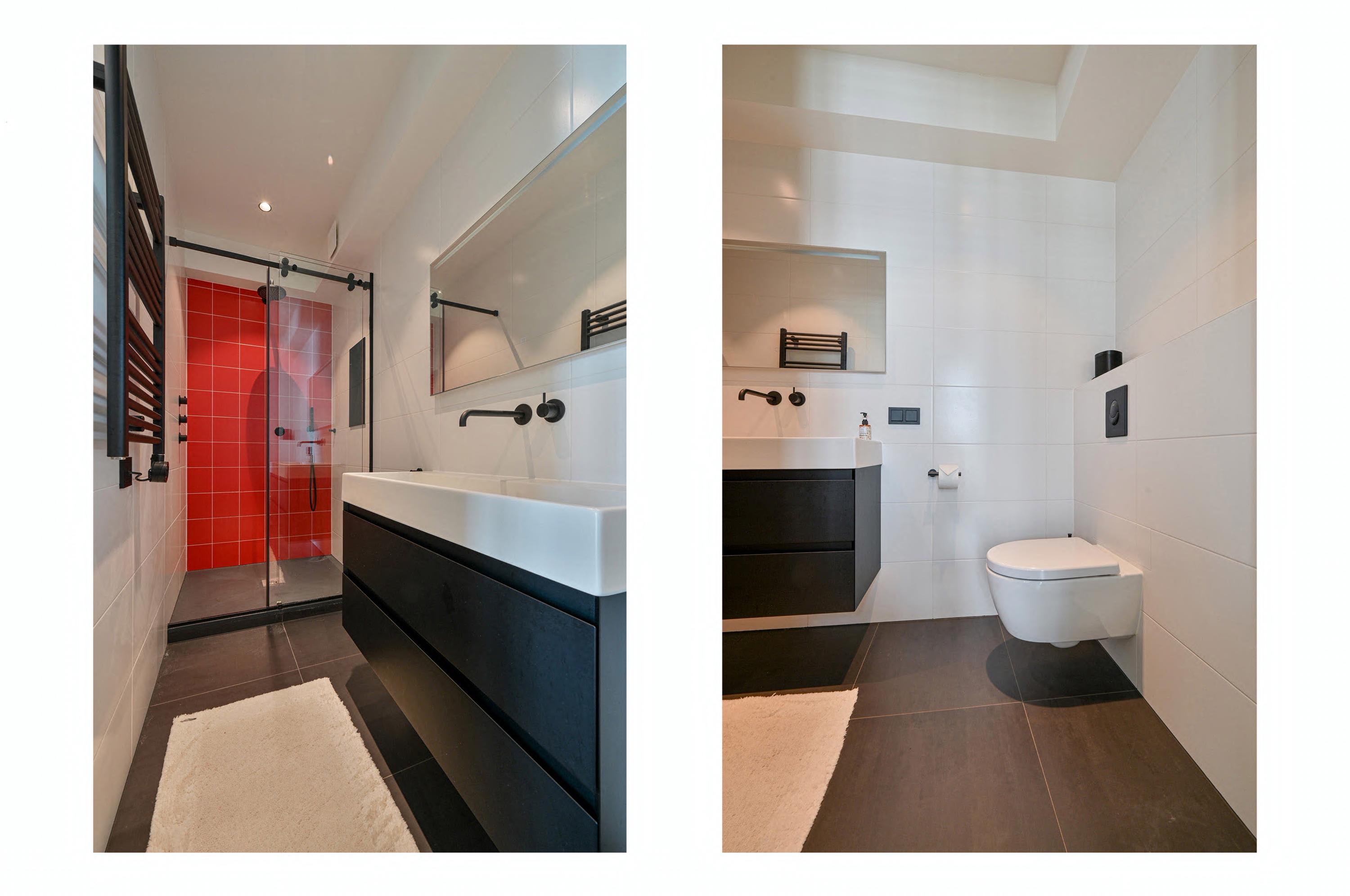 Via de trap in de hal bereikt u de eerste verdieping, waar vier royale slaapkamers zijn gesitueerd. De twee slaapkamers aan de achterzijde zijn met elkaar verbonden door een open doorgang en beschikken over een eigen badkamer met toilet, een ruime wastafel, een moderne douche en handdoekenradiator. Net als in de rest van de woning is hier ook airconditioning aanwezig, voor optimaal comfort het hele jaar door.