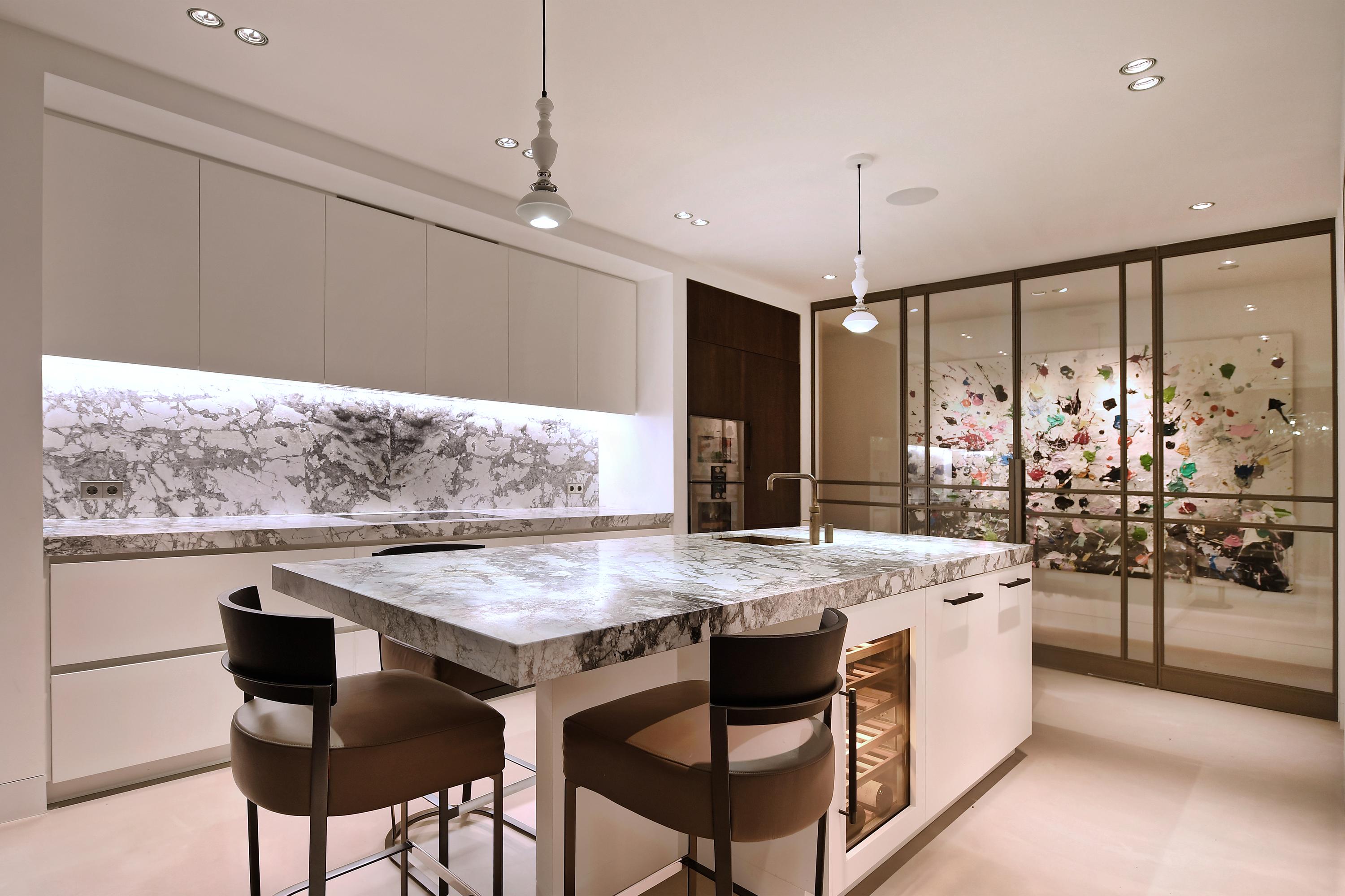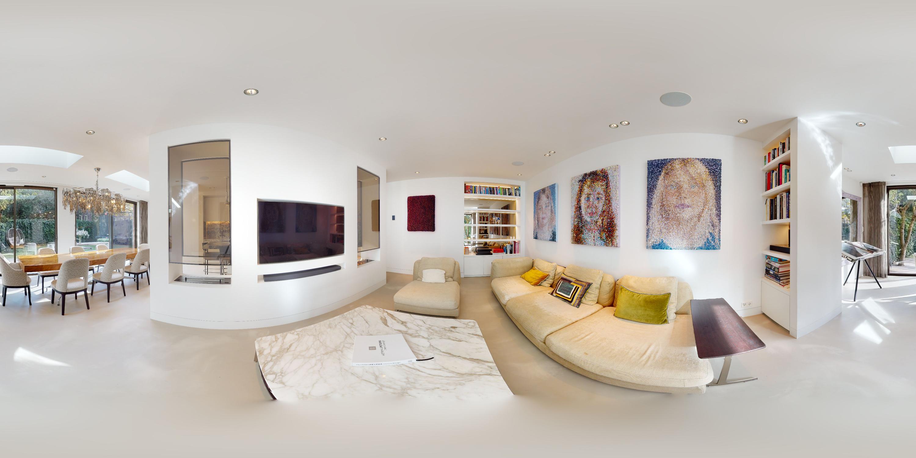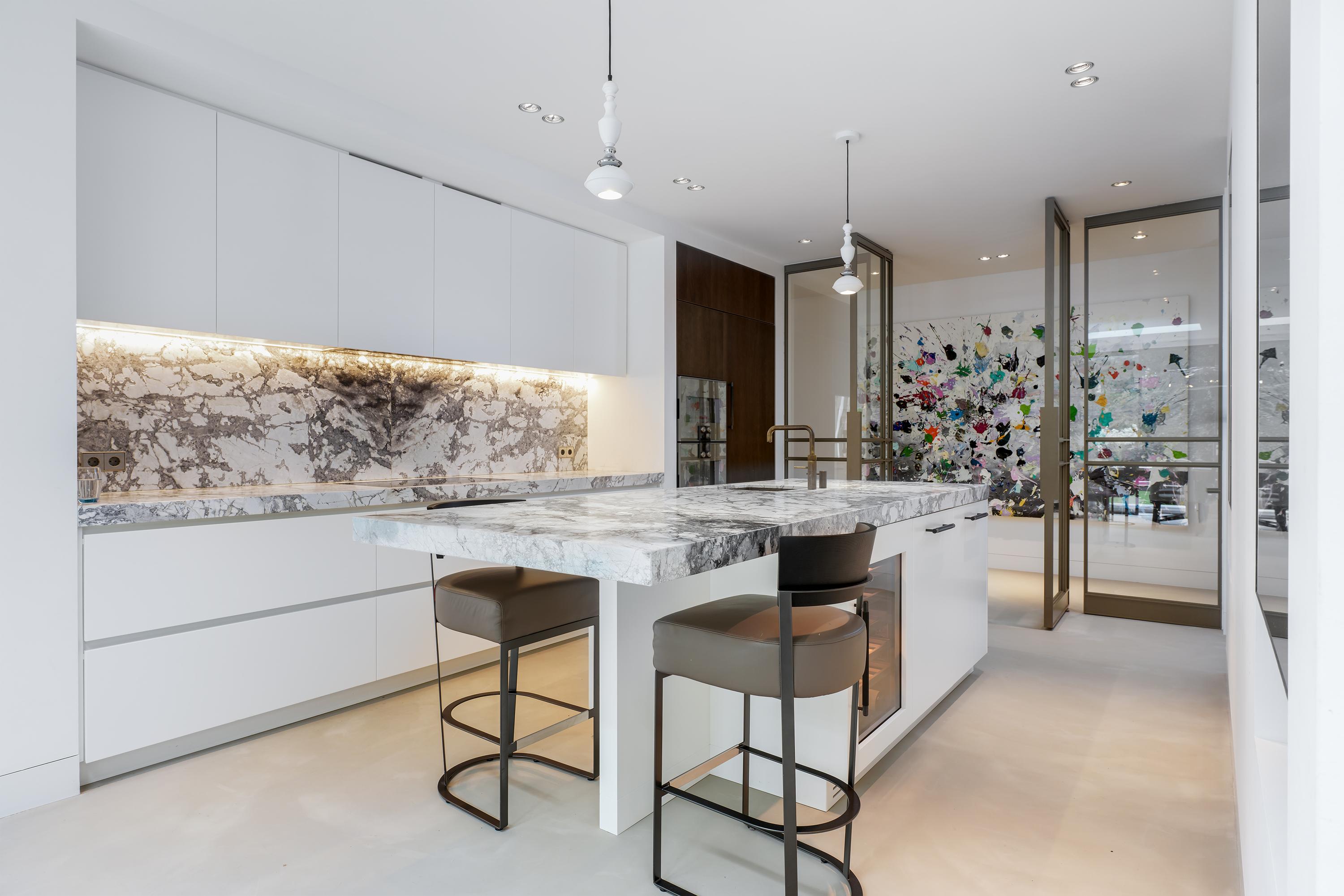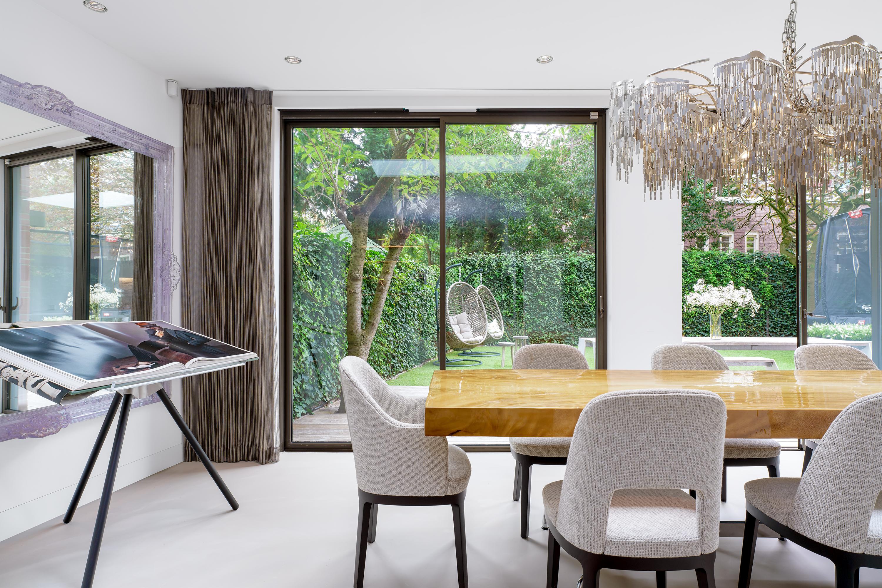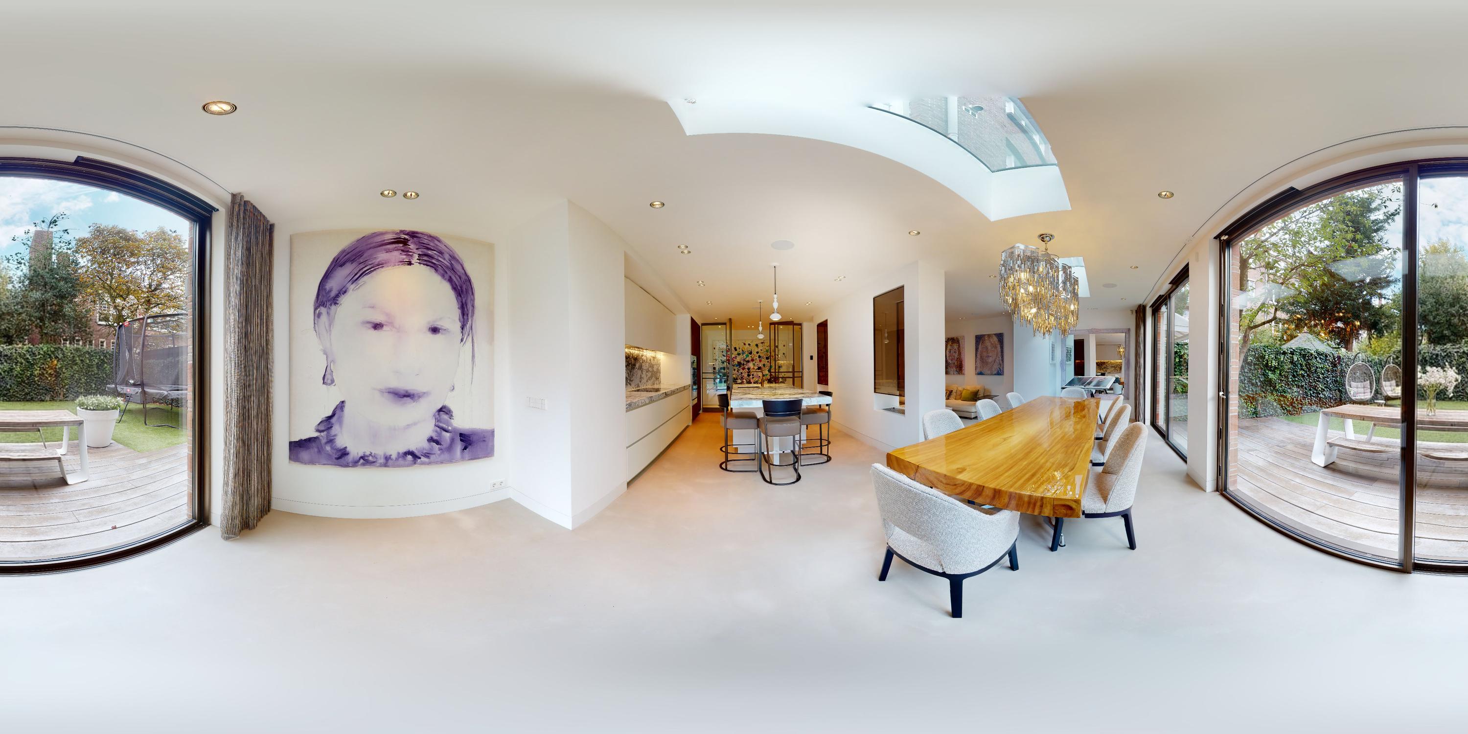 Aan de achterzijde van de woning, de ruime living met prachtige woonkeuken. Deze luxe uitgevoerde keuken is werkelijk van alle gemakken voorzien: een spoeleiland uitgerust met een Quooker kraan en een klimaatkast, een oven, combi stoomoven, warmhoudplaat, koelkast, vriezer, vaatwasser, inductiekookplaat en een ingebouwde afzuigunit. Alle inbouwapparatuur in deze keuken is van het merk Gaggenau. De ware eyecatcher is de speciale nis met uittrekbare unit voor de koffiemachine. Twee sfeervolle ethanol haarden dienen als scheiding tussen de keuken en het woonkamer gedeelte. De living is voorzien van meerdere inbouwkasten. Het eetkamergedeelte, gelegen in de uitbouw, grenst aan de keuken en het woonkamergedeelte en is voorzien van elektrische gordijnen. Lichtkoepels voorzien deze ruimte van bijzonder veel lichtinval. Middels de schuifpui heeft u toegang tot de riante achtertuin, gelegen op het zuid oosten.