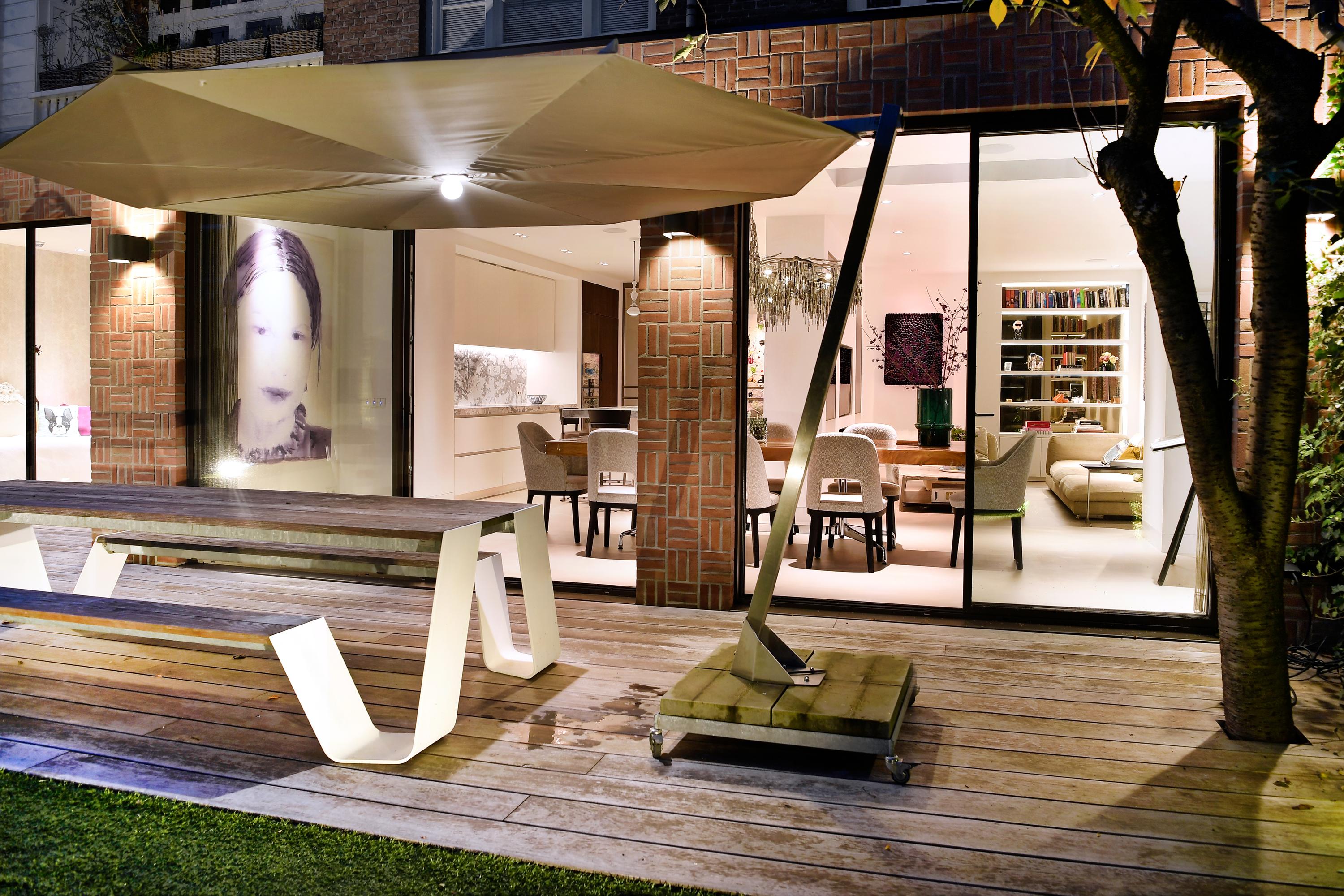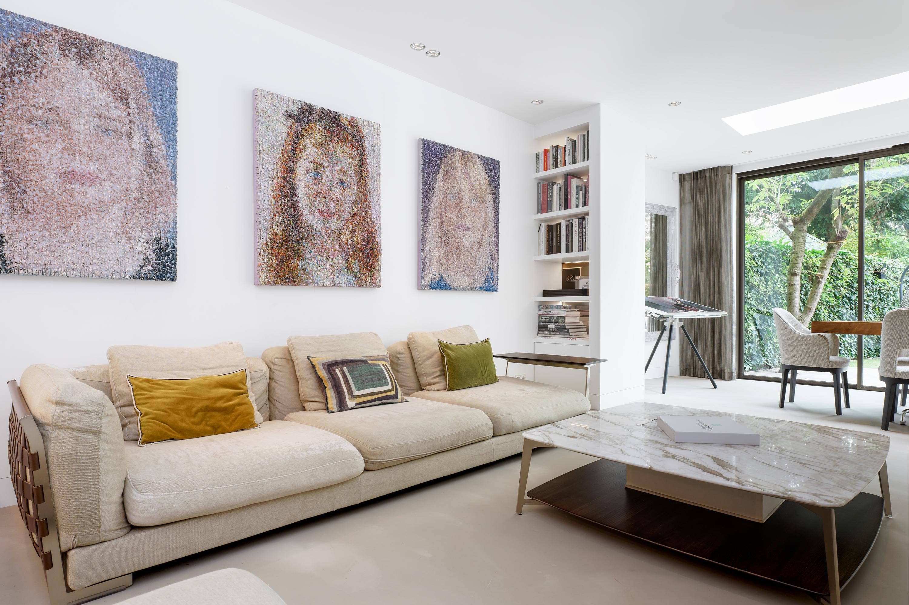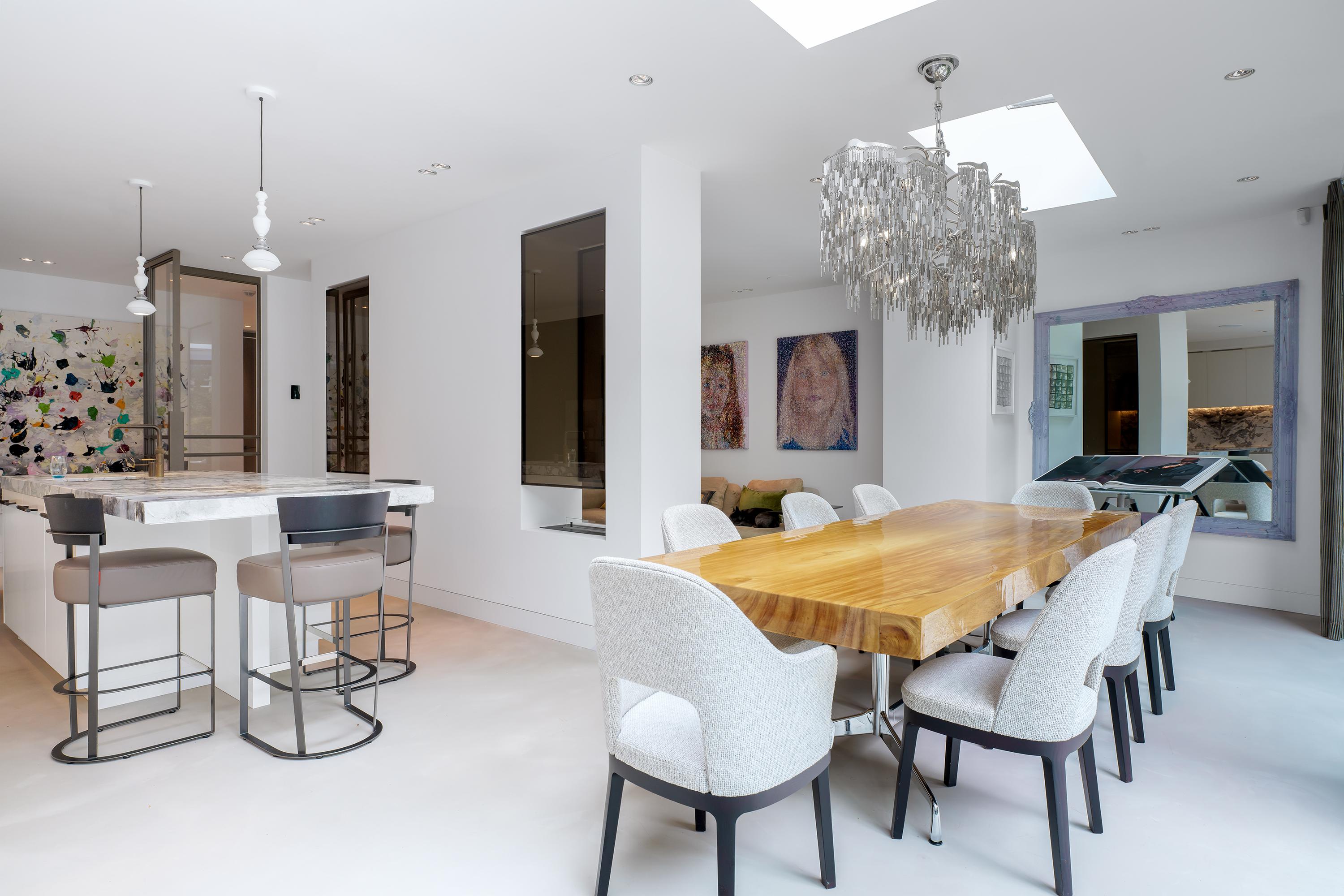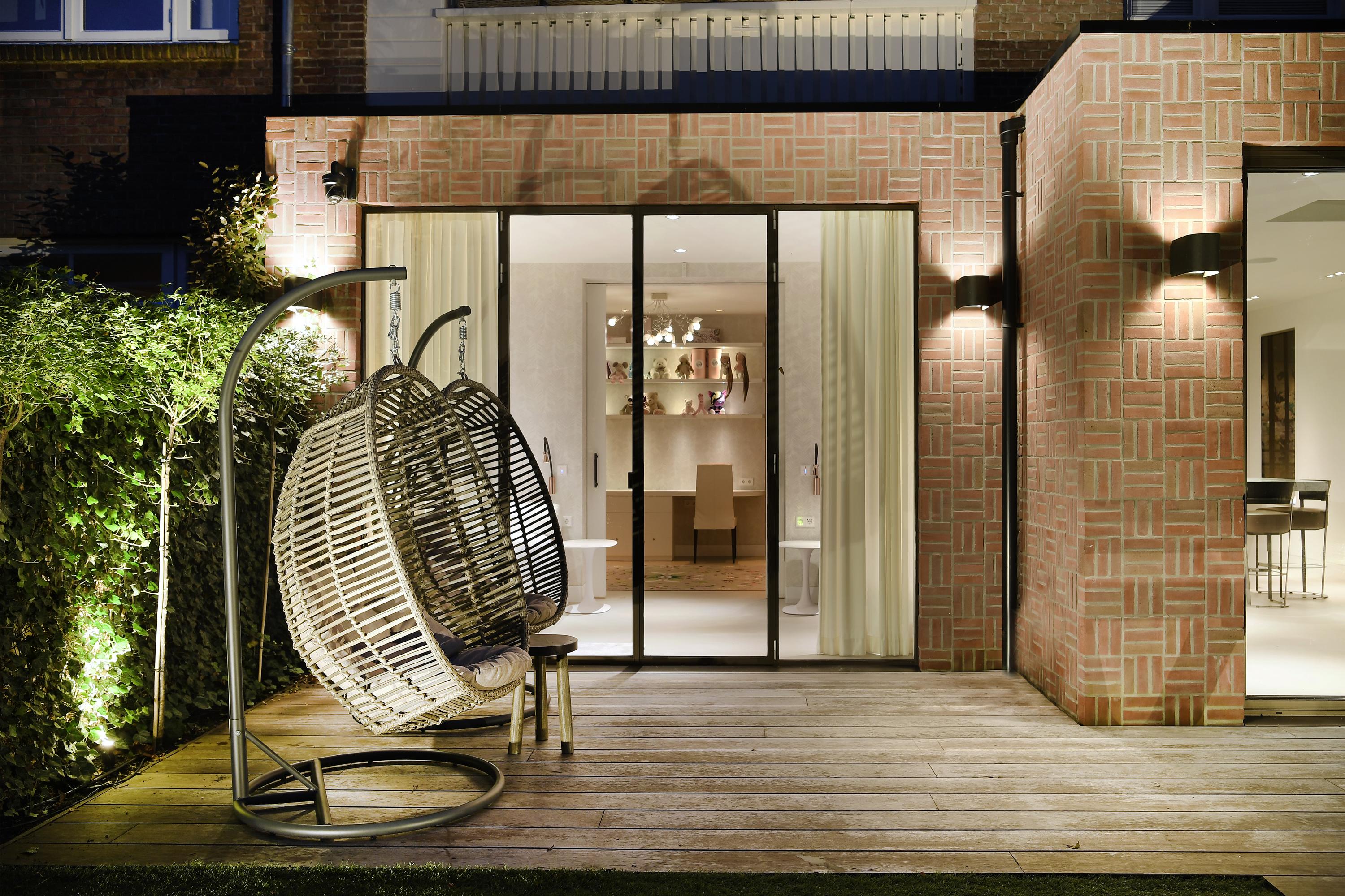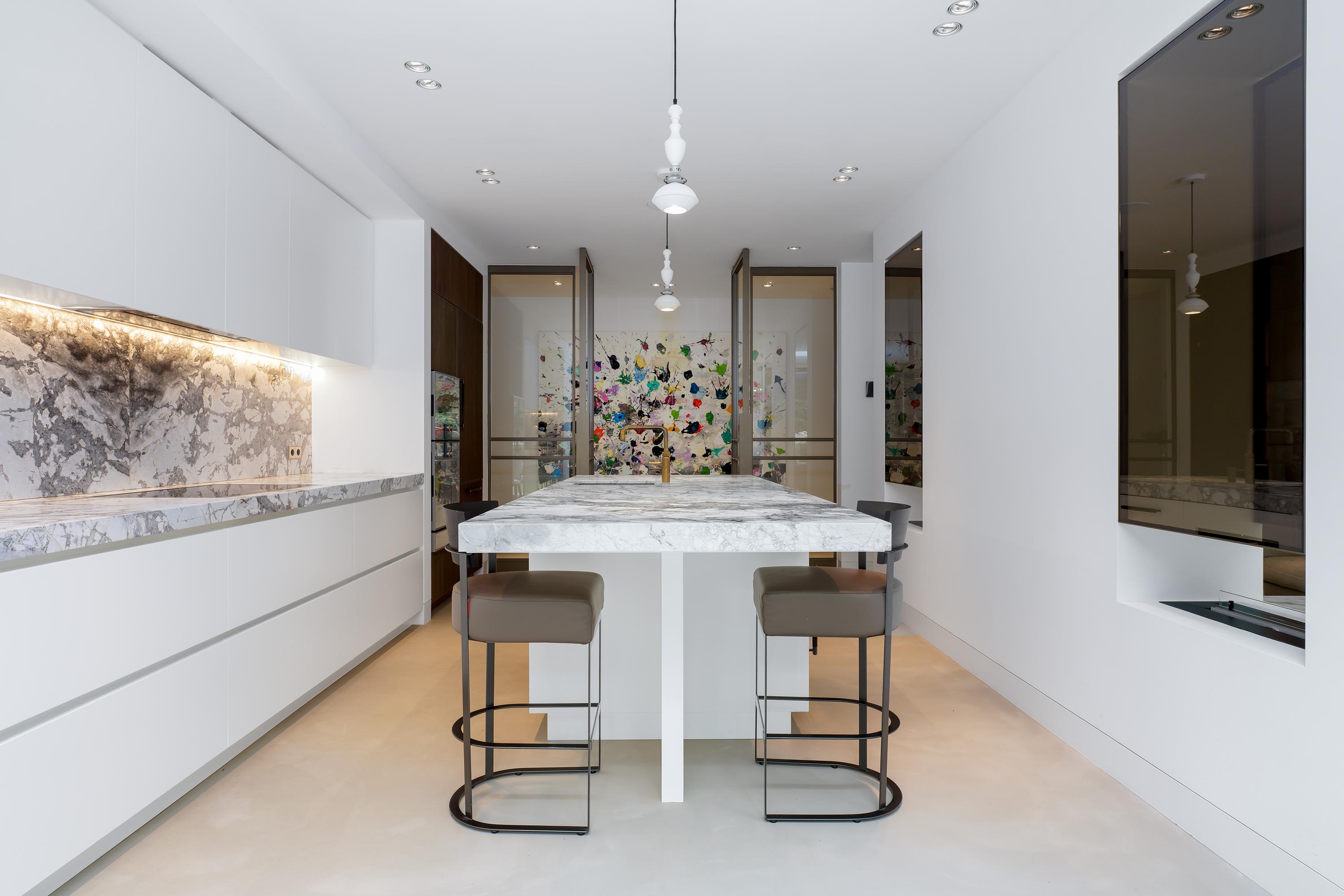 Aan de achterzijde van de woning, de ruime living met prachtige woonkeuken. Deze luxe uitgevoerde keuken is werkelijk van alle gemakken voorzien: een spoeleiland uitgerust met een Quooker kraan en een klimaatkast, een oven, combi stoomoven, warmhoudplaat, koelkast, vriezer, vaatwasser, inductiekookplaat en een ingebouwde afzuigunit. Alle inbouwapparatuur in deze keuken is van het merk Gaggenau. De ware eyecatcher is de speciale nis met uittrekbare unit voor de koffiemachine. Twee sfeervolle ethanol haarden dienen als scheiding tussen de keuken en het woonkamer gedeelte. De living is voorzien van meerdere inbouwkasten. Het eetkamergedeelte, gelegen in de uitbouw, grenst aan de keuken en het woonkamergedeelte en is voorzien van elektrische gordijnen. Lichtkoepels voorzien deze ruimte van bijzonder veel lichtinval. Middels de schuifpui heeft u toegang tot de riante achtertuin, gelegen op het zuid oosten.