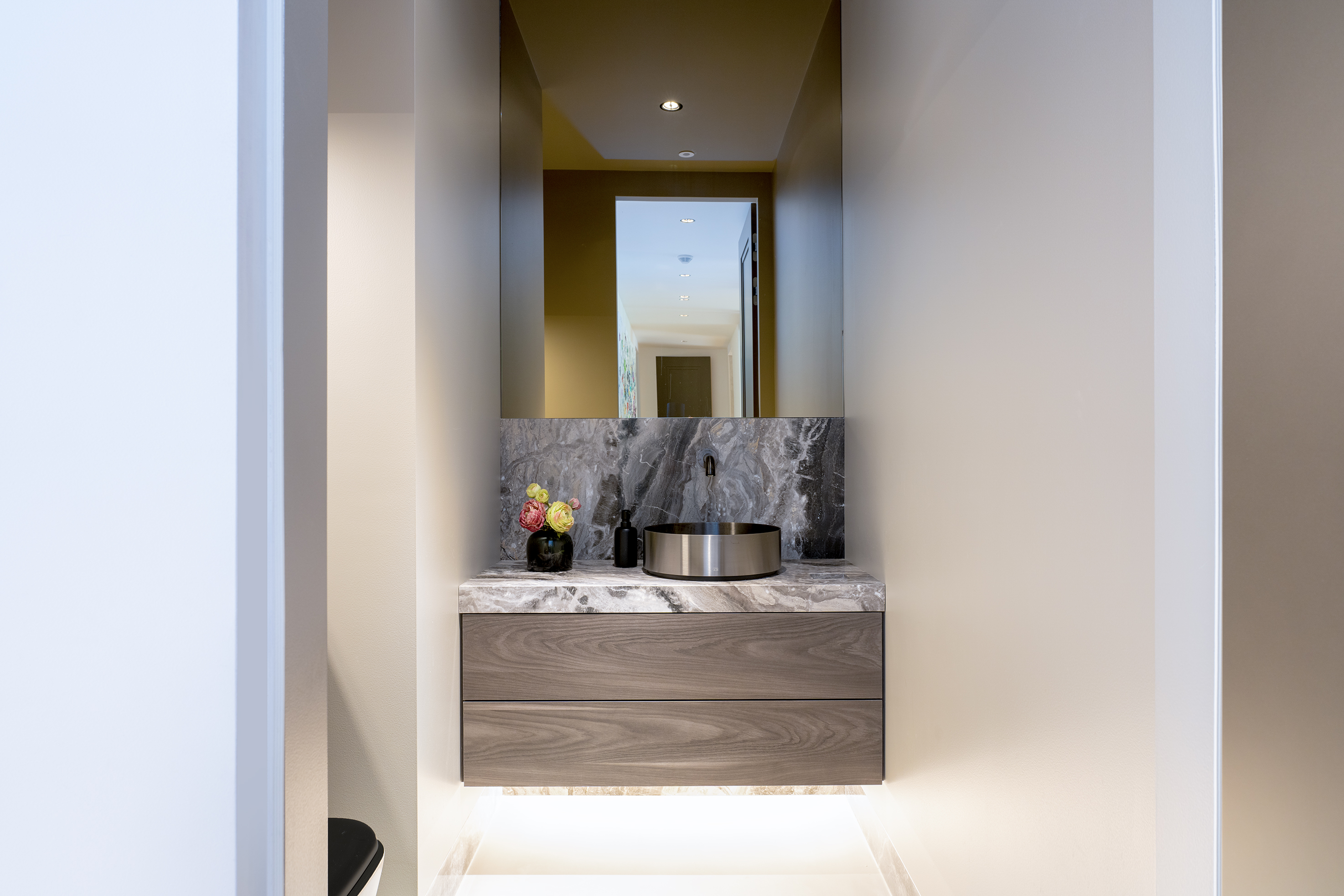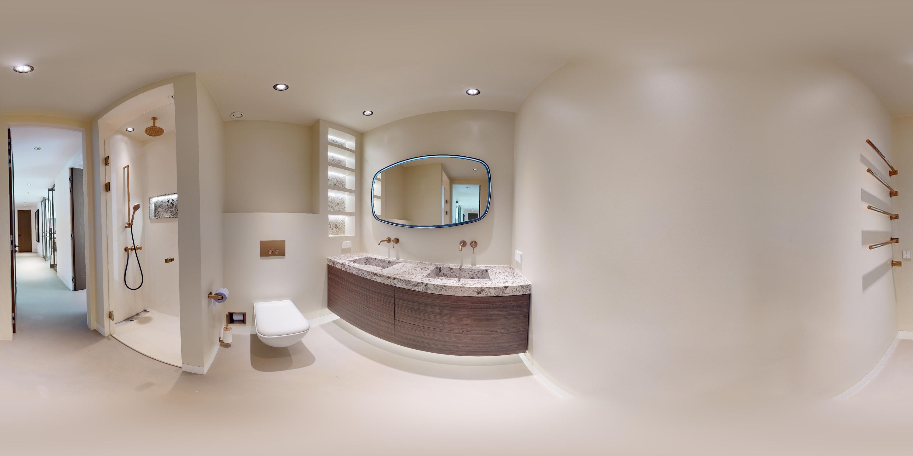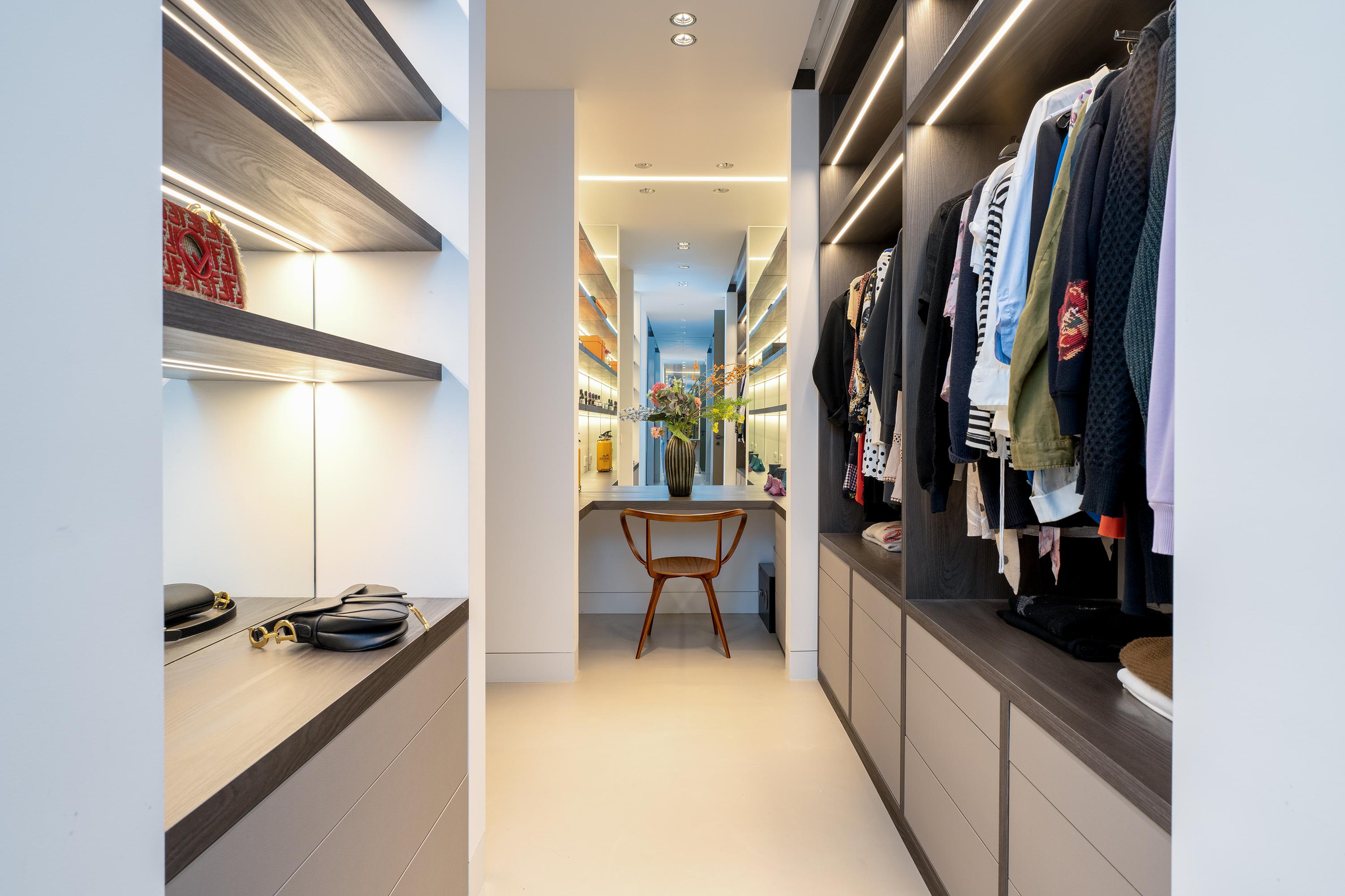 De master bedroom is aan de voorzijde van de woning gelegen. Deze riante kamer biedt een ruime walk-in closet aan weerszijde van de kamer, inclusief ingebouwde kaptafel. En-suite bevindt zich een luxe uitgevoerde badkamer voorzien van een losstaand ligbad, ruime regendouche, dubbele natuurstenen wasbak met meubel en douche-toilet.