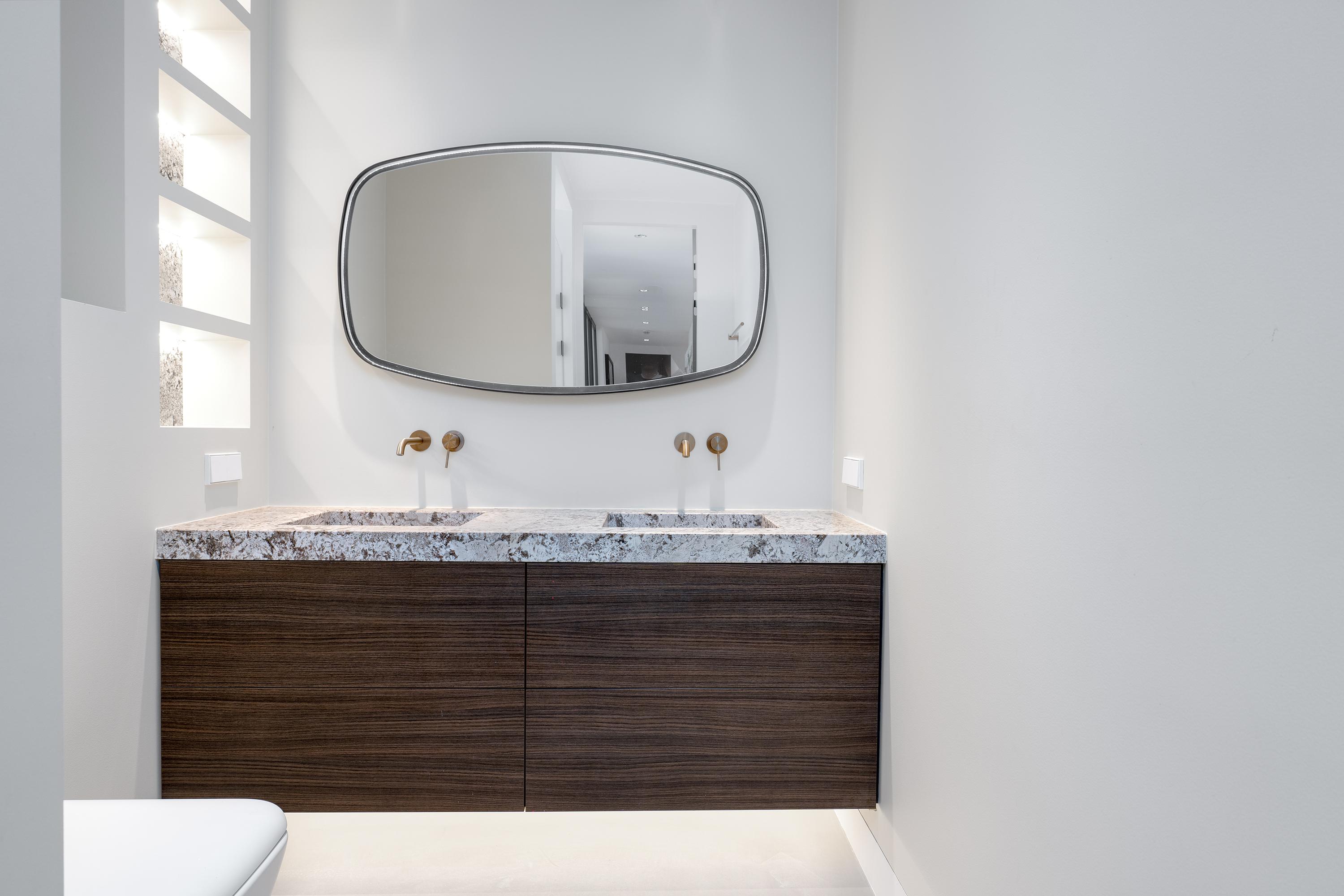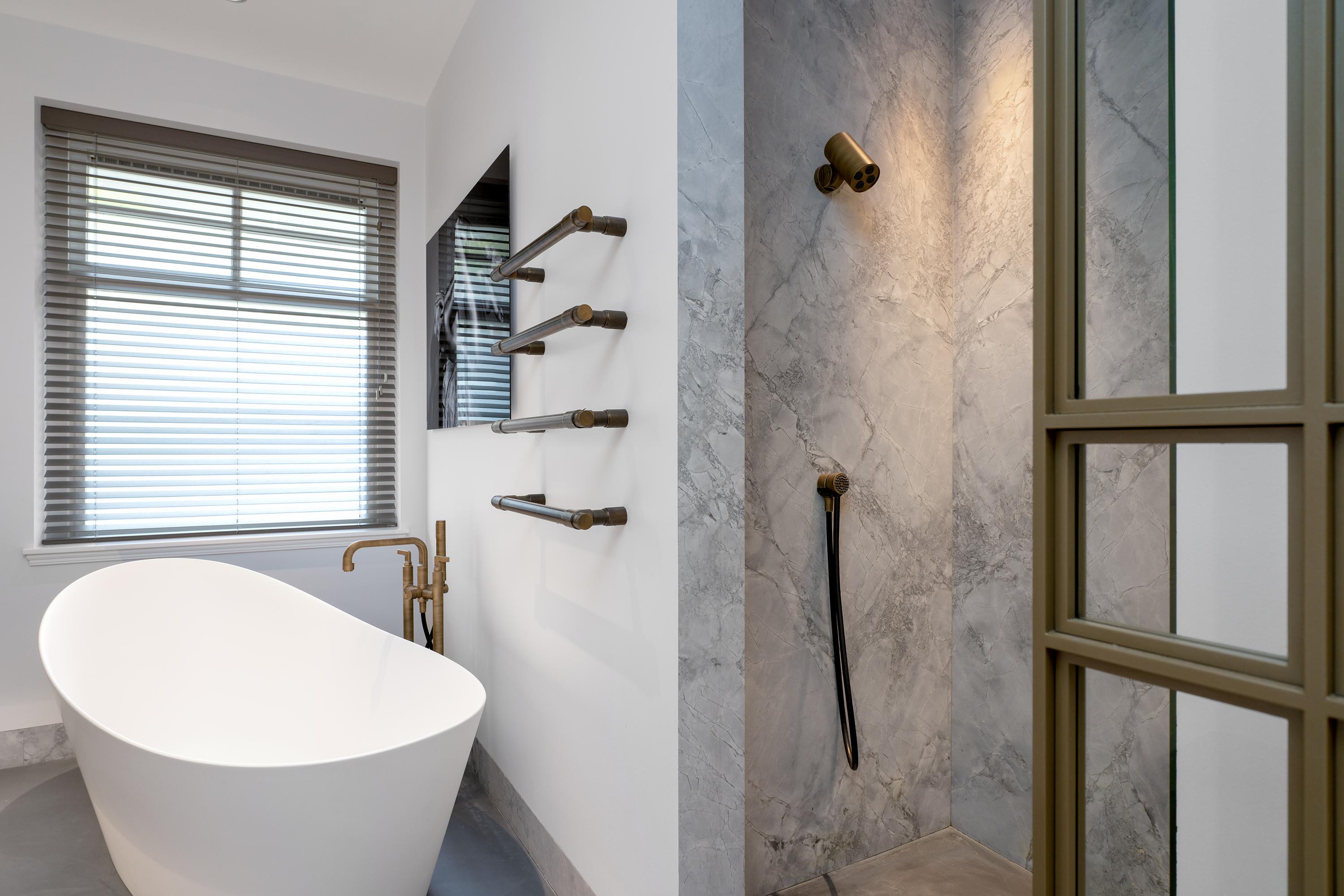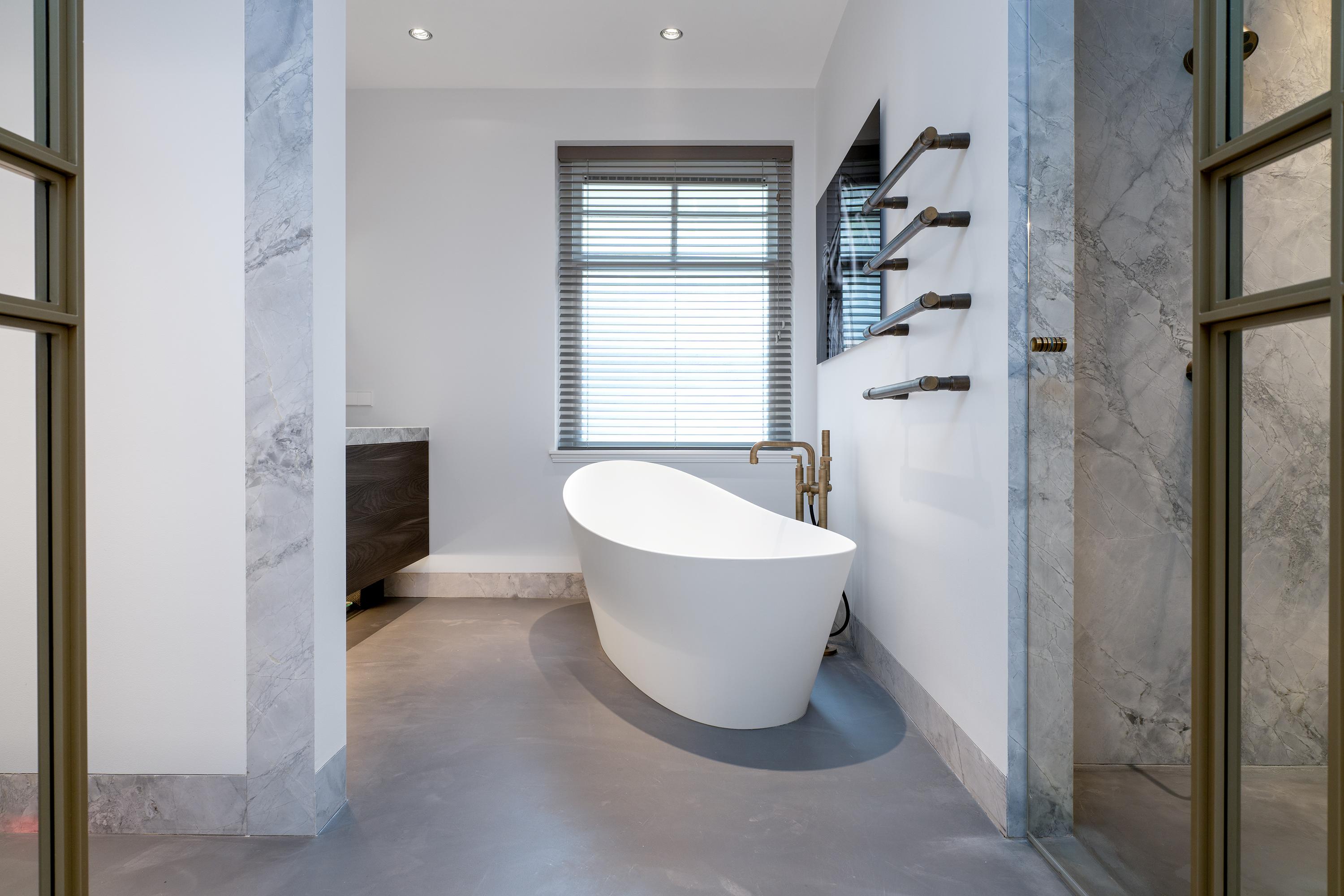 De master bedroom is aan de voorzijde van de woning gelegen. Deze riante kamer biedt een ruime walk-in closet aan weerszijde van de kamer, inclusief ingebouwde kaptafel. En-suite bevindt zich een luxe uitgevoerde badkamer voorzien van een losstaand ligbad, ruime regendouche, dubbele natuurstenen wasbak met meubel en douche-toilet.