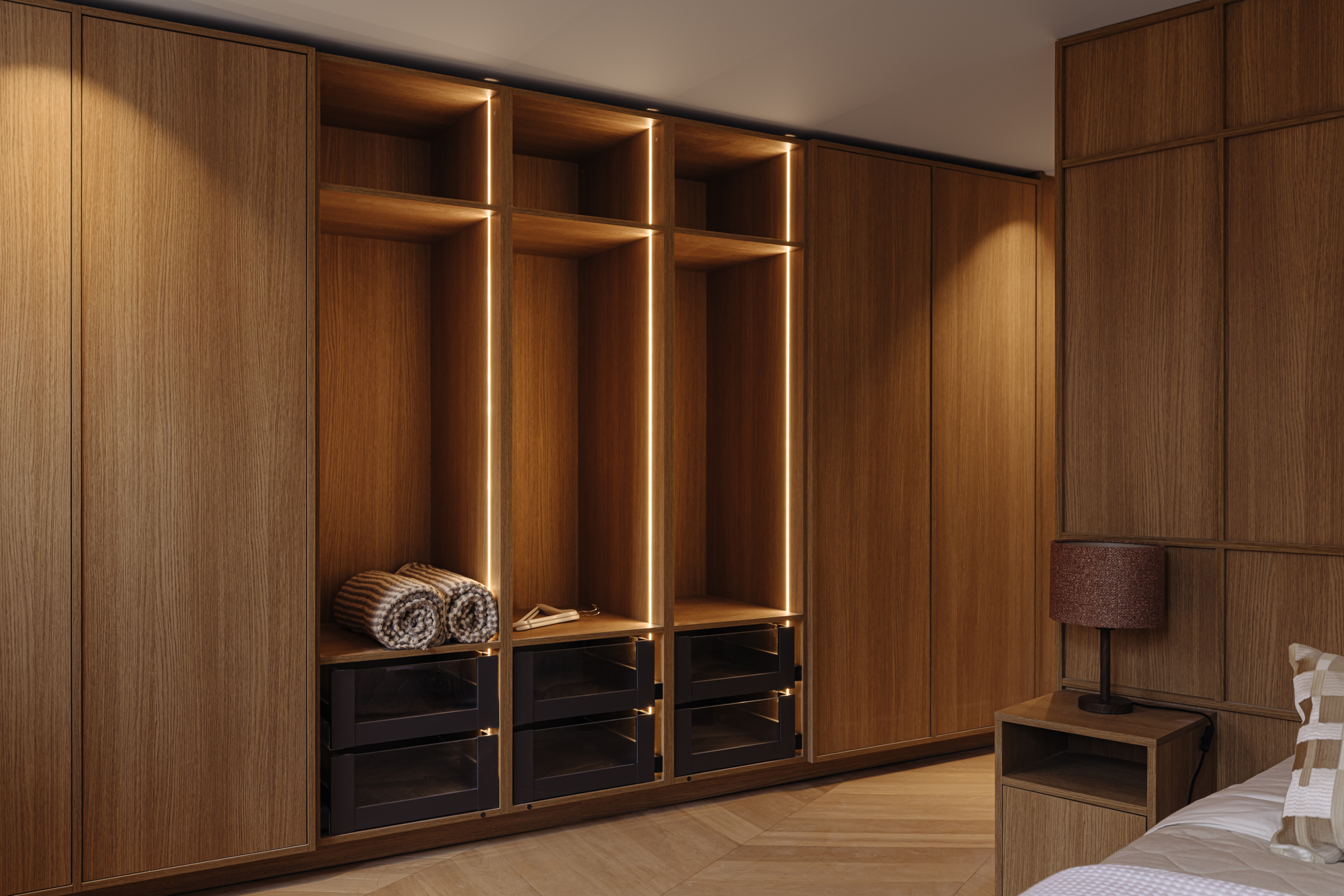 Aan de voorzijde bevindt zich de riante woonkeuken met kookeiland, zonder twijfel het pronkstuk van het appartement. De keuken is uitgevoerd in prachtig donker eikenhout en afgewerkt met een elegant composiet werkblad. De keuken is voorzien van hoogwaardige inbouwapparatuur van Siemens StudioLine, een Bora kookplaat en een Quooker. Het eiland beschikt daarnaast over een gezellig bargedeelte. Dankzij de breedte van bijna 7 meter en drie grote ramen is er een prachtig vrij uitzicht richting de Jan Luijkenstraat.