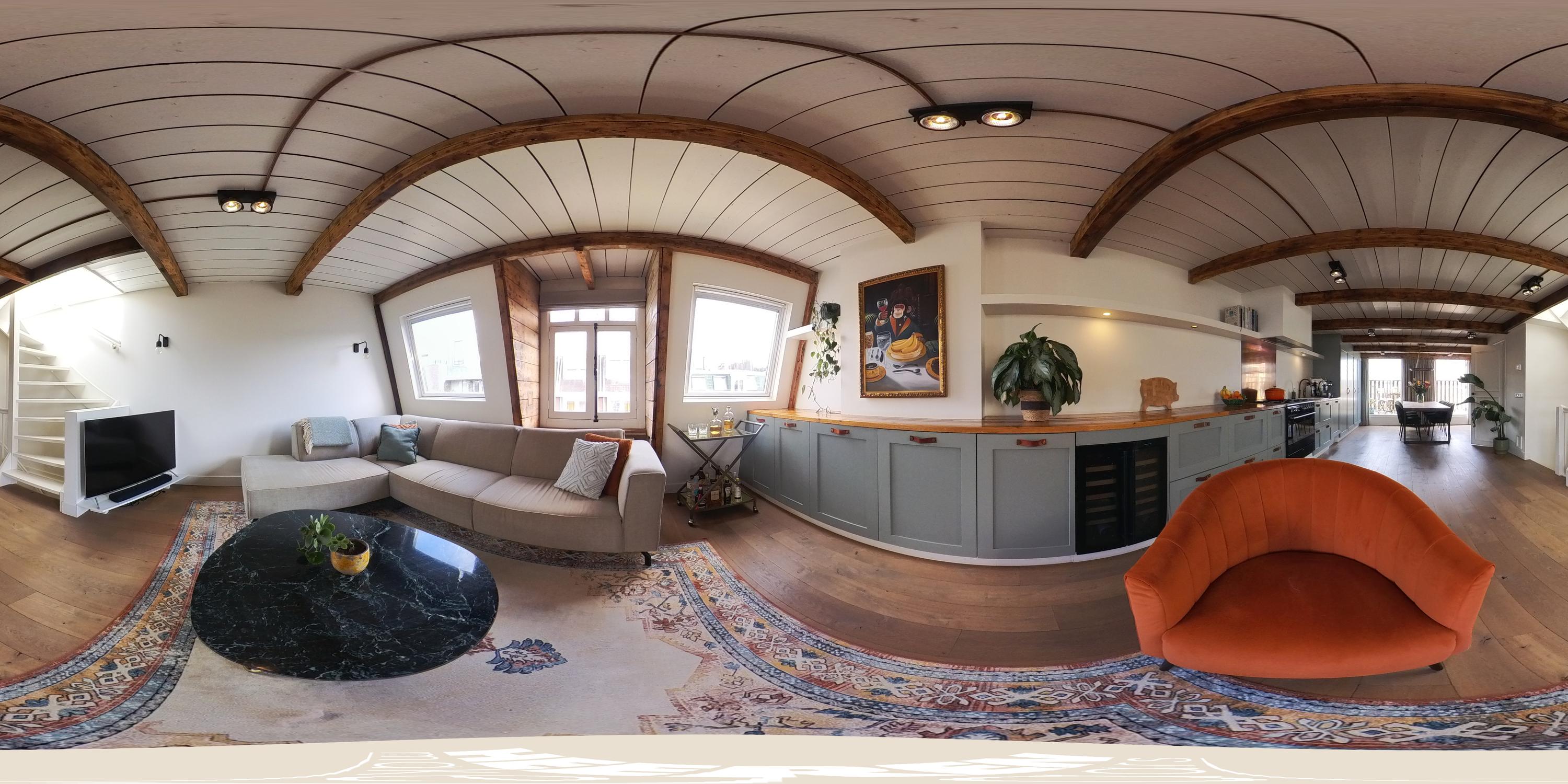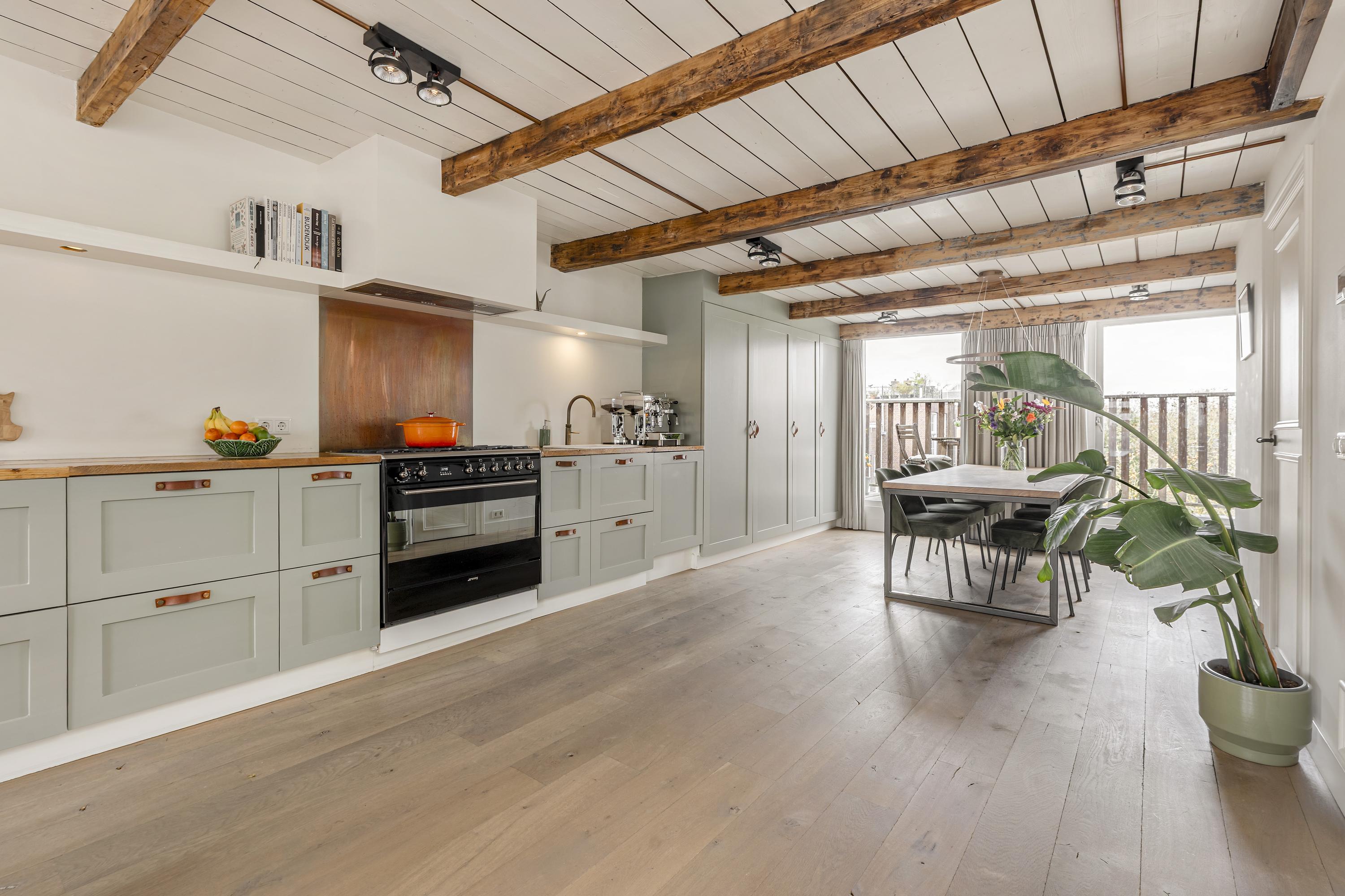 De woonverdieping, gelegen op de vierde verdieping, bestaat uit een royale en lichte woonkamer met open keuken. De ruimte kenmerkt zich door de sfeervolle houten balken, die zorgen voor karakter en warmte. Dankzij de raampartijen aan zowel de voor- als achterzijde, en het inkomende licht vanaf het dakterras, is er gedurende de dag een prettige lichtinval. De open keuken loopt over de gehele wand en beschikt over meer dan voldoende bergruimte. De keuken is uitgerust met een zes pits gasfornuis, afzuigkap, oven, vaatwasser, spoelbak met Quooker, koelkast, vriezer en wijnklimaatkast. Tevens is deze verdieping voorzien van een apart toilet met dubbele deur. Vanuit de woonkamer is er direct toegang tot het balkon aan de achterzijde, gelegen op het Westen. Een vaste trap leidt naar het waanzinnige dakterras. Dit ruime terras biedt volledige privacy en geniet van 360 graden zon, waardoor u hier de hele dag door kunt ontspannen. Het terras biedt volop ruimte voor meerdere zit- en loungeplekken en is een absolute eyecatcher van de woning. De slaapverdieping is gelegen op de derde etage. Hier bevinden zich drie goed bemeten slaapkamers. Aan de achterzijde liggen twee slaapkamers, beide met toegang tot het balkon. Deze kamers zijn ideaal te gebruiken als slaap-, werk- of logeerkamer. Aan de voorzijde bevindt zich de nog ruimere master bedroom met Frans balkon. De badkamer is centraal gelegen en voorzien van een inloopdouche, dubbele wastafel met meubel en toilet. Daarnaast is er een separate ruimte met aansluitingen voor de wasmachine en droger, evenals praktische kastruimte op de overloop. De woonlagen zijn omgedraaid, waardoor de woonverdieping zich op de bovenste laag bevindt en optimaal wordt geprofiteerd van lichtinval, privacy en een ruimtelijk gevoel.
