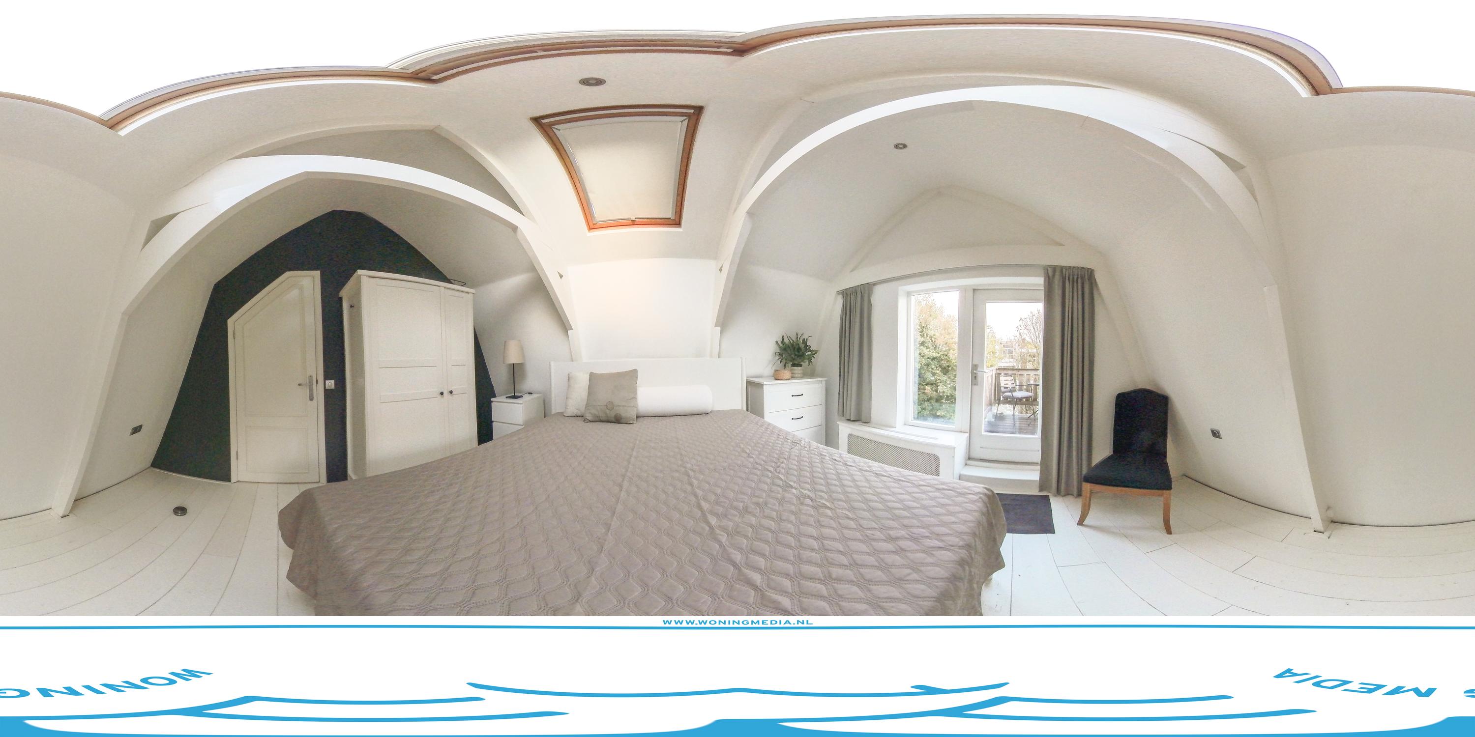 De bovenste verdieping beschikt over twee ruime slaapkamers en een tweede badkamer met bad/douche, wastafel en toilet. De hoofdslaapkamer aan de achterzijde heeft toegang tot het balkon van circa 4,5 m². De tweede slaapkamer ligt aan de voorzijde. Dankzij de charmante dakconstructie met dakkapellen en dakramen is dit een sfeervolle verdieping met veel lichtinval.