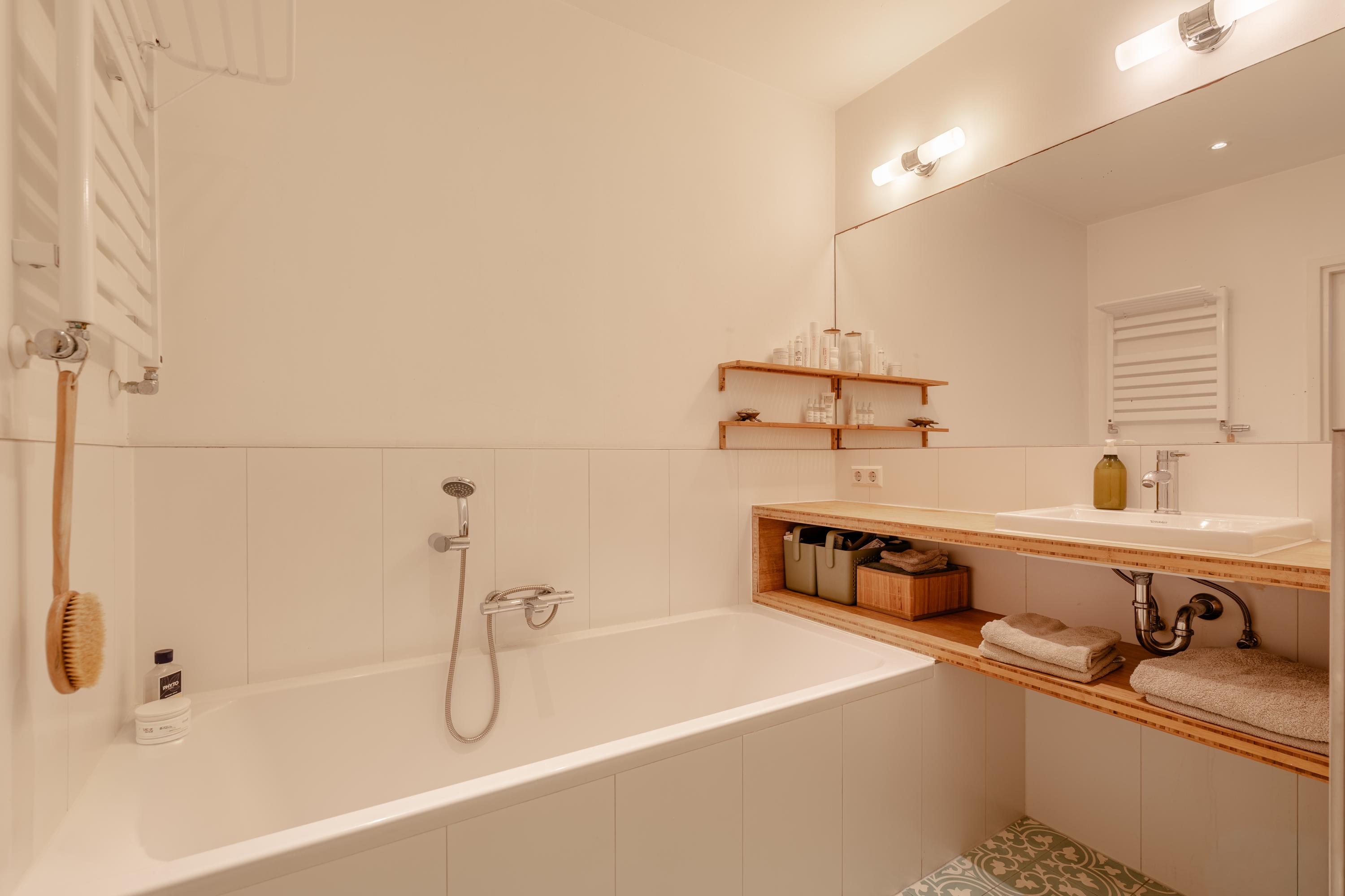 Op de overloop bevindt zich de moderne badkamer, uitgevoerd in een rustige en verzorgde stijl en voorzien van een ligbad, inloopdouche, toilet en een fraaie wastafel met meubel.