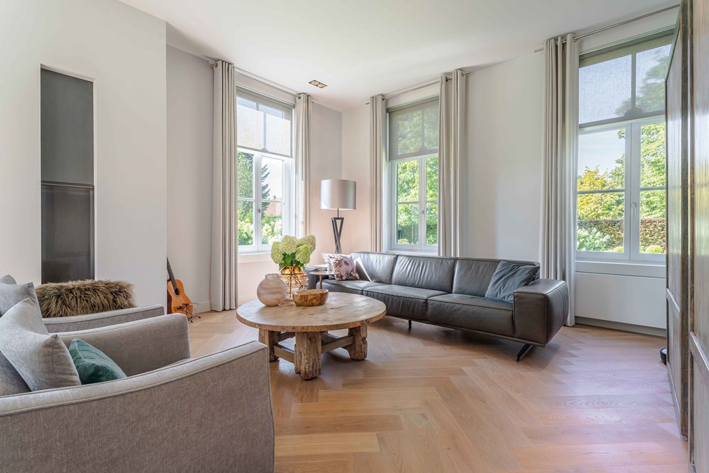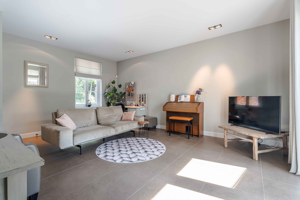 De zitkamer is voorzien van een parketvloer, een ingebouwde gashaard, inbouwverlichting en een tuindeur. Door de grote raampartijen aan zowel de voor, zij-als achterzijde is er veel natuurlijke lichtinval en heeft u een heerlijk uitzicht op de tuin.
