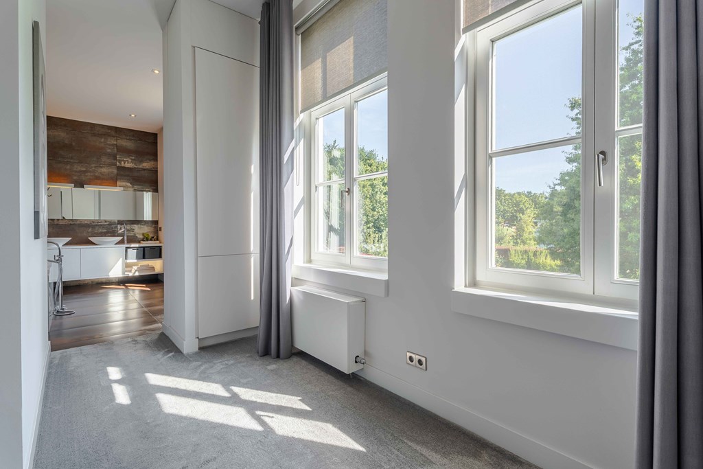 Slaapkamer 1 gelegen aan de voorzijde van de woning. Deze master suite, met doorkijkjes naar de tuin, is een oase van rust. Aansluitend heeft u toegang tot een kleedkamer en een complete badkamer met inloopdouche, een vrijstaand ligbad en 2 waskommen met meubel.