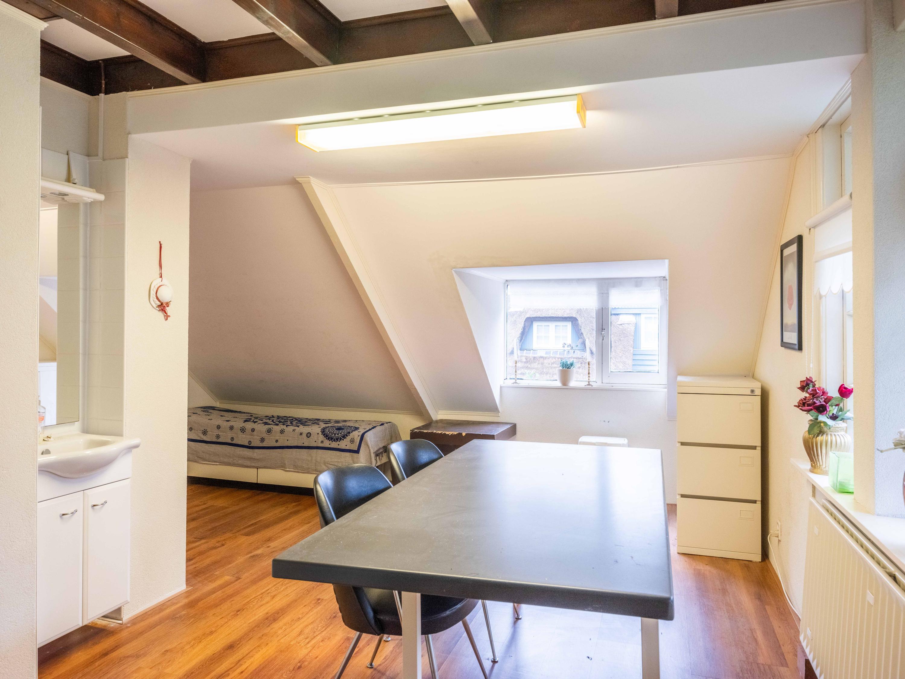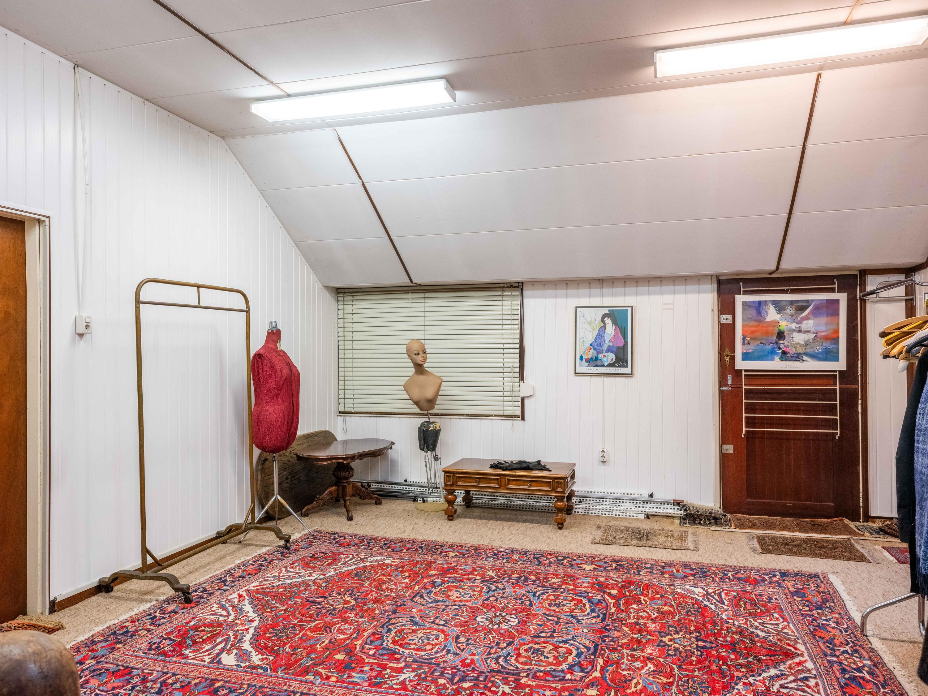 De tuingerichte zit-/eetkamer met openslaande deuren is flink van formaat en naar wens nader in te delen. De keuken is gesloten en eenvoudig uitgevoerd, via de achterdeur in de bijkeuken bereiken we de tuin met de flinke garage van ca. 40 m2. Op de begane grond is tevens een riante atelierruimte beschikbaar die ook prima dienst kan doen als slaapkamer. Via deze ruimte is de tevens van buitenaf bereikbare kantoorruimte bereikbaar. Ideaal voor praktijk aan huis bijvoorbeeld.