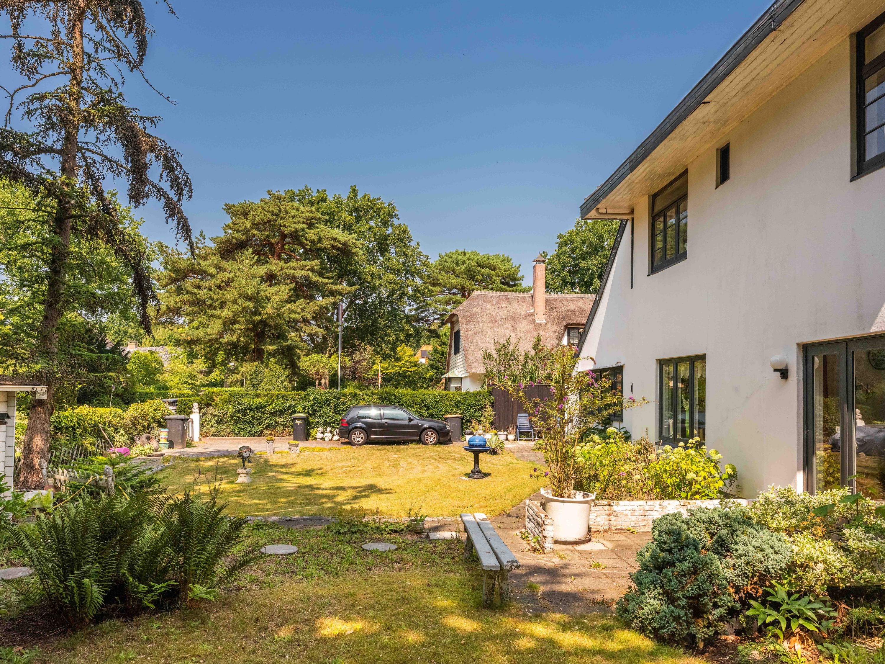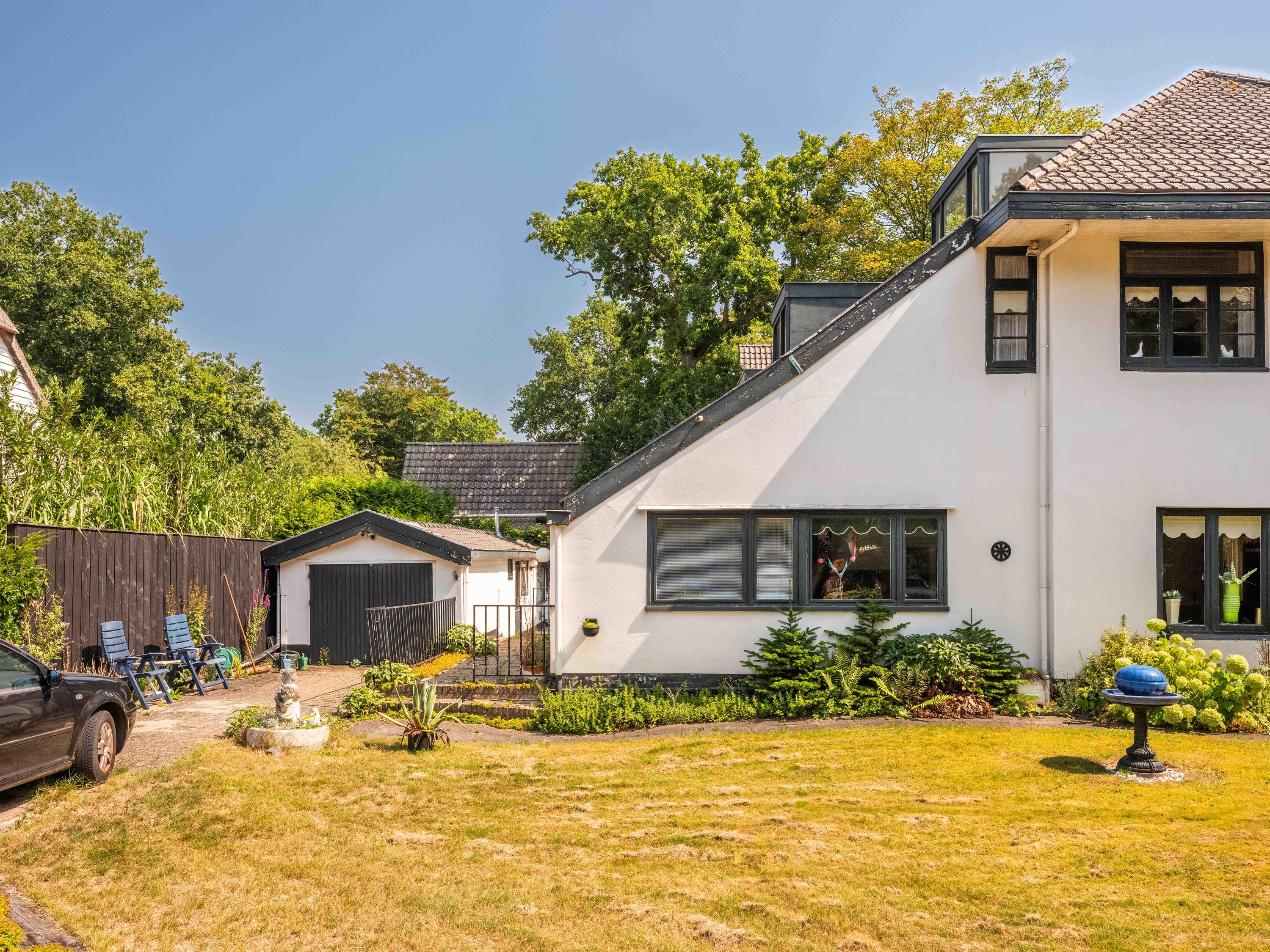 Via de oprit krijg je toegang tot de kavel. Hier tref je ook een grote vrijstaande garage. Plek genoeg voor auto's op eigen terrein. De villa is gelegen op een ruime kavel met fraai aangelegde boom- en struikpartijen rondom.