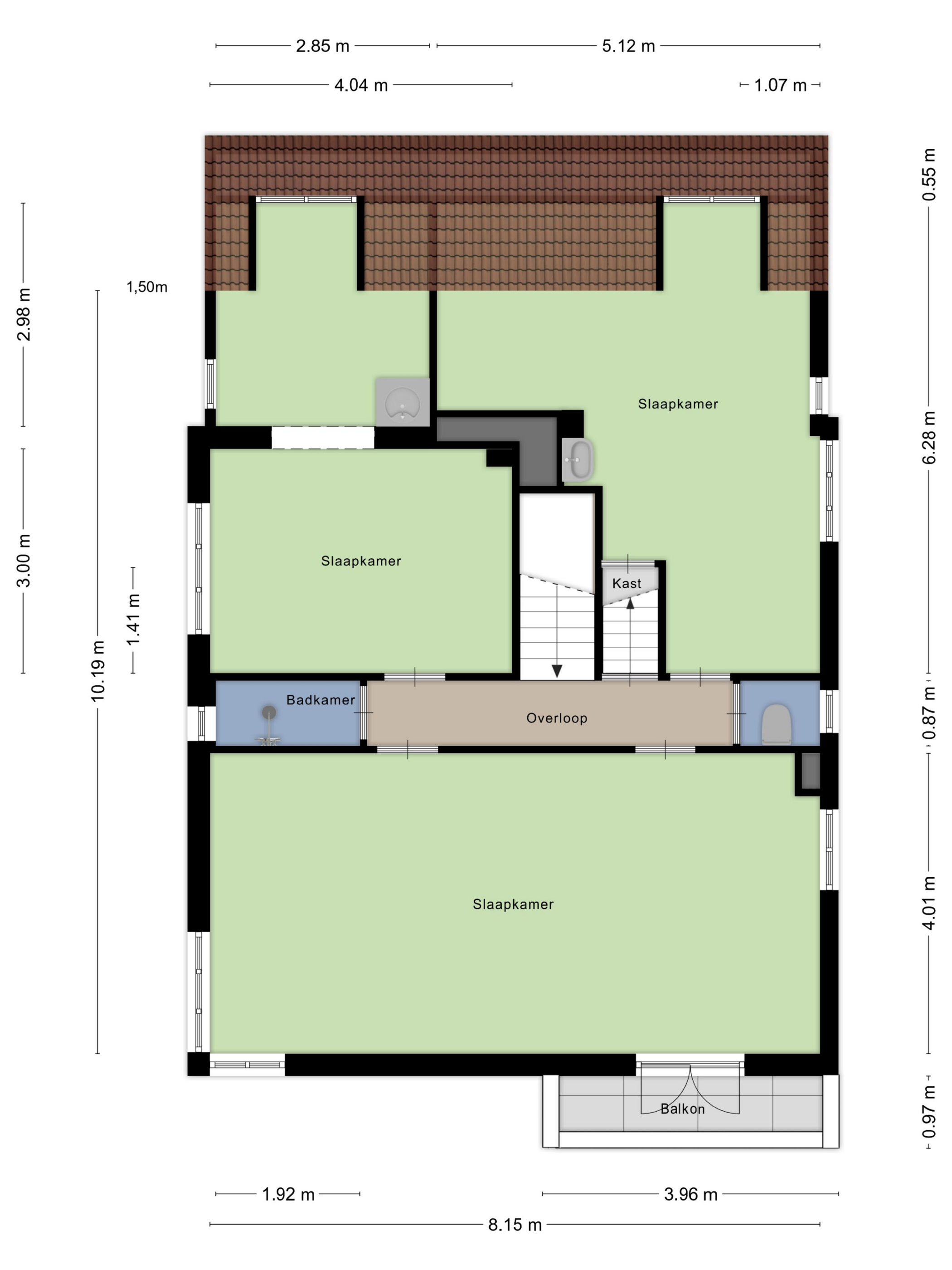 Een vaste trap leidt naar de 1e verdieping. Hier een overloop naar de 3 slaapkamers, de douche en het toilet. Een stijle trap naar de zolderverdieping brengt ons naar een ruime kamer met dakkapel en opbergruimte achter de knieschotten.