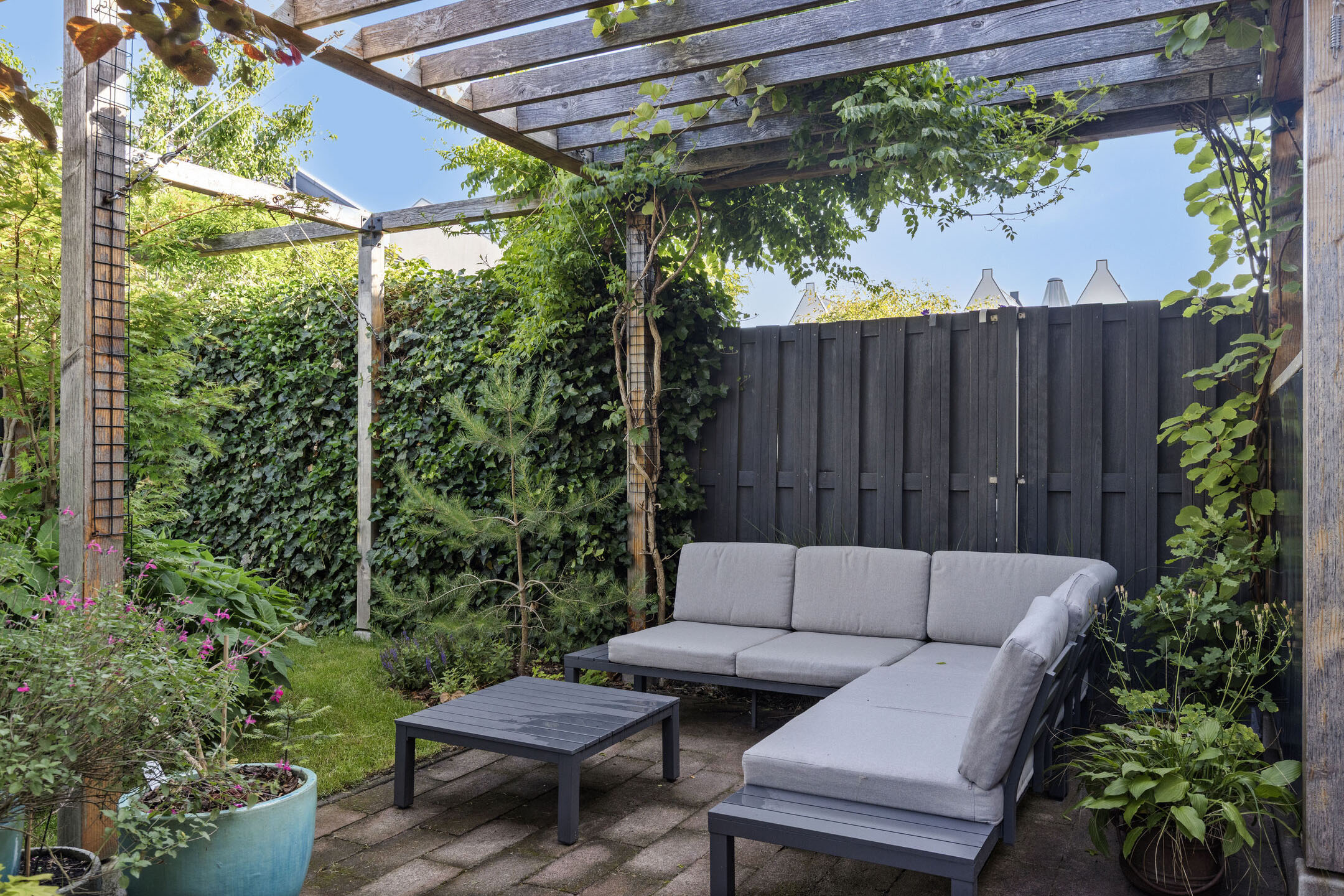De fraai aangelegde achtertuin is gelegen op het noordwesten, ideaal voor middag- en avondzon.