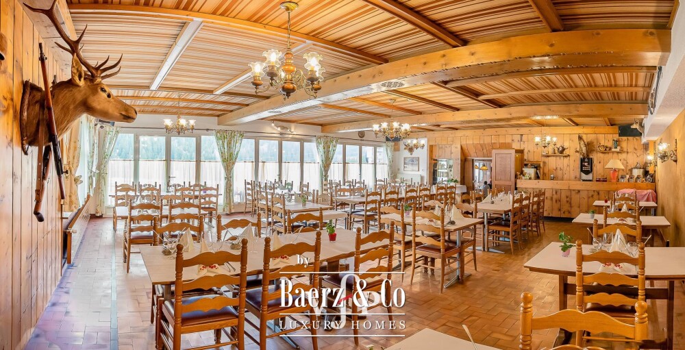 Het terrein is zorgvuldig ingericht voor een soepele aankomst, met een royale geasfalteerde parkeerplaats van 4.337 m² voor gasten van zowel hotel als restaurant. Een open haard, wasruimte, balkon en terras bieden een praktische en comfortabele omgeving voor bezoekers en personeel. Oliegestookte verwarming voorziet het pand van efficiënte warmte gedurende de seizoenen in de Alpen.