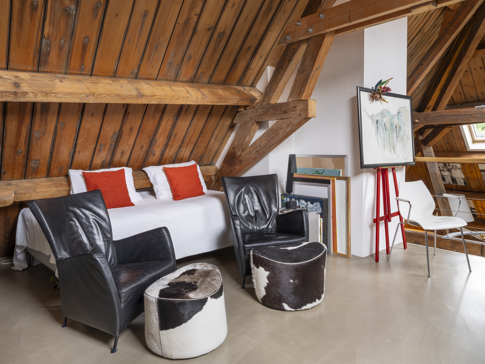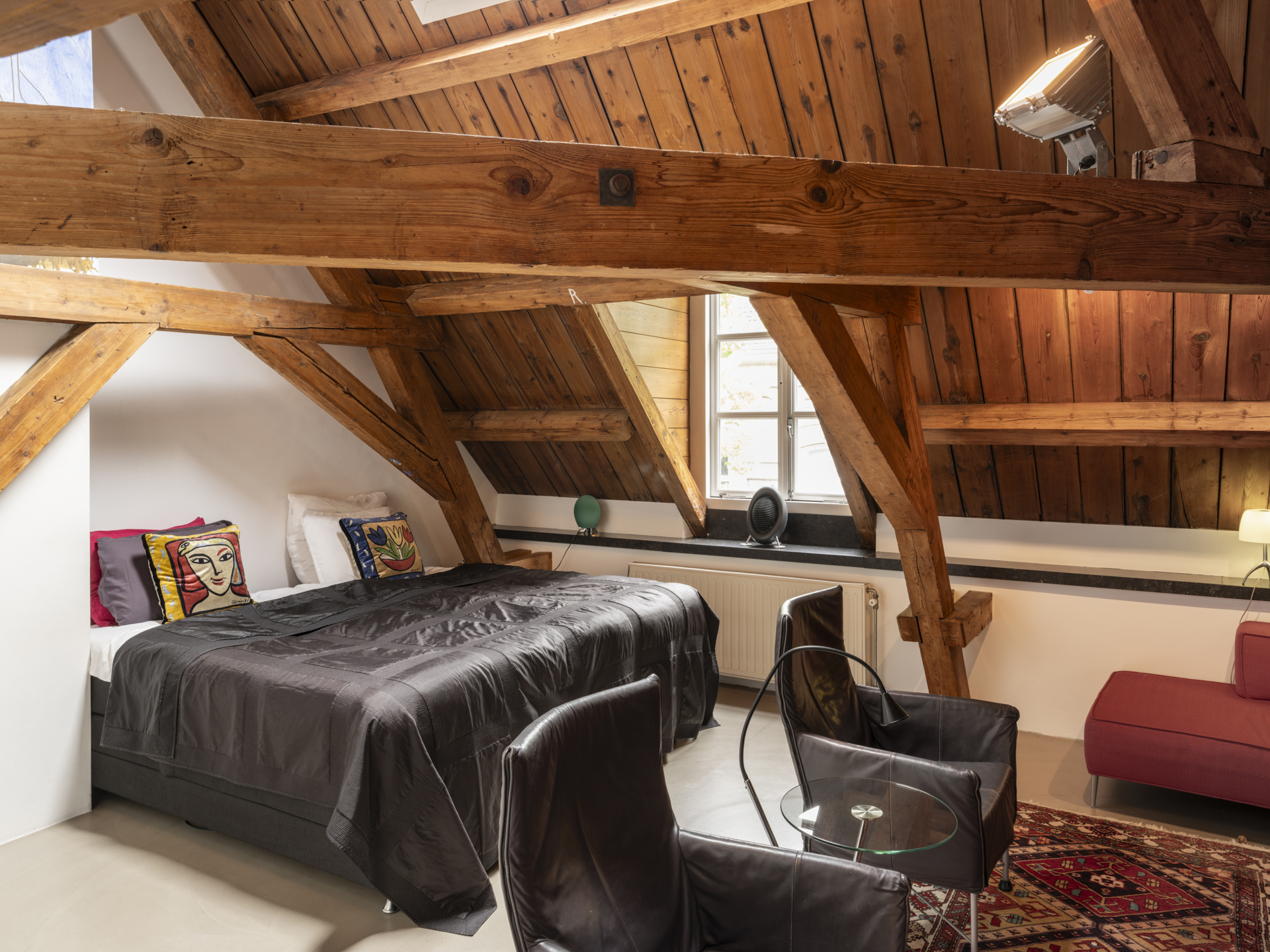 De slaap- en badkamer treft u aan de andere zijde van de eerdergenoemde hal. Het riante slaapgedeelte (totaal ca. 55 m²) is gelegen aan de kant van het Kasteelplein. Ook in de slaapkamer heeft u volledig zicht op de intact gehouden monumentale kap. In deze kamer zijn twee zeer ruime inloopkasten aanwezig.