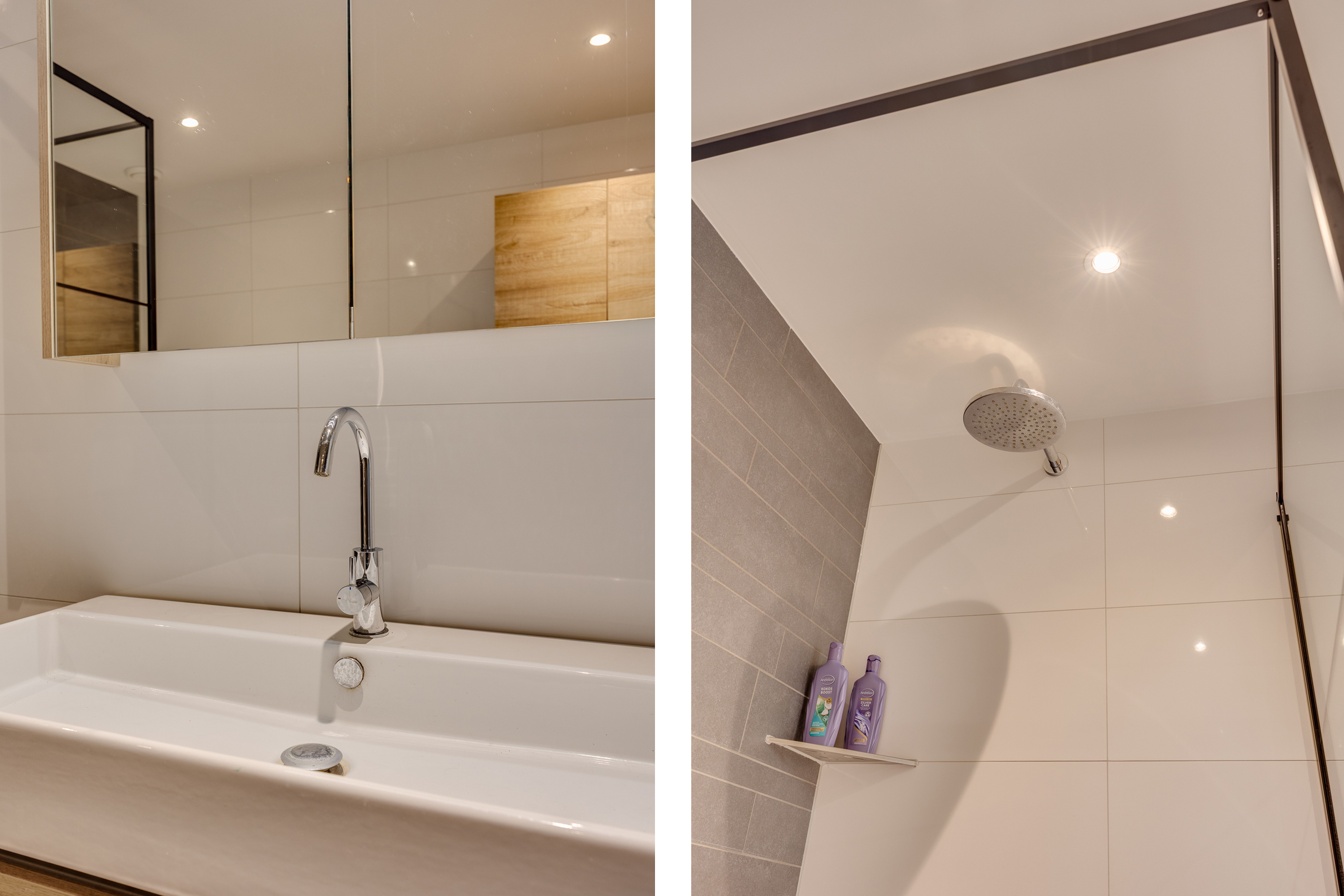 Daarnaast is er een tweede badkamer met inloopdouche, wastafelmeubel, toilet en ruimte voor wasmachine en droger. Een extra separaat toilet bevindt zich op de overloop. Authentieke houten balken zijn in het zicht gebleven en zorgen voor een sfeervol contrast met de moderne afwerking.