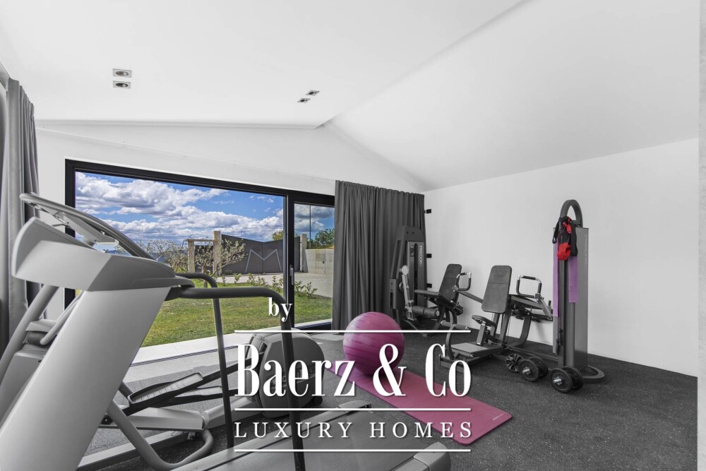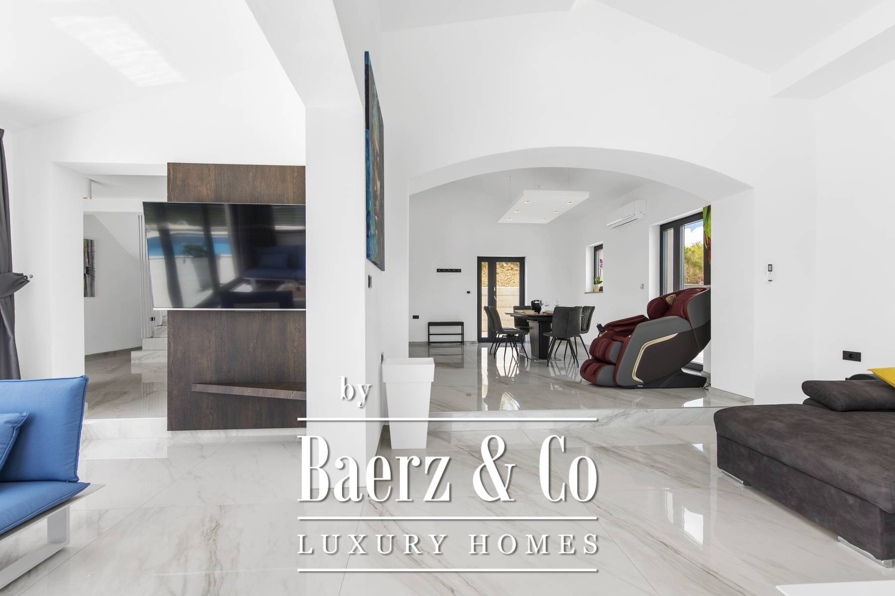 Elke ruimte is ontworpen om maximaal te profiteren van het panoramische uitzicht, met grote glazen wanden die het licht binnenlaten en het Kroatische buitengebied omlijsten. Op de begane grond worden wonen, dineren en koken verbonden in een open opzet, aangevuld met een slaapkamer, badkamer en een volledig uitgeruste fitnessruimte. Boven bevinden zich nog twee slaapkamers, elk met en-suite badkamer en toegang tot een terras.