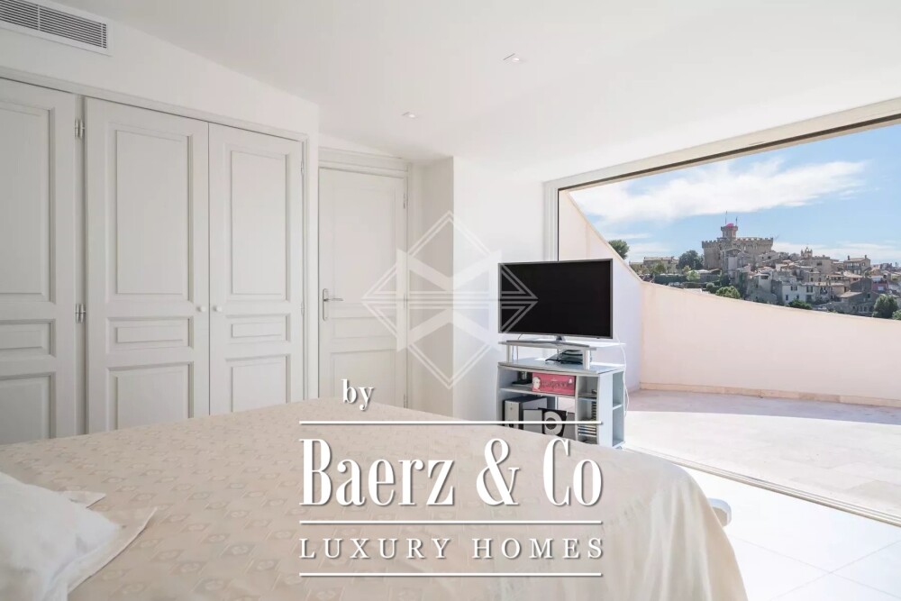 Villa Cagnes-sur-Mer ligt op een bevoorrechte locatie met uitzicht op de Hauts de Cagnes en biedt een sereen toevluchtsoord met een panoramisch zeezicht en zichtlijnen naar het oude dorp en het kasteel van Hauts de Cagnes. Deze recent gerenoveerde villa van 436 m² is ontworpen voor een verfijnde, eigentijdse levensstijl, met een sterke focus op ruimte, licht en naadloze overgang van binnen naar buiten. De royale woon- en eetkamer lopen vloeiend over in een elegante keuken en zijn direct verbonden met een ruim, zonovergoten terras, ideaal voor zowel ontspannen bijeenkomsten als momenten van rust.