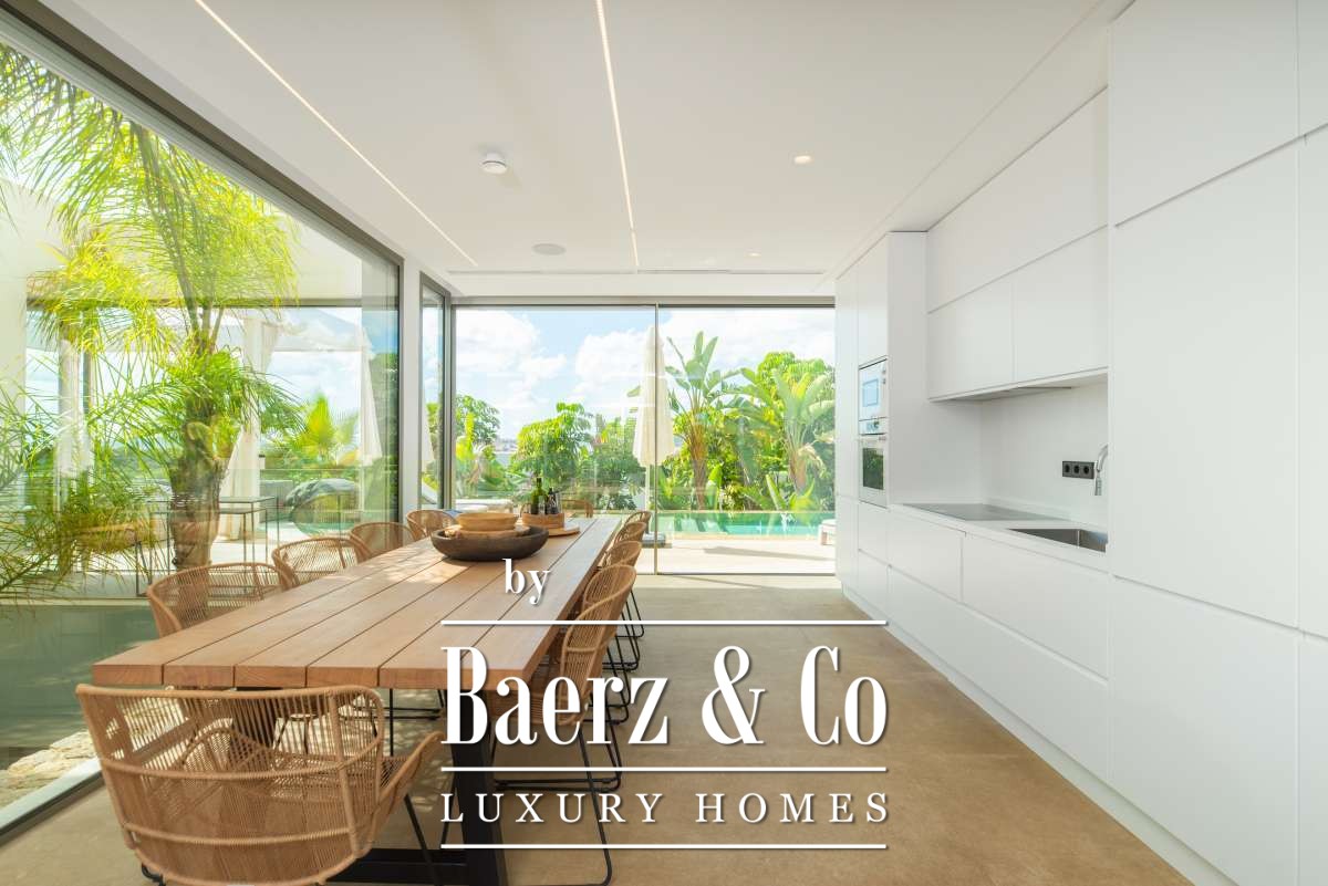 op zee. Grote glaspartijen laten de ruimtes baden in natuurlijk licht en verbinden de open woonkamer met de moderne designkeuken met hoogwaardige apparatuur en een stijlvolle eetruimte. Extra’s zoals vloerverwarming, airconditioning, elektrische schuifluiken en een Loxone smart-home-systeem maken het comfort compleet.De buitenruimtesDe buitenruimtes van Casa Legatus zijn ontworpen om volop te genieten. Een verwarmd infinity-zwembad met luxe ligbedden vormt het hart, omringd door meerdere terrassen, een overdekte lounge en een elegante buiten-eetruimte. De mediterrane tuin met bomen en groene zones zorgt voor een rustige, private sfeer, terwijl een lichte wintertuin met eet- en speelruimte voor kinderen extra comfort biedt. Een ruime garage voor vijf tot zes auto’s maakt dit uitzonderlijke huis compleet. Casa Legatus combineert moderne luxe, mediterraan leven en een toplocatie in Cap Martinet. Ervaar het zelf – plan vandaag nog een bezichtiging en ontdek exclusief wonen op Ibiza.