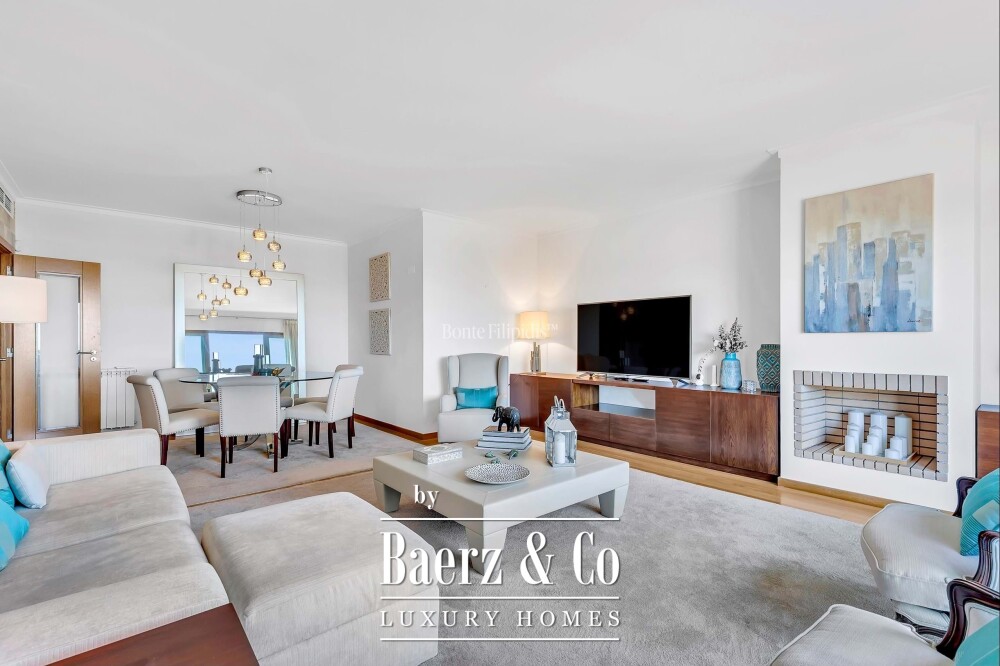 Appartement Cascais e Estoril bevindt zich op een rustige locatie binnen een afgesloten privécomplex, met vrij uitzicht op de oceaan en conciërgeservice in een van de meest gewilde kustgebieden van Portugal. Dit appartement, met twee slaapkamers en twee badkamers, beschikt over een privatief bruto-oppervlak van 113,50 m² en heeft een indeling die privacy en openheid harmonieus combineert, waardoor de zee in elk vertrek wordt betrokken. De woonkamer is gescheiden in een zit- en eetgedeelte, voorzien van een haard en geïntegreerde wijnopslag, terwijl de keuken—uitgerust met Miele-apparatuur, gas- en elektrische kookplaten—subtiel doorloopt naar een wasruimte.