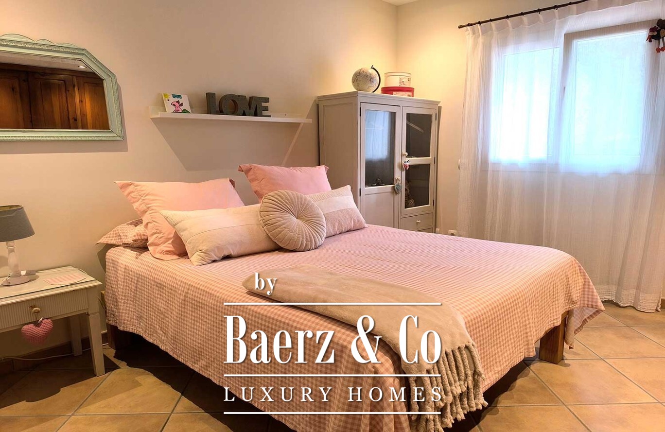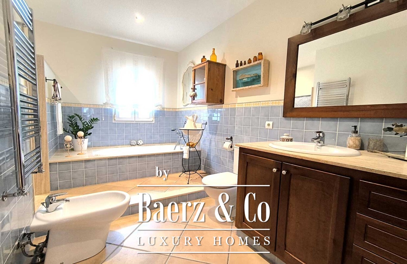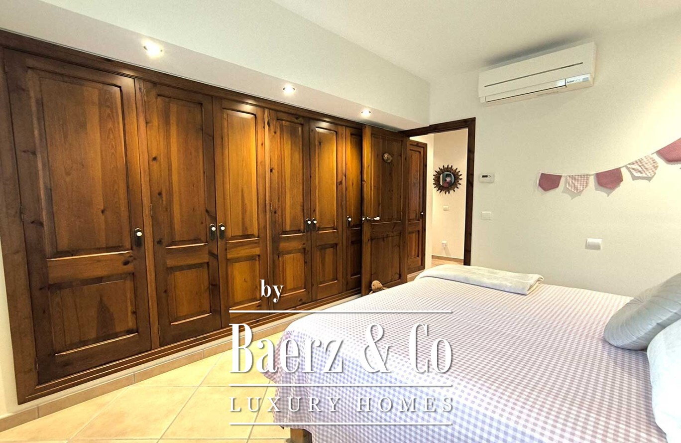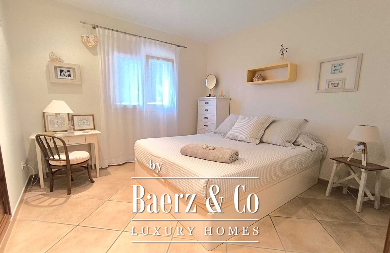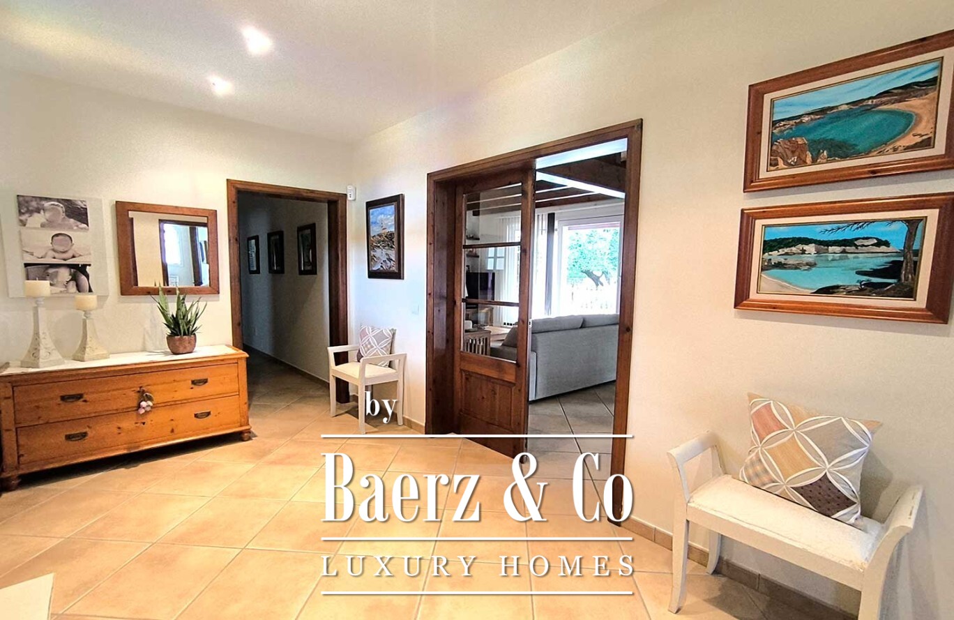 Buiten vormt een royaal zwembad het middelpunt van een tuin met volgroeide bomen en onberispelijk kunstgras, waardoor rust en eenvoudig onderhoud samenkomen. De villa in Ciutadella de Menorca verenigt authenticiteit en privacy met directe toegang tot de Middellandse Zee en biedt daarmee een zeldzame kans voor een exclusieve levensstijl.