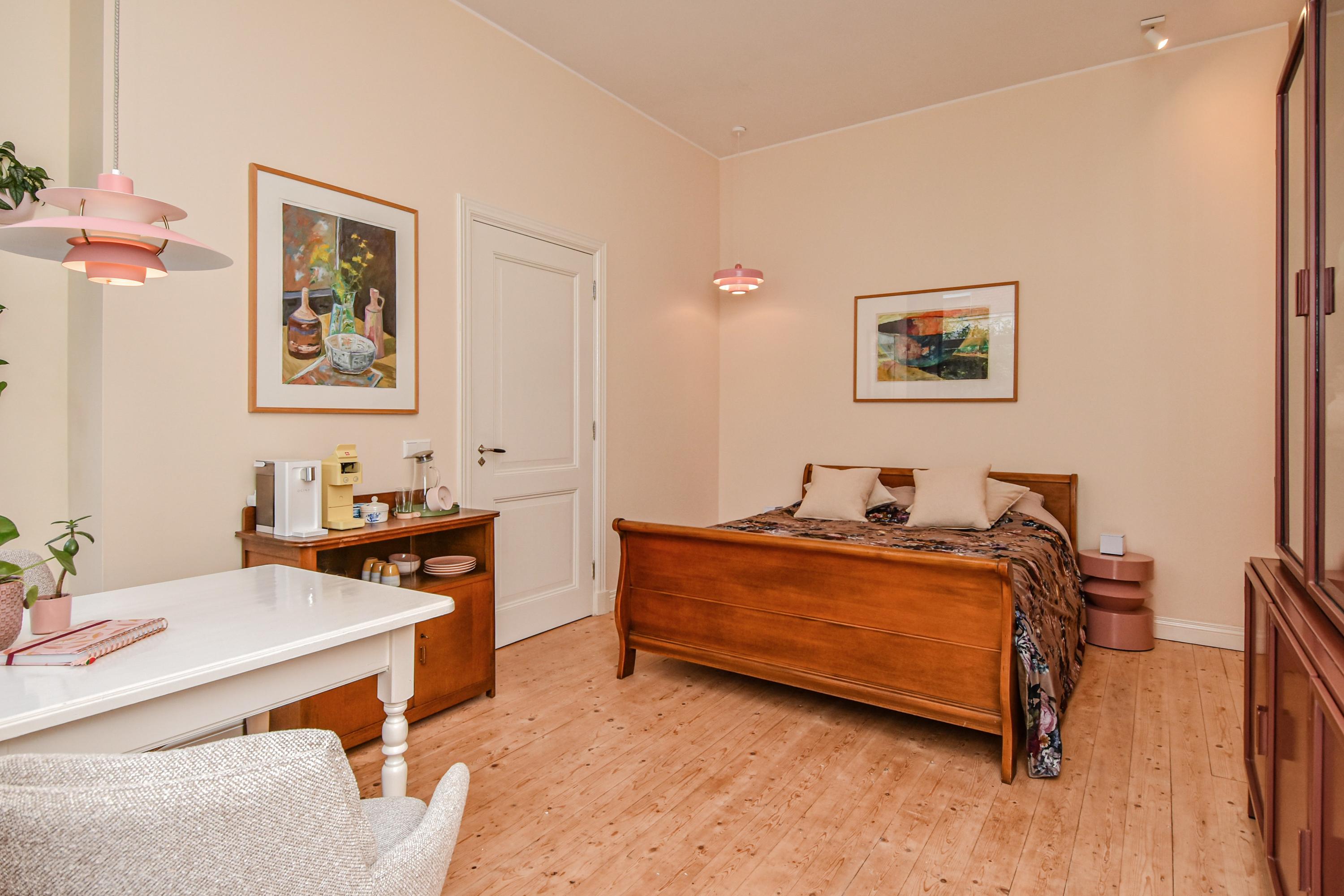 Aan weerszijden van de keuken bevinden zich twee sfeervolle leefruimtes: aan de ene kant een zitkamer en aan de andere kant een knusse woonkamer met een gezellige zithoek. Aangrenzend bevindt zich de inpandige studio, eveneens met een fraaie hoogte en openslaande deuren naar de straat. Deze ruimte is ingericht als slaapkamer met een eigen badkamer voorzien van inloopdouche, dubbele wastafel en toilet — ideaal als gastenverblijf, aanleunwoning, kantoor of praktijkruimte aan huis. Aan de achterzijde is een grote, praktische fietsenberging met vliering. Deze heeft toegang via de Broerhuisstraat. Vanuit de woonkamer leidt een rechte trap naar de eerste verdieping.