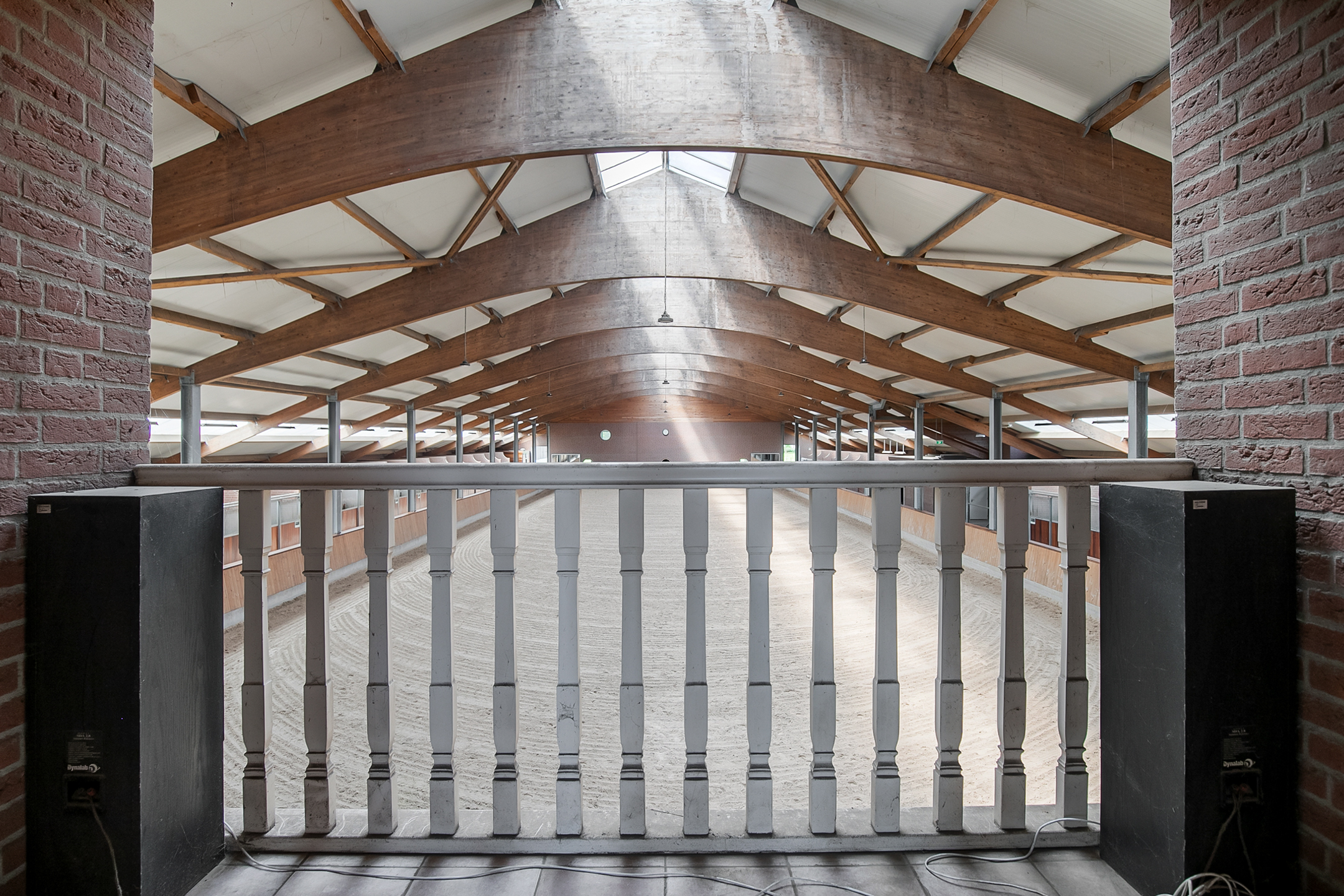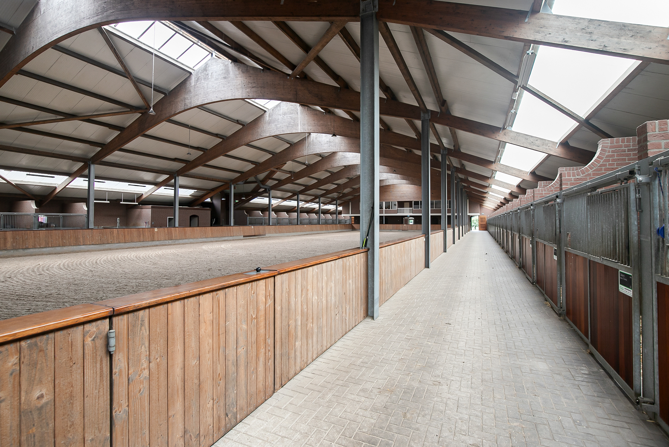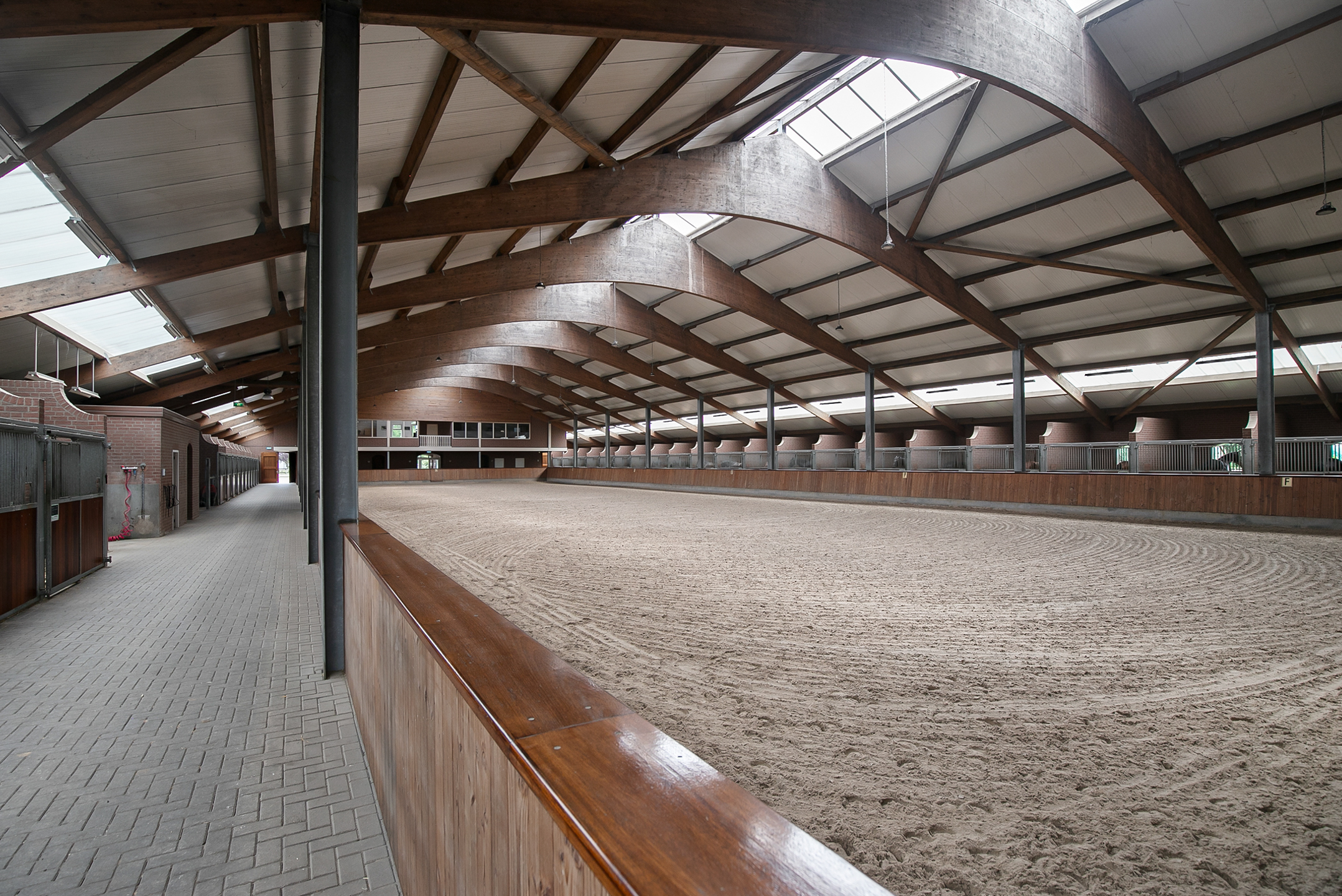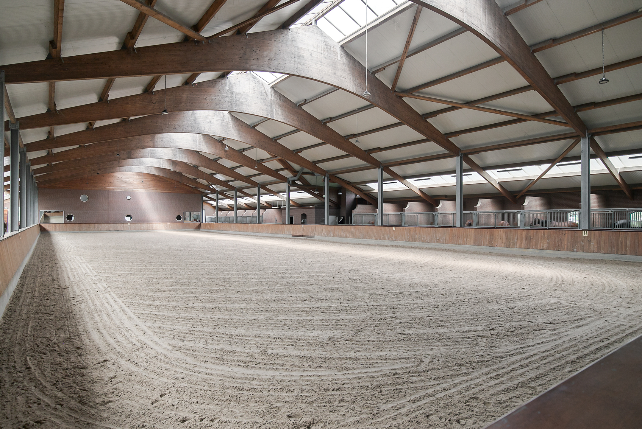 De rijhal is opgetrokken uit metselwerk gevels met spanten. Een lichtstraat in de nok en boven de paardenboxen zorgt voor veel natuurlijke lichtinval. Openslaande deuren in de voorgevel zorgen voor toegang.