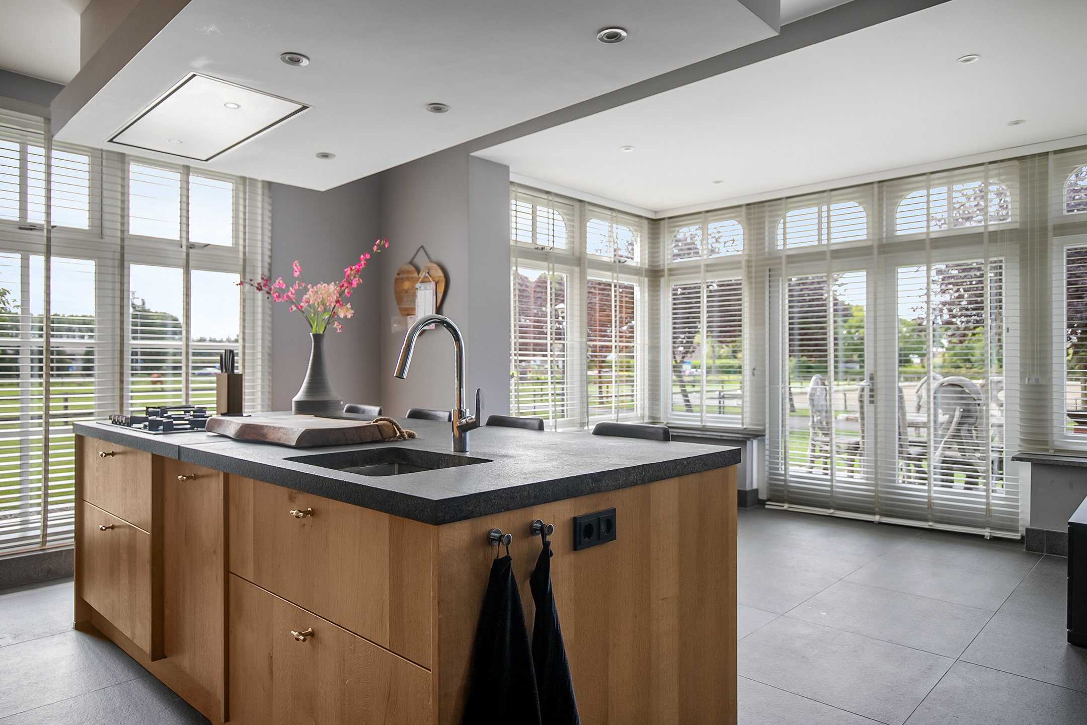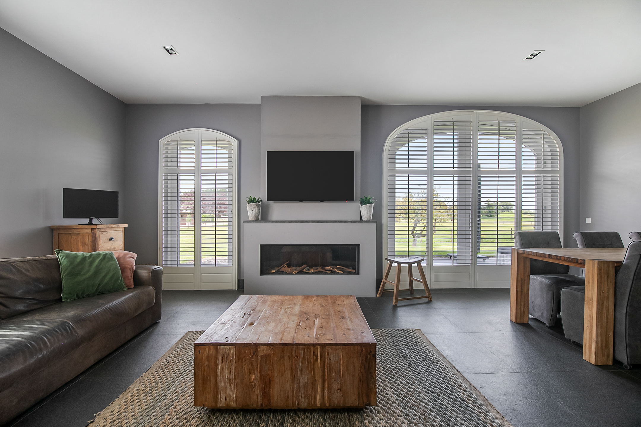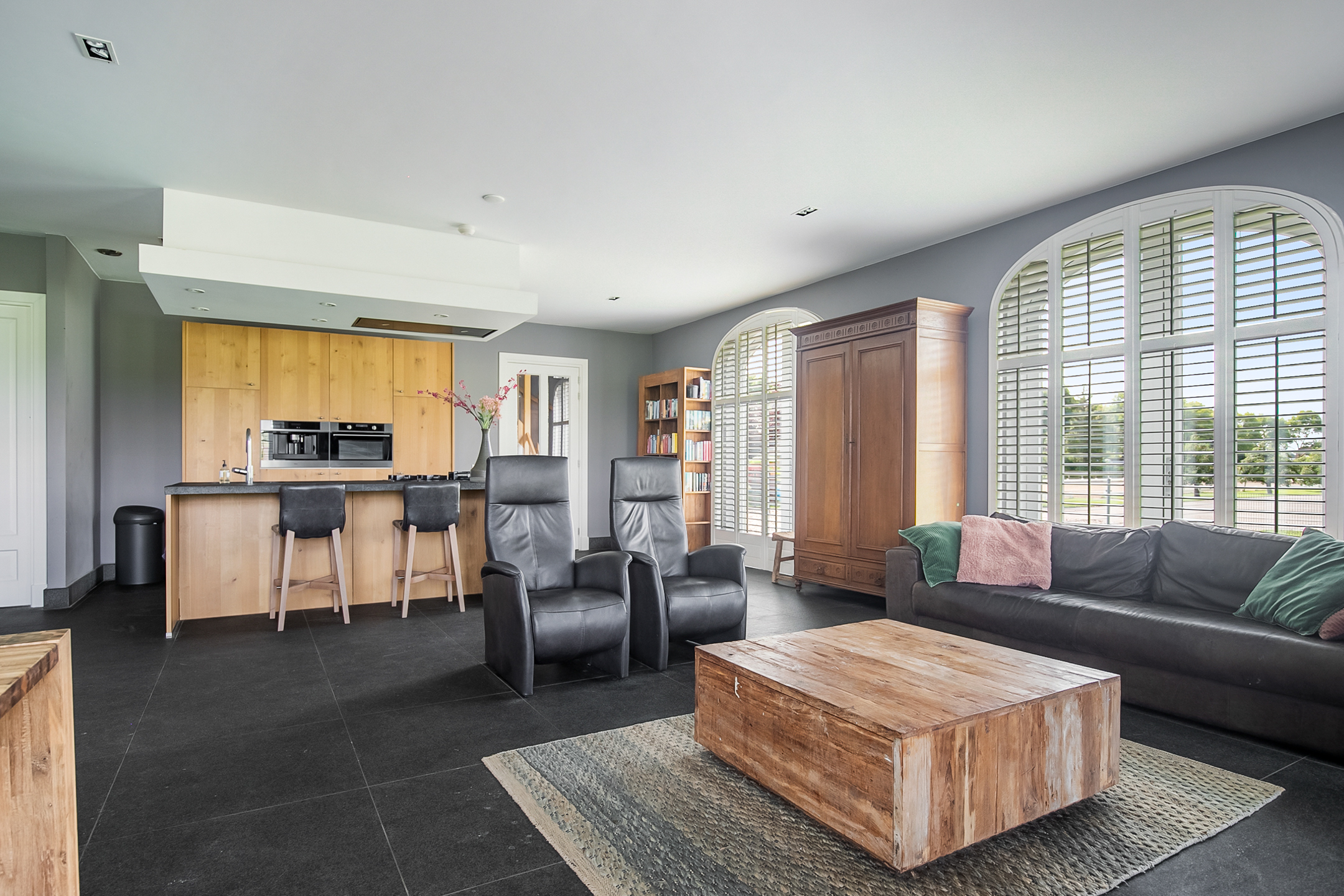 - De raampartijen in het achterhuis zijn voorzien van sfeervolle shutters.