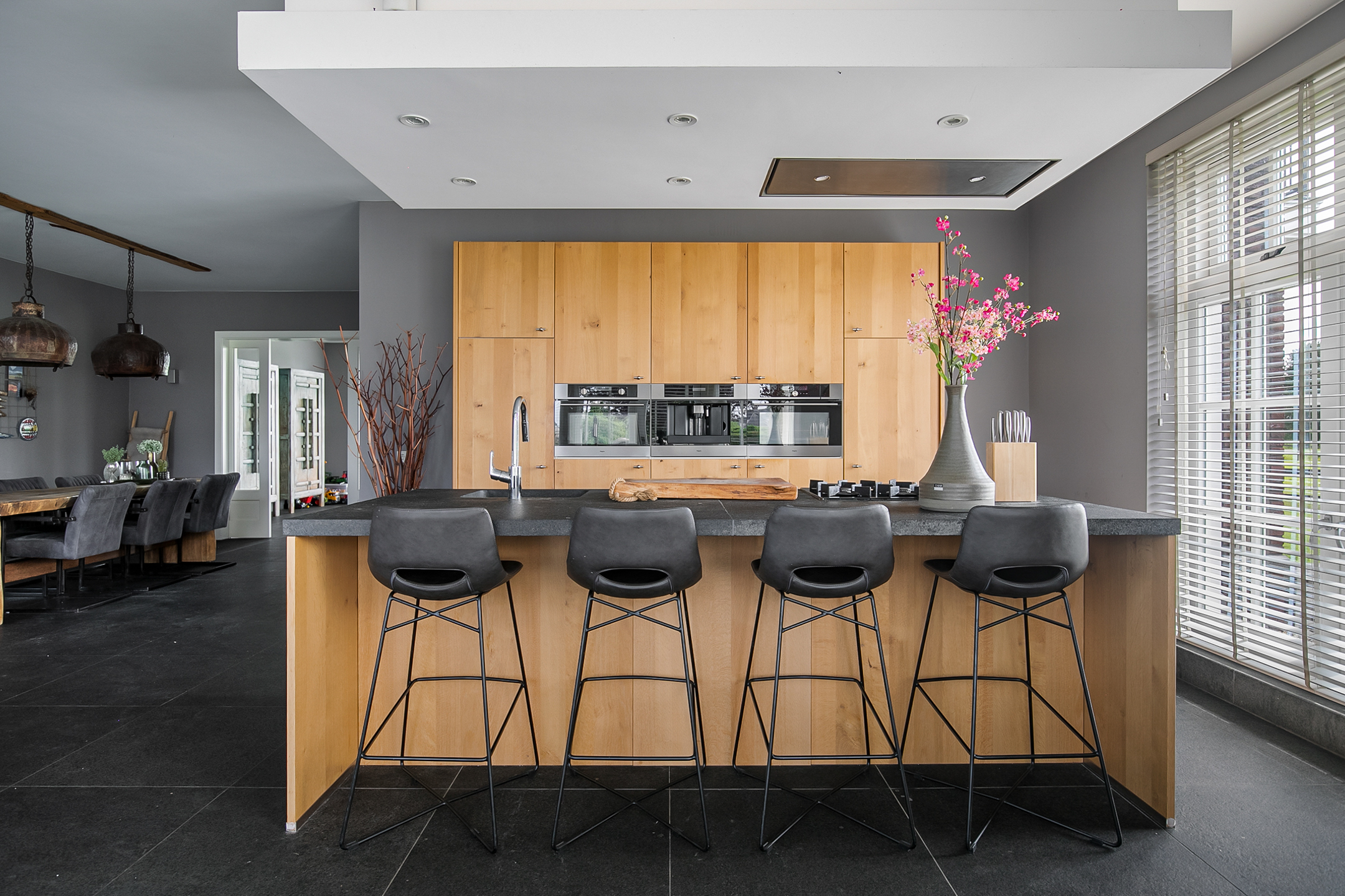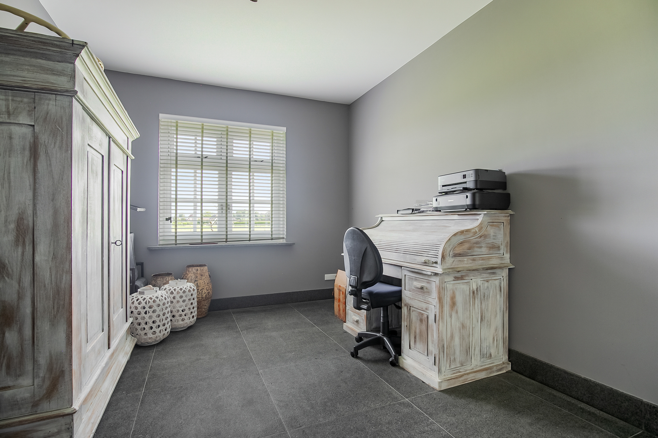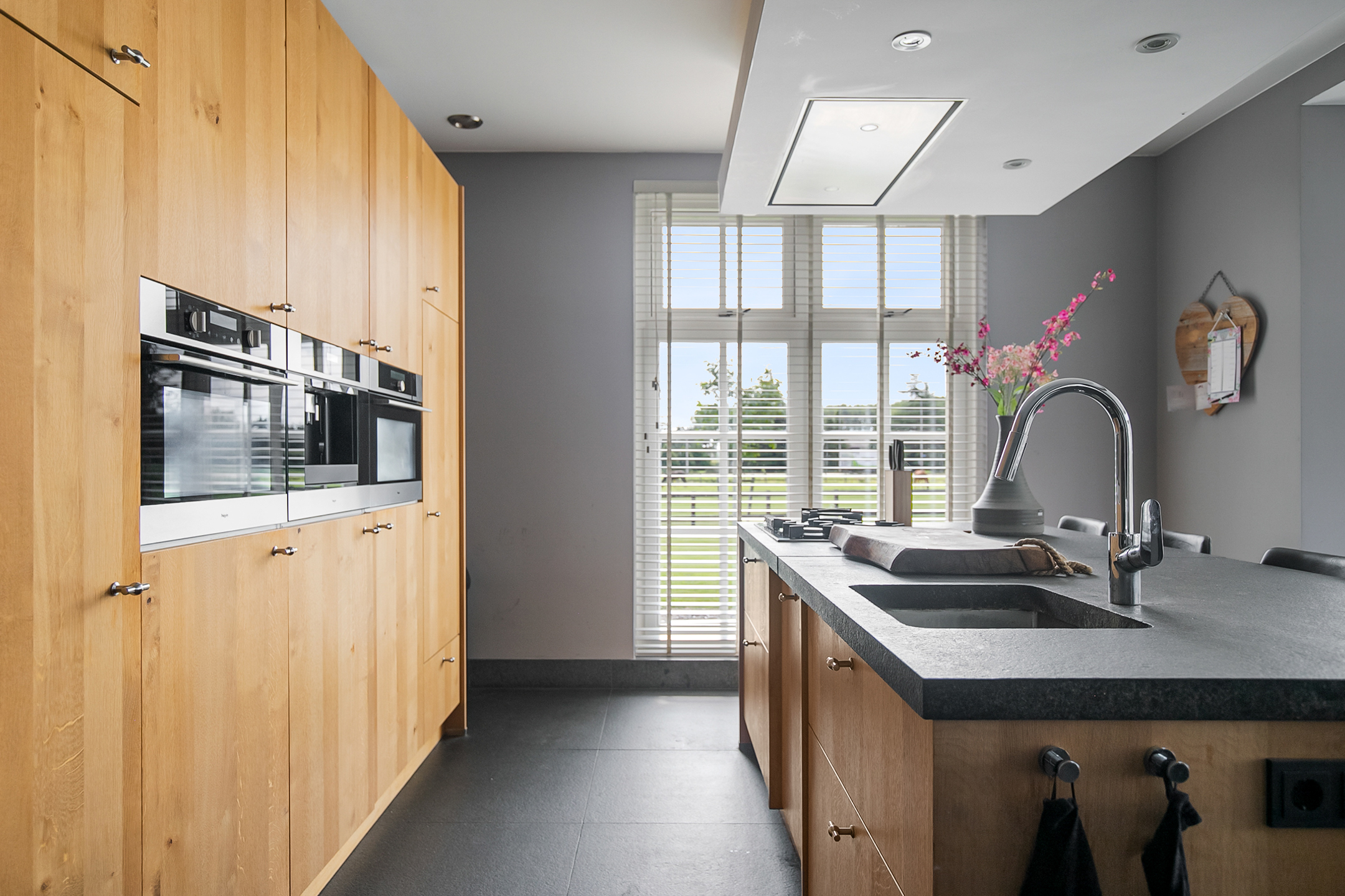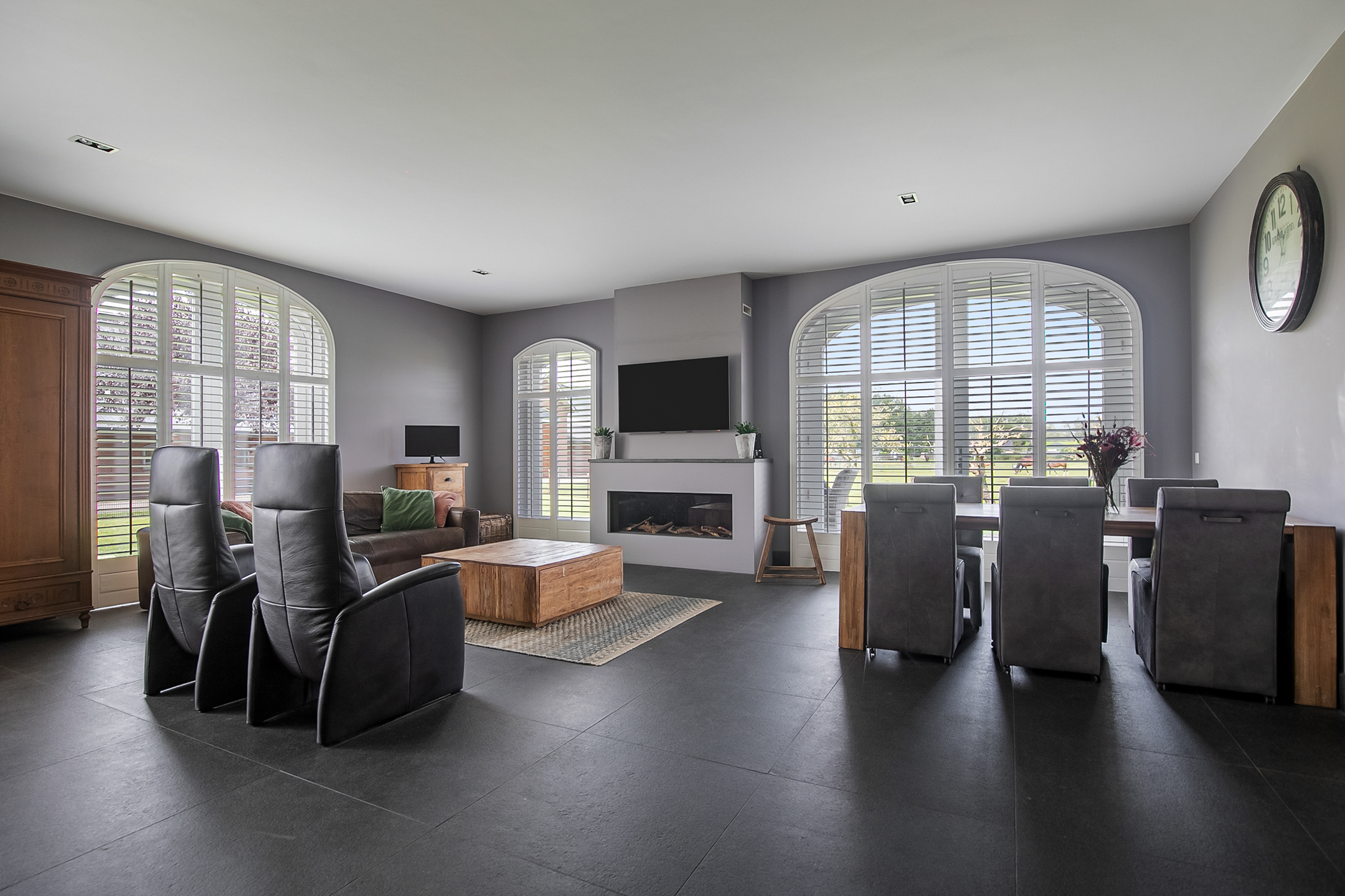 - De raampartijen in het achterhuis zijn voorzien van sfeervolle shutters.