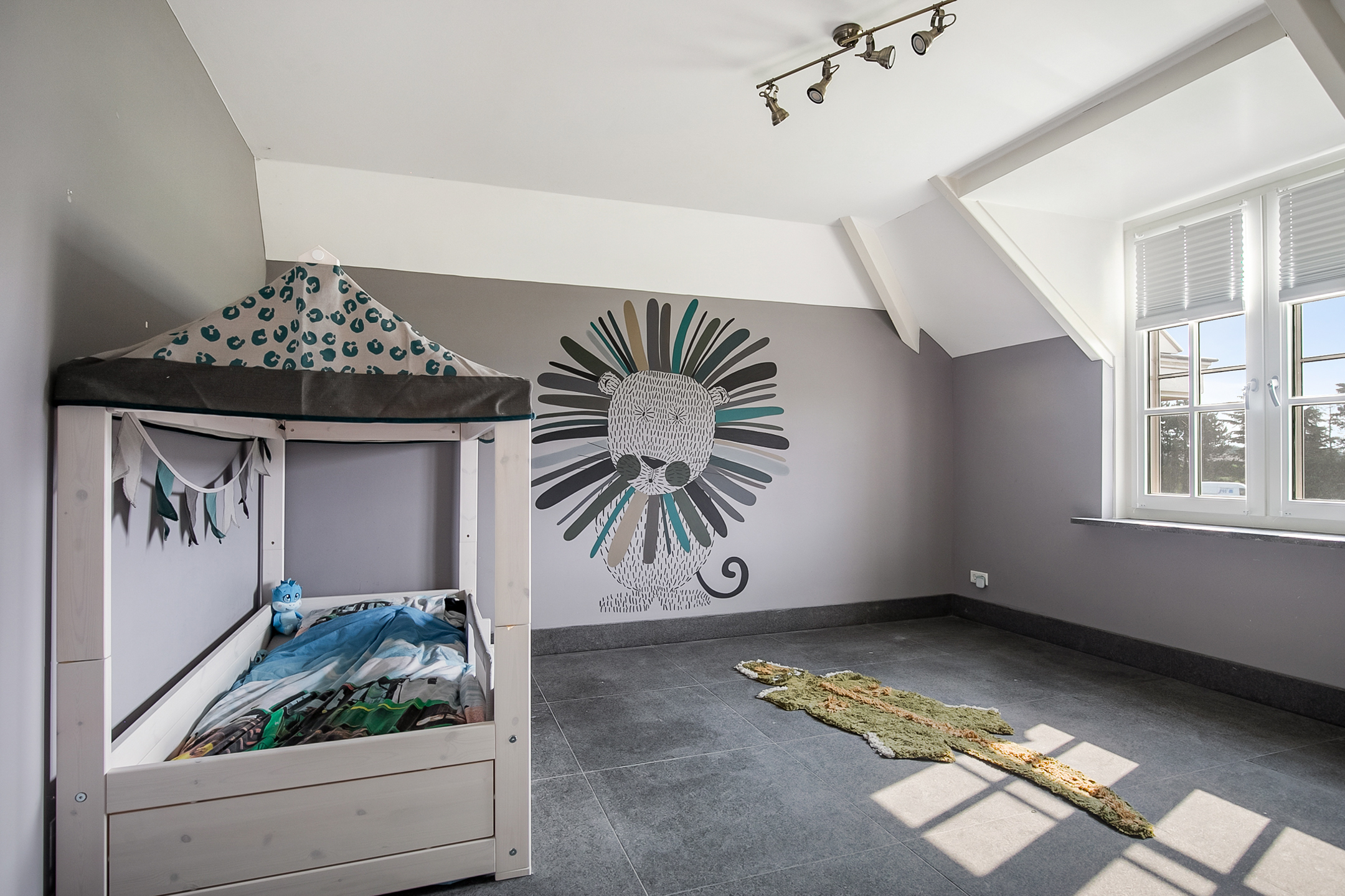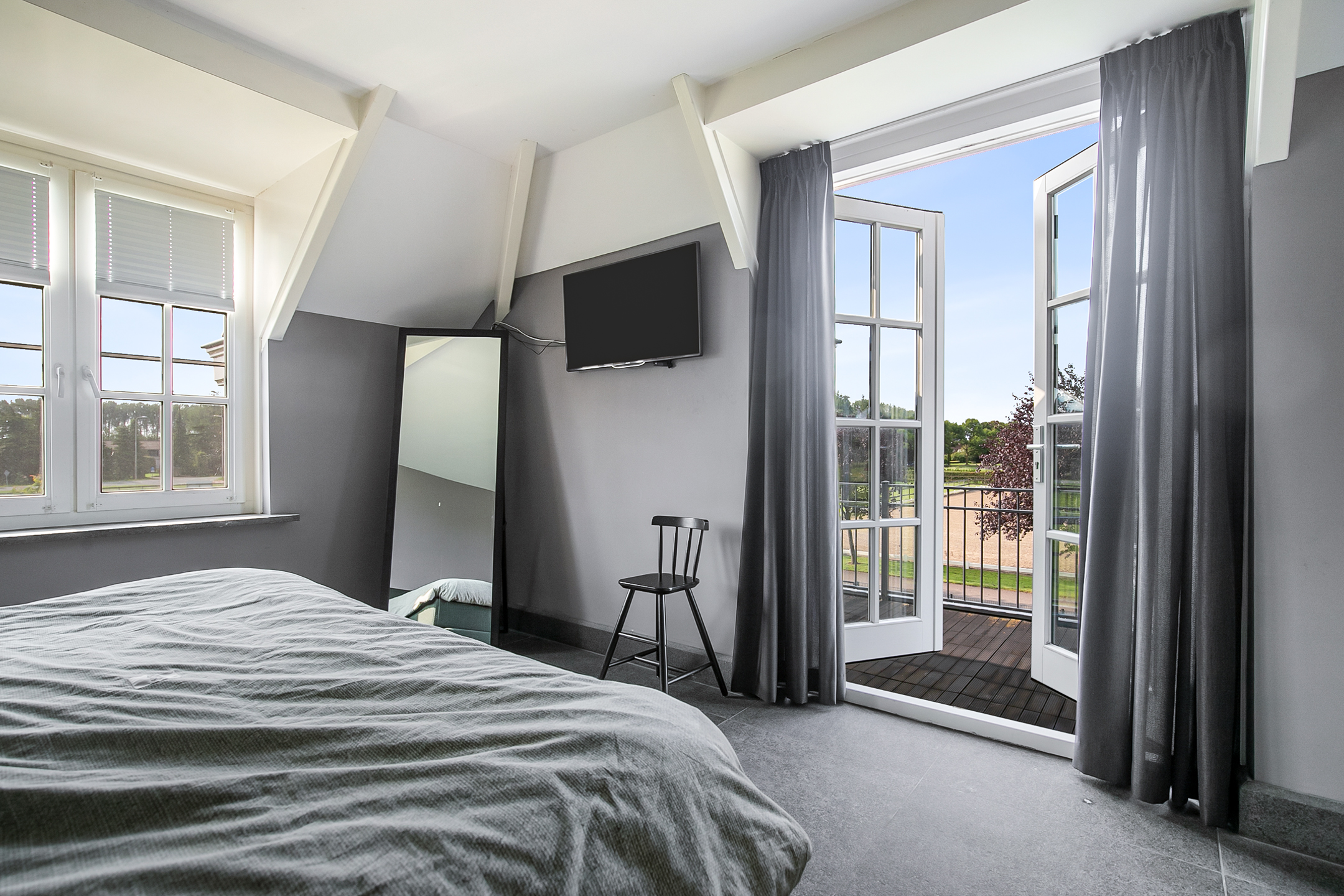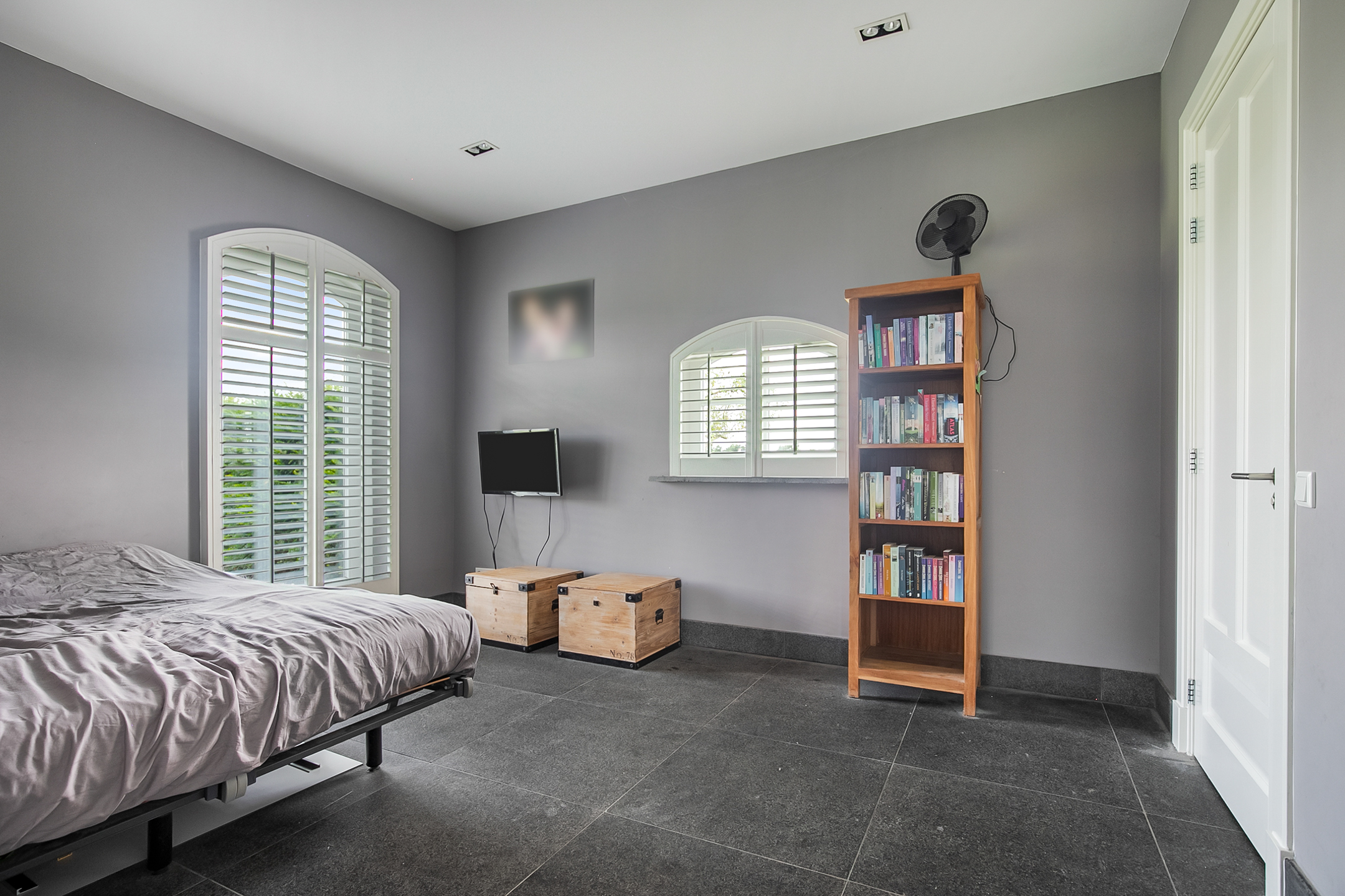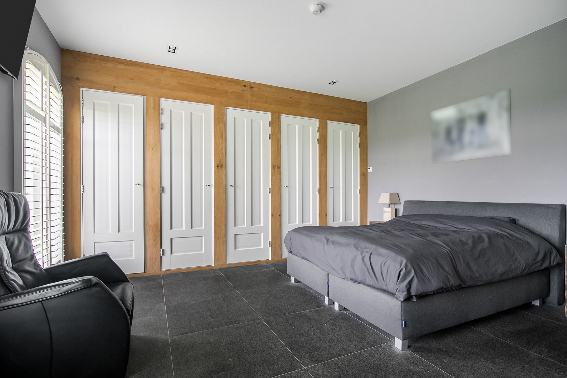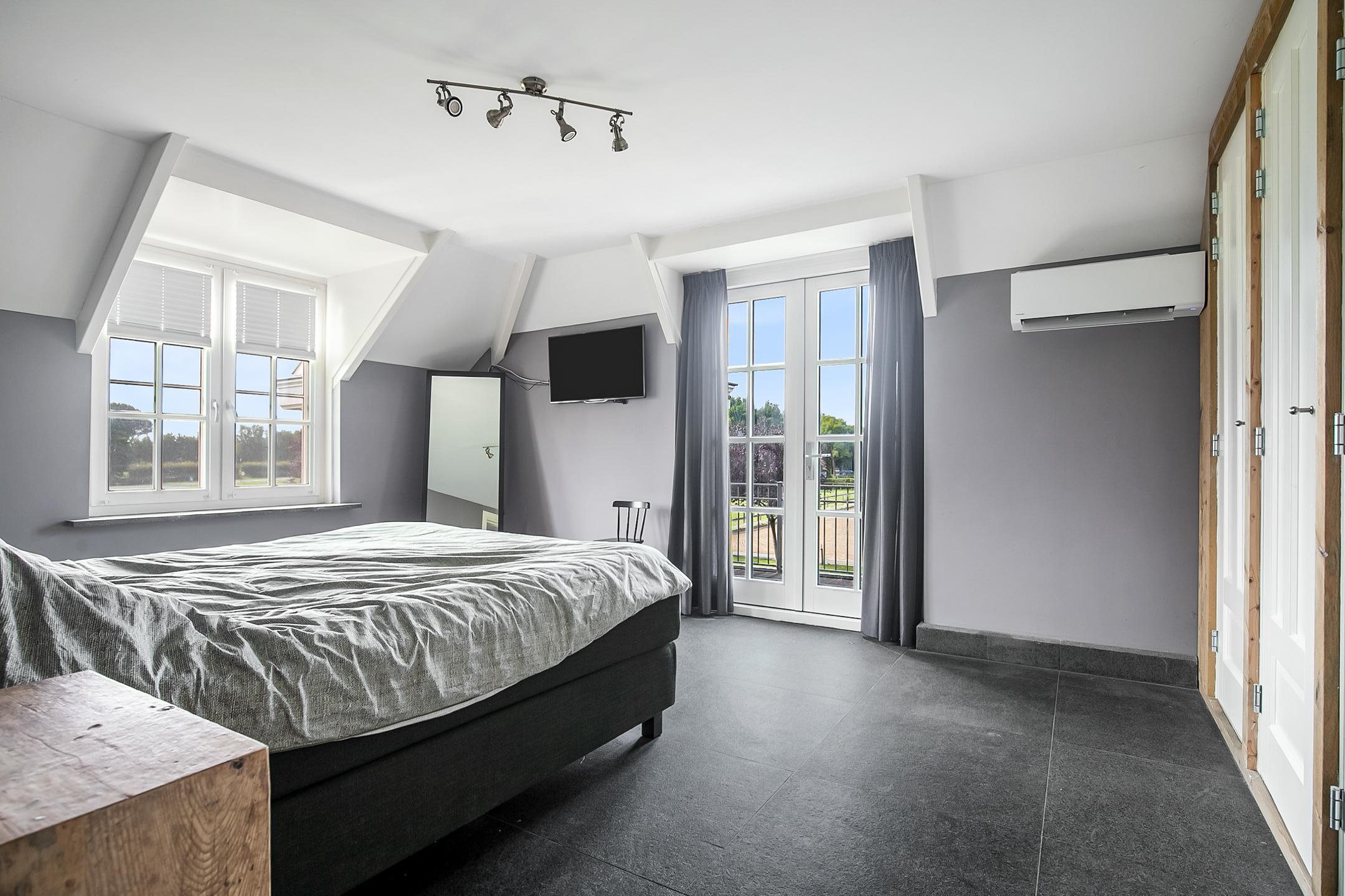 Deze masterbedroom is uitgerust met praktische vaste kastenwand, welke zorgt voor veel opbergruimte. Een raampartij zorgt ook hier voor natuurlijke lichtinval.