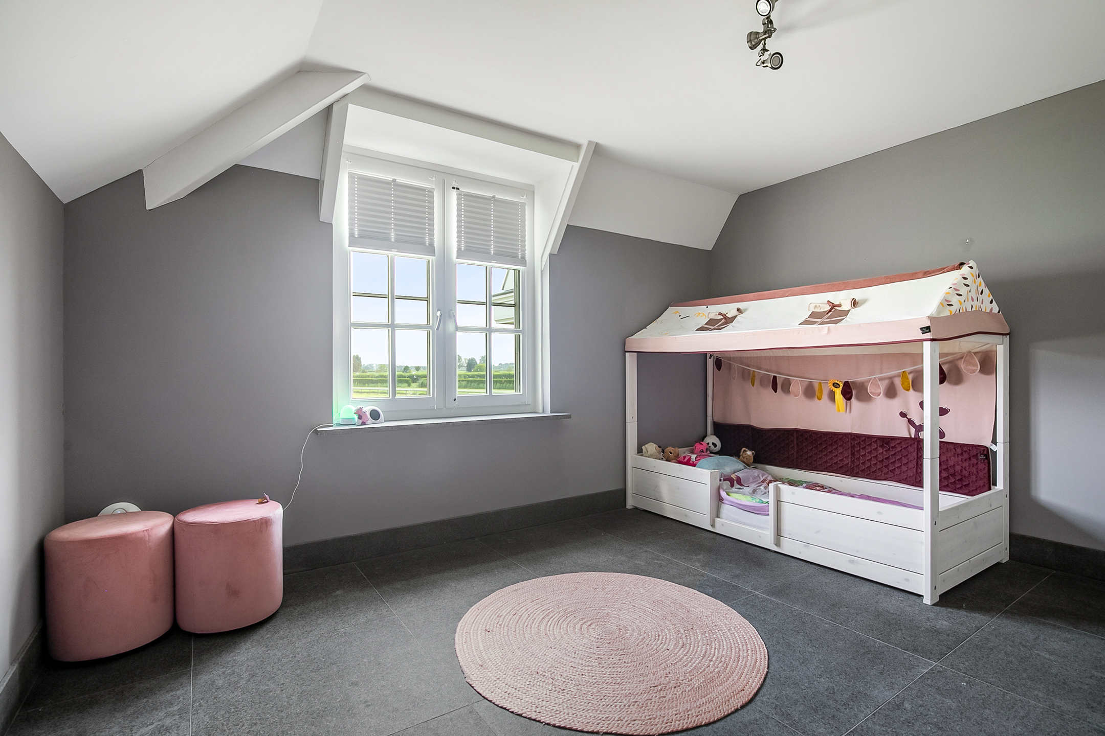 De royale overloop met vide biedt toegang tot 3 ruime slaapkamers, de badkamer, toiletruimte en de zolder. Ook is er toegang tot een charmant Frans balkon welke een fraai uitzicht biedt op de omgeving. De overloop en alle slaapkamers hebben dezelfde afwerking, natuurstenen vloer, stucwerk wanden en een stucwerk plafond.