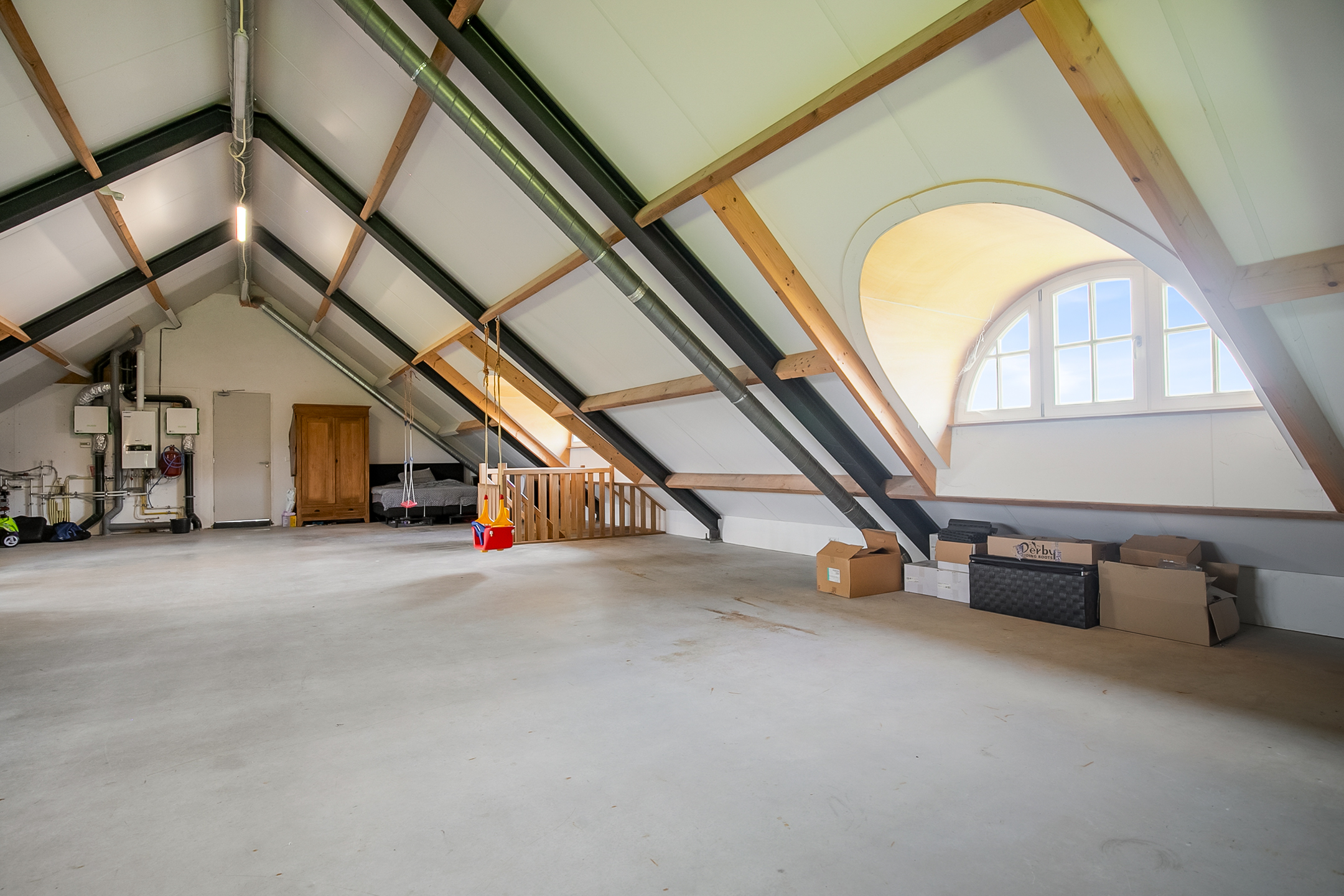 De zeer royale zolderruimte is op dit moment vooral in gebruik als opslagruimte, maar kan uiteraard ook worden gebruikt en ingericht voor diverse andere doeleinden. 4 fraaie halfronde dakkappelen zorgen voor natuurlijk lichtinval en ventilatie. In deze ruimte zijn de opstelling voor de CV-combiketel (Nefit), de unit voor de mechanische ventilatie en de unit voor de vloerverwaming gesitueerd. Een vaste trap zorgt voor toegang naar de hal van het achterhuis.