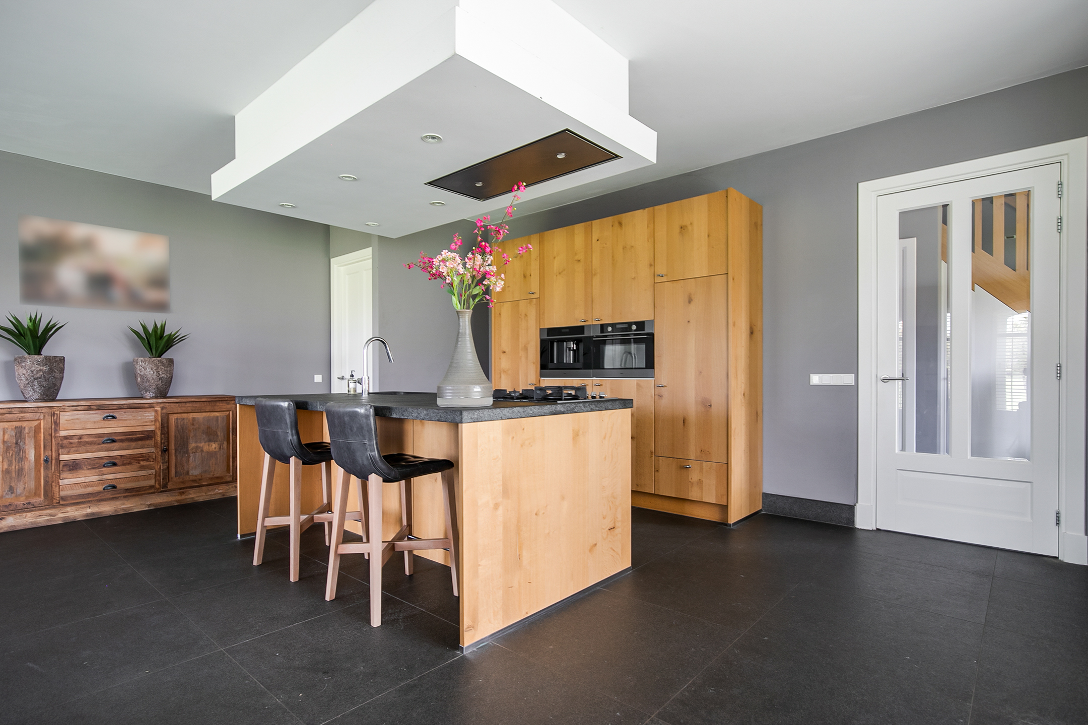 De hal biedt toegang tot de woonkamer, bijkeuken, toiletruimte en de vaste trapopgang tot de zolderruimte op de 1e verdieping. In de trapkast is de unit voor de vloerverwarming gesitueerd. De toiletruimte is deels betegeld en verder voorzien van een zwevend toilet en een fonteintje. De praktische bijkeuken is uitgerust met een op maat gemaakt keukenblok. De aansluitingen voor de wasapparatuur zijn hier gesitueerd. Ook is er vanuit hier toegang tot de meterkast. Een loopdeur zorgt vanuit de bijkeuken voor toegang tot de bijkeuken/wasruimte van het voorhuis. De sfeervolle woonkamer met open keuken is voorzien van een natuurstenen vloer, stucwerk wanden en een stucwerk plafond met inbouwverlichting. Drie stuks dubbele openslaande deuren en een grote raampartij voorzien van fraaie en praktische shutters zorgen voor veel natuurlijke lichtinval. Een fraaie schouw met gashaard zorgt voor extra sfeer en warmte in de ruimte. De keuken beschikt over een inrichting in een wandopstelling met apparatenwand en een kook- en spoeleiland. De apparatenwand is verder uitgerust met een combioven, koffiezetapparaat, een koelkast en een vriezer. Het eiland beschikt over een 4-pits gaskookplaat met wokbrander en ingebouwde afzuigkap in het plafond, een spoelbak en een vaatwasser. Diverse kastjes en lades zorgen voor veel opbergruimte. Vanuit de woonkamer is er toegang tot de logeerkamer. Deze slaapkamer is voorzien van een natuurstenen vloer, stucwerk wanden en een stucwerk plafond met inbouwverlichting. Vanuit deze kamer is er toegang tot de badkamer. Deze badkamer is afgewerkt met dezelfde natuurstenen vloer als in de rest van de ruimtes. De wanden en het plafond zijn voorzien van stucwerk. De badkamer is verder uitgerust met een ruime inloopdouche met sunshower, twee wastafels met meubel een zwevend toilet en een design radiator. Een raampartij zorgt voor natuurlijk lichtinval. Vanuit de badkamer loop je verder naar de masterbedroom. Deze masterbedroom is uitgerust met praktische vaste kastenwand, welke zorgt voor veel opbergruimte. Een raampartij zorgt ook hier voor natuurlijke lichtinval.