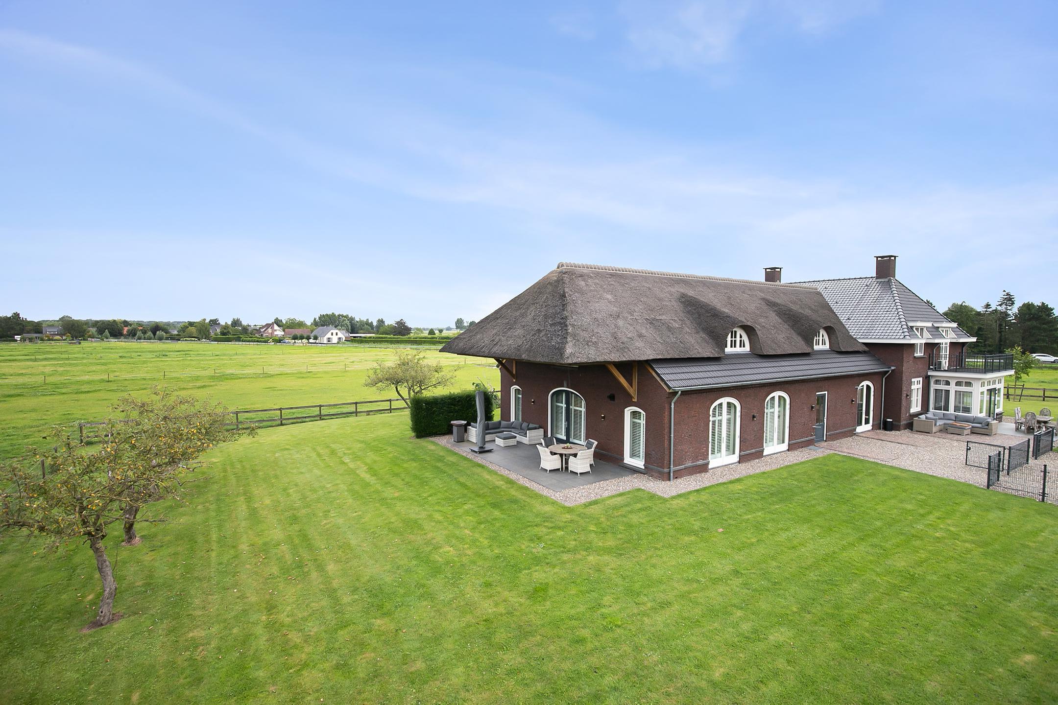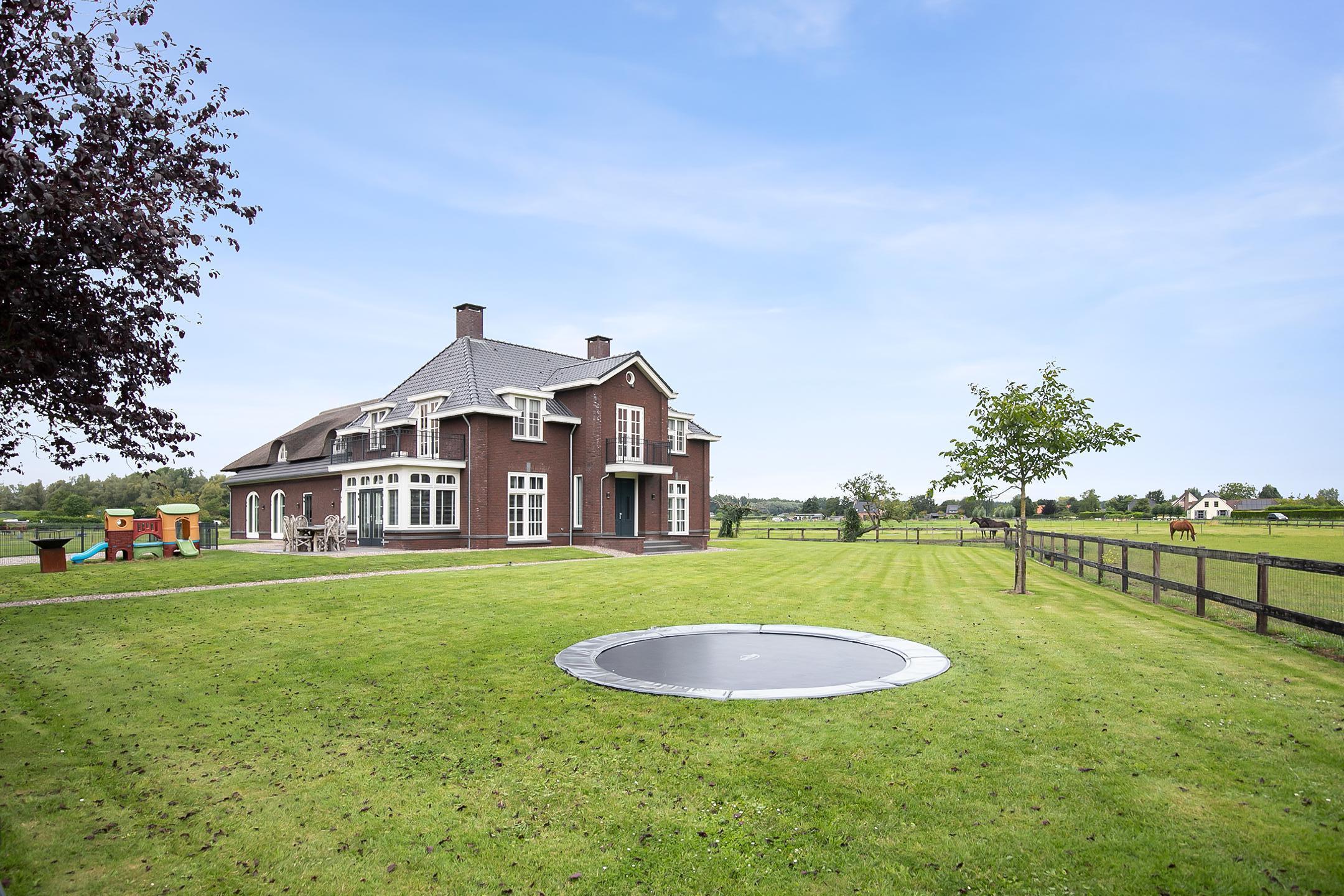 De overdekte entree met een dubbele openslaande voordeur, geeft deze villa een fraaie uitstraling. De ruime ontvangsthal met imposante houten trap biedt toegang tot de woonkamer en de 1e verdieping. De hal is voorzien van een natuurstenen tegelvloer, stucwerk wanden en een stucwerk plafond. De royale leefkeuken met eetkamergedeelte is voorzien van een natuurstenen tegelvloer, stucwerk wanden en een stucwerk plafond met inbouwverlichting. De keuken beschikt over een inrichting in een wandopstelling met apparatenwand en een kook- en spoeleiland. De apparatenwand is verder uitgerust met een oven, koffiezetapparaat, een stoomoven en een koelkast. Het eiland beschikt over een 5-pits gaskookplaat met ingebouwde afzuigkap in het plafond, een spoelbak en een vaatwasser. Diverse kastjes en lades zorgen voor veel opbergruimte. Een grote erker/uitbouw met openslaande deuren zorgen voor toegang naar de tuin. De vele raampartijen zorgen voor veel natuurlijke lichtinval. Een haard zorgt voor extra sfeer en warmte in de ruimte. Vanuit de woonkamer is er een fraai uitzicht op de paardenweides. En ook hier zorgen grote raampartijen en dubbele openslaande deuren voor een zee van licht. Daarnaast is er een prachtige, grote schouw aanwezig met een gashaard welke zorgt voor nog extra sfeer en warmte in de ruimte. Schuifdeuren zorgen dat de woonkamer afgesloten kan worden van de keuken/eetgedeelte. Halfronde openslaande deuren in de zijgevel van de woning zorgen voor toegang tot het voorhuis. De ruime entreehal biedt toegang tot de bijkeuken/wasruimte, woonkamer, toiletruimte en de meterkast. De bijkeuken/wasruimte is uitgerust met een gootsteen. Tevens zijn hier de aansluitingen voor de wasapparatuur gesitueerd. Vanuit hier is er toegang tot de kantoor/werkkamer. De kantoorruimte is een fijne ruimte welke uiteraard voor diverse doeleinden geschikt is, zoals bijvoorbeeld een speelkamer of chillroom.