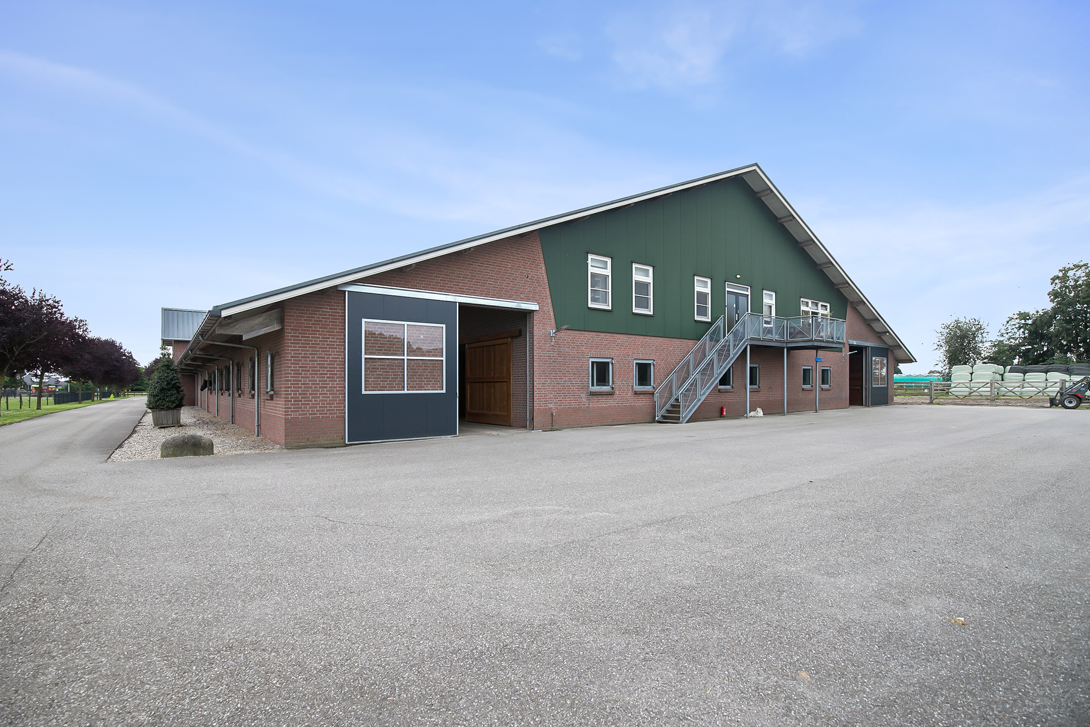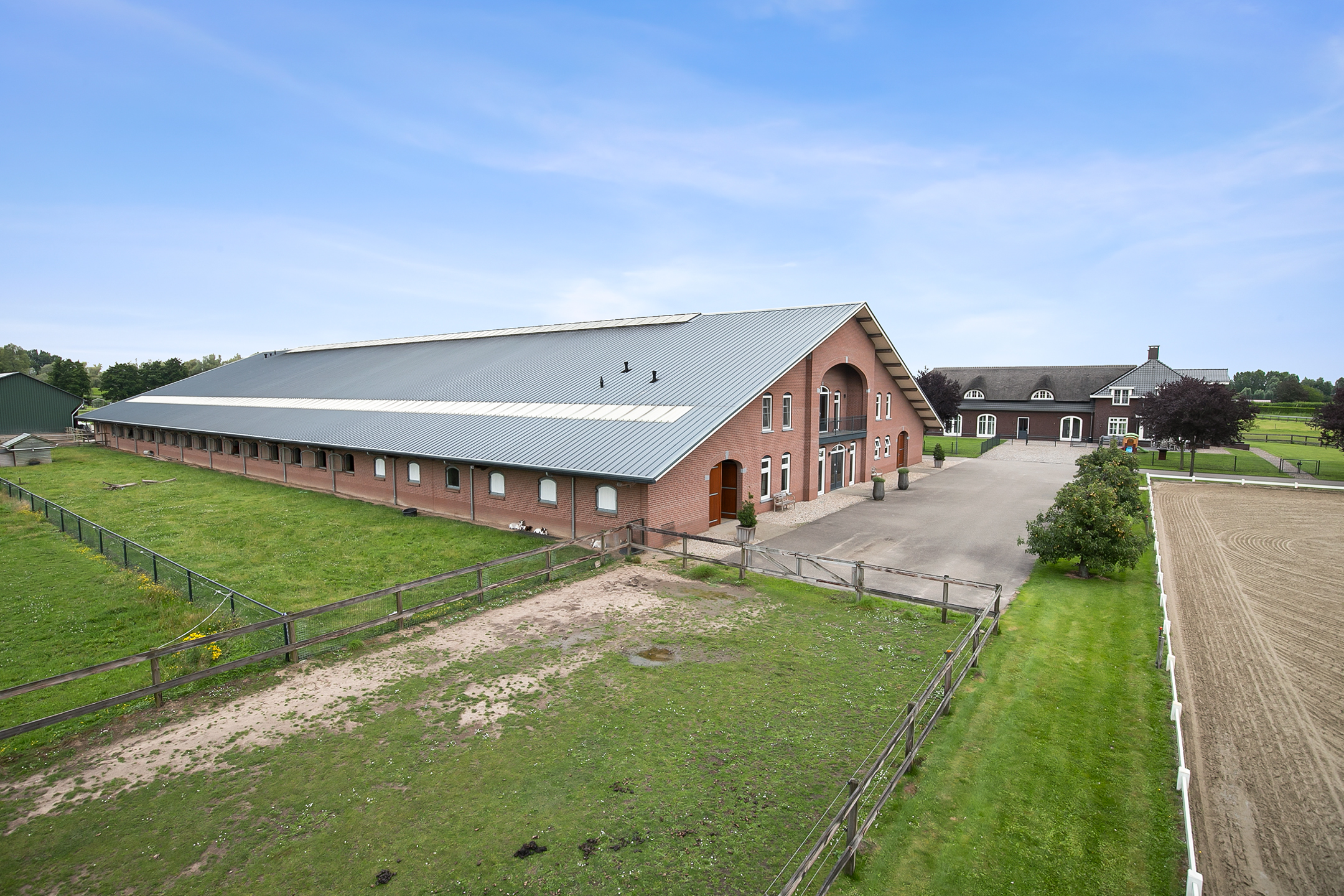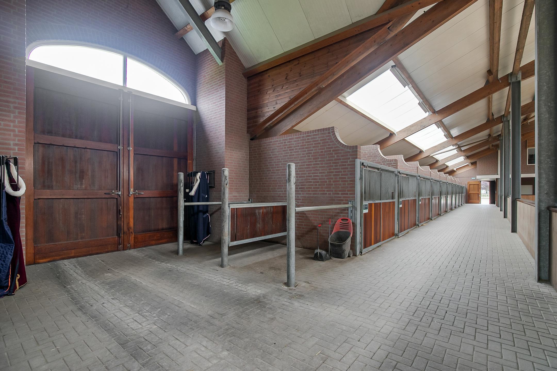 De hal aan de voorzijde van de rijhal is voorzien van een beklinkerde vloer en biedt toegang tot een berging, toiletruimtes, wasruimte en een winkelruimte. Een bordestrap biedt toegang tot de 1e verdieping. Hier is de ontvangstruimte en een appartement gesitueerd. De ontvangstruimte is voorzien van een tegelvloer, stucwerk wanden en een systeemplafond. Er is een keukenblok en een bar aanwezig. Openslaande deuren bieden toegang tot een balkon aan de voorzijde van de rijhal. Grote raampartijen bieden een fraai uitzicht op de binnenpiste en de stallen. Ook is er vanuit de ontvangstruimte toegang tot een balkon boven de binnenpiste.Het appartement is uitgerust met een woonkamer met open keuken, 2 slaapkamers en een ruime badkamer. Het appartement is voorzien van een tegelvloer. Het keukenblok beschikt over een spoelbak, inductiekookplaat, vaatwasser, koelkast en een combimagnetron. De badkamer is geheel betegeld en verder voorzien van een doucheruimte, wastafel met meubel en een zwevend toilet. Achter een praktische schuifwand is een wasruimte gesitueerd. De binnenpiste (ca. 21x61 mtr.) is voorzien van een professionele bodem (Ben Agterberg), een fraaie hardhouten bakrand. Gewelfde houten spanten zorgen voor extra sfeer. Een lichtstraat in de nok zorgt voor fraai natuurlijke lichtinval. Ook is er LED-verlichting aanwezig. De 39 paardenboxen zijn verdeeld over twee stallengangen. De boxen zijn voorzien van deels hardhouten / deels gegalvaniseerde voorwanden en metselwerk tussen- en achterwanden. De deuren van de boxen zijn draaibaar. De boxen zijn tevens uitgerust met een buitenluik. Iedere stallengang beschikt over eigen faciliteiten zoals wasplaatsen en een zadelkamer. Tussen de gangen zijn nog drie ruime loopstallen gesitueerd. De wasplaatsen zijn voorzien van een warm- en koud watervoorziening. Ook is er een plaats voor de hoefsmid en fysio aanwezig. Aan de achterzijde is nog een appartement gesitueerd. Middels een bordestrap aan de buitenzijde is er toegang. Hier is tevens een balkon gesitueerd. Het appartement beschikt over een ruime woonkamer met open keuken, 3 slaapkamers, een ruime badkamer, een bijkeuken, wasruimte en een toiletruimte.Aan de achterzijde van het perceel is een vrijstaande veldschuur gesitueerd. De schuur is opgetrokken uit metselwerk plinten met damwand gevels en het geisoleerde dak is met sandwichpanelen gedekt. Aan de voorzijde is de veldschuur voorzien van windbreekgaas. In de schuur is een voersilo aanwezig. Er zijn momenteel 14 paardenboxen en een longeercirkel gesitueerd, maar uiteraard is deze schuur geheel naar wens ook uitermate geschikt voor diverse andere doeleinden.