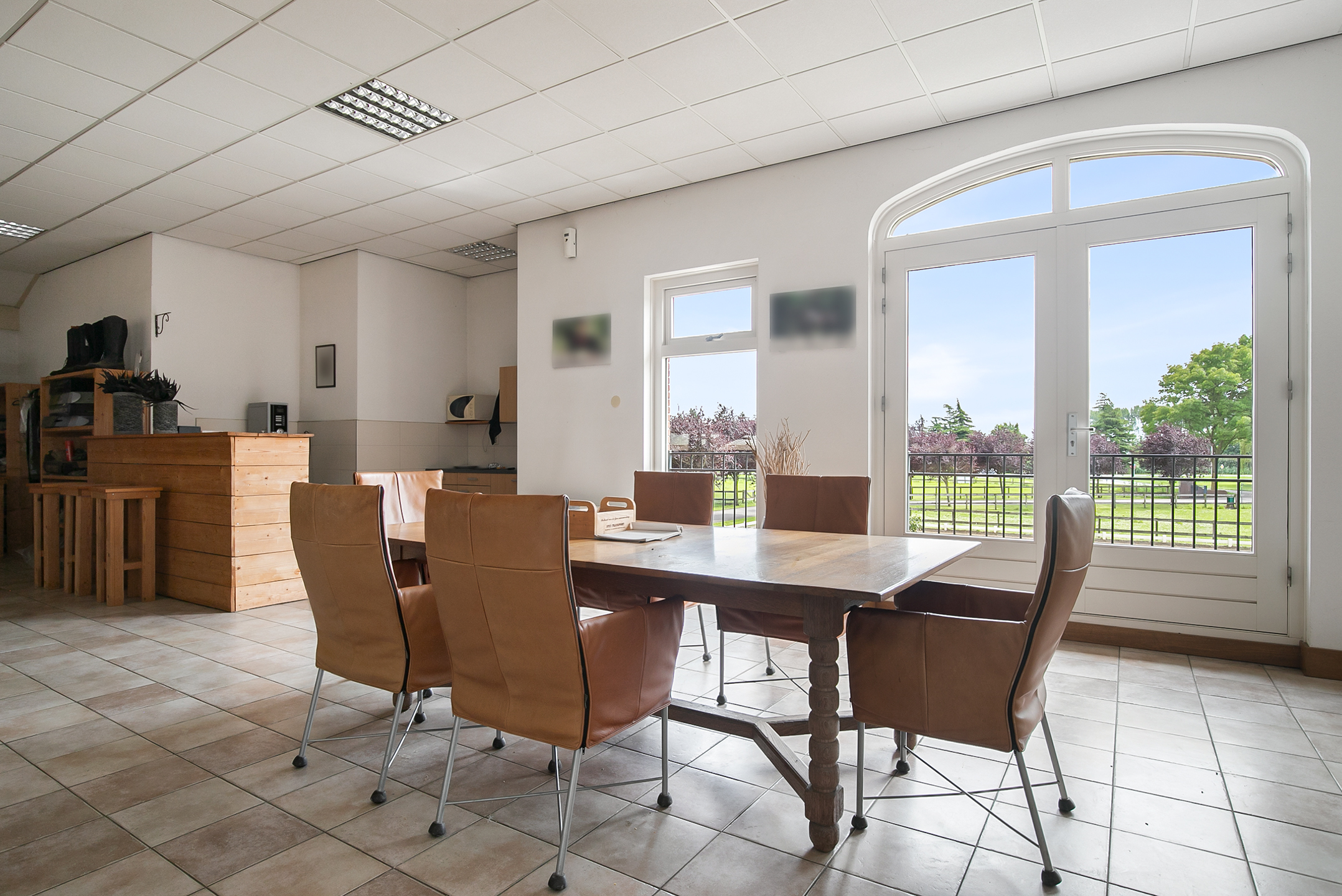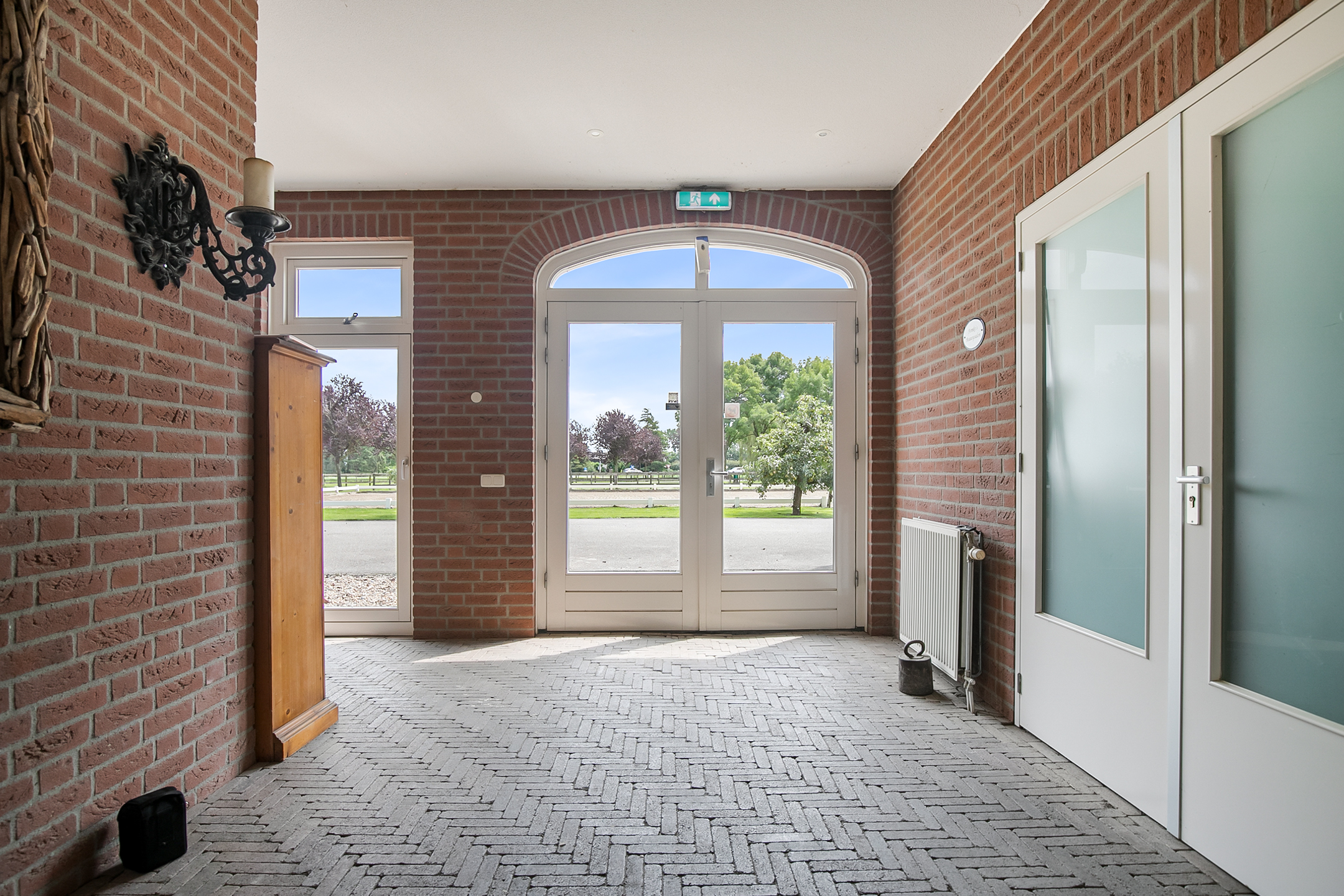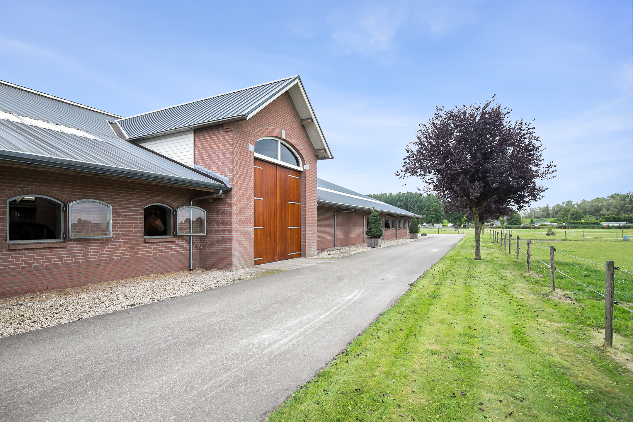 De hal aan de voorzijde van de rijhal is voorzien van een beklinkerde vloer en biedt toegang tot een berging, toiletruimtes, wasruimte en een winkelruimte. Een bordestrap biedt toegang tot de 1e verdieping. Hier is de ontvangstruimte en een appartement gesitueerd. De ontvangstruimte is voorzien van een tegelvloer, stucwerk wanden en een systeemplafond. Er is een keukenblok en een bar aanwezig. Openslaande deuren bieden toegang tot een balkon aan de voorzijde van de rijhal. Grote raampartijen bieden een fraai uitzicht op de binnenpiste en de stallen. Ook is er vanuit de ontvangstruimte toegang tot een balkon boven de binnenpiste.Het appartement is uitgerust met een woonkamer met open keuken, 2 slaapkamers en een ruime badkamer. Het appartement is voorzien van een tegelvloer. Het keukenblok beschikt over een spoelbak, inductiekookplaat, vaatwasser, koelkast en een combimagnetron. De badkamer is geheel betegeld en verder voorzien van een doucheruimte, wastafel met meubel en een zwevend toilet. Achter een praktische schuifwand is een wasruimte gesitueerd. De binnenpiste (ca. 21x61 mtr.) is voorzien van een professionele bodem (Ben Agterberg), een fraaie hardhouten bakrand. Gewelfde houten spanten zorgen voor extra sfeer. Een lichtstraat in de nok zorgt voor fraai natuurlijke lichtinval. Ook is er LED-verlichting aanwezig. De 39 paardenboxen zijn verdeeld over twee stallengangen. De boxen zijn voorzien van deels hardhouten / deels gegalvaniseerde voorwanden en metselwerk tussen- en achterwanden. De deuren van de boxen zijn draaibaar. De boxen zijn tevens uitgerust met een buitenluik. Iedere stallengang beschikt over eigen faciliteiten zoals wasplaatsen en een zadelkamer. Tussen de gangen zijn nog drie ruime loopstallen gesitueerd. De wasplaatsen zijn voorzien van een warm- en koud watervoorziening. Ook is er een plaats voor de hoefsmid en fysio aanwezig. Aan de achterzijde is nog een appartement gesitueerd. Middels een bordestrap aan de buitenzijde is er toegang. Hier is tevens een balkon gesitueerd. Het appartement beschikt over een ruime woonkamer met open keuken, 3 slaapkamers, een ruime badkamer, een bijkeuken, wasruimte en een toiletruimte.Aan de achterzijde van het perceel is een vrijstaande veldschuur gesitueerd. De schuur is opgetrokken uit metselwerk plinten met damwand gevels en het geisoleerde dak is met sandwichpanelen gedekt. Aan de voorzijde is de veldschuur voorzien van windbreekgaas. In de schuur is een voersilo aanwezig. Er zijn momenteel 14 paardenboxen en een longeercirkel gesitueerd, maar uiteraard is deze schuur geheel naar wens ook uitermate geschikt voor diverse andere doeleinden.