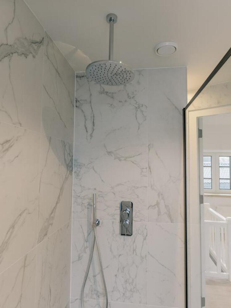 overloop welke toegang geeft tot twee ruime slaapkamers met balkon en de luxe afgewerkte badkamer met inloopdouche, toilet en dubbele wastafel.