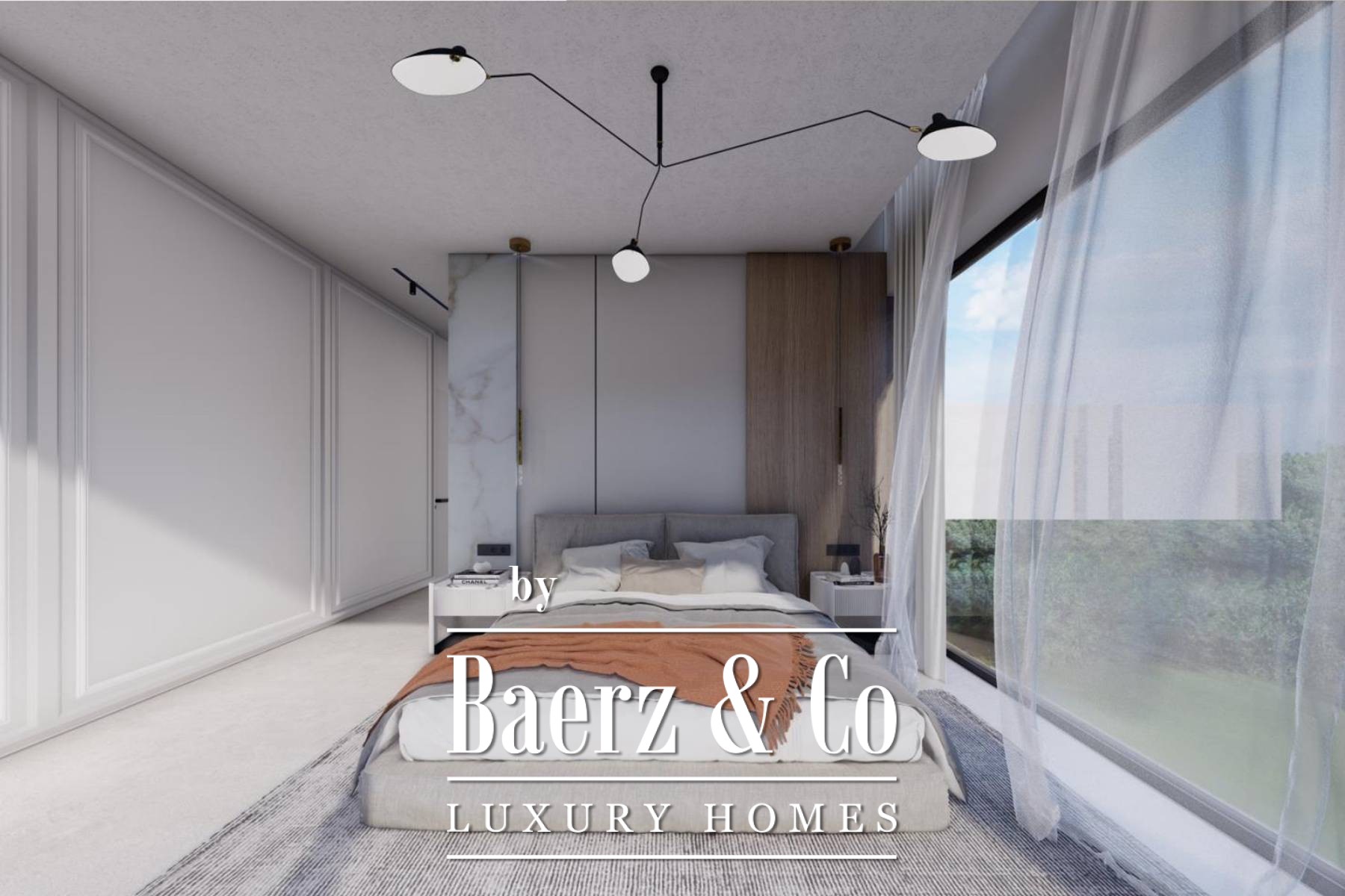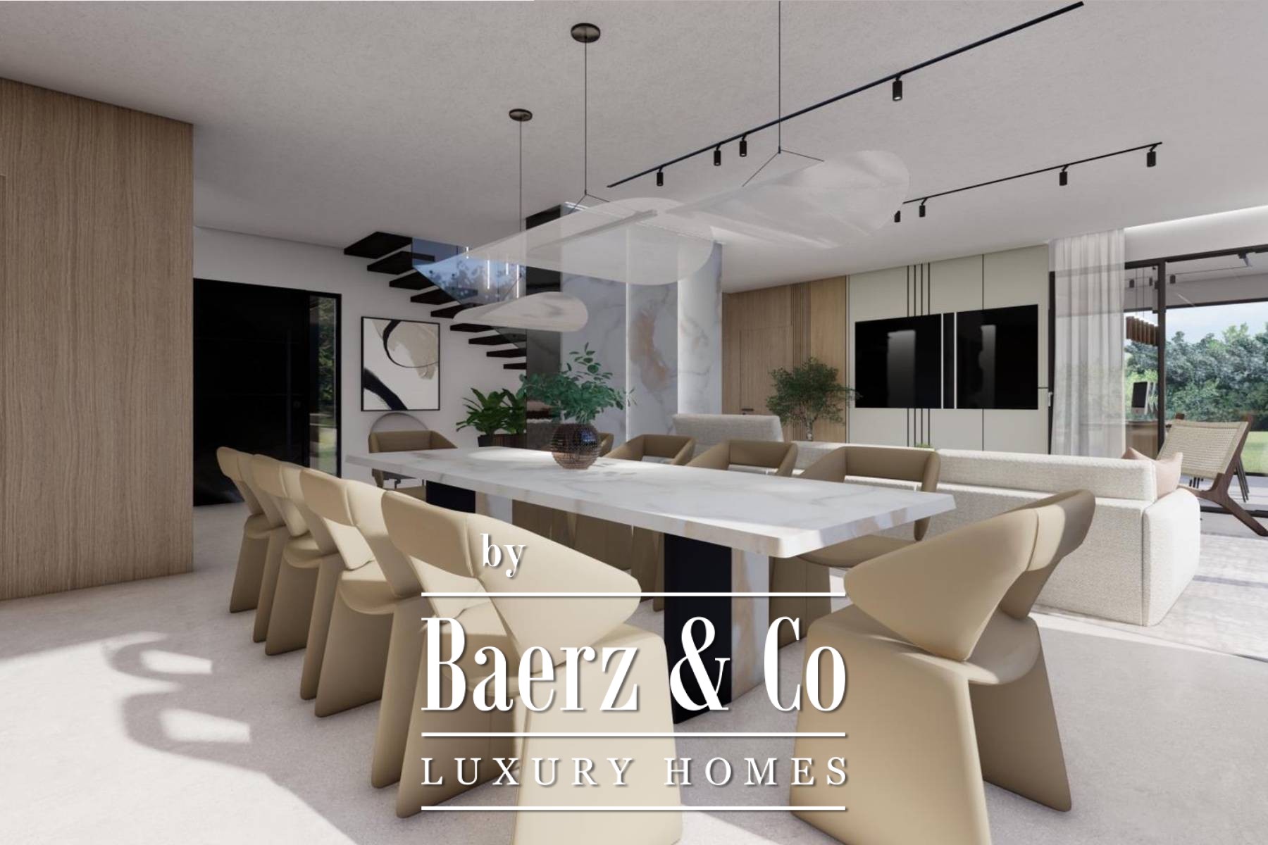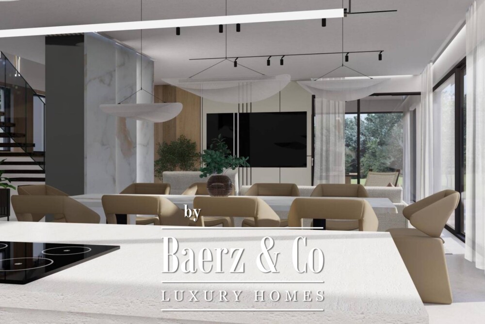 Het architectonische verhaal ontvouwt zich op de eerste verdieping met een doordachte entree, gastvoorzieningen en een open keuken met kookeiland, eet- en leefruimtes. Schuifpuien verbinden het interieur met het overdekte terras, het verwarmde zwembad, de buitenkeuken, de sauna en het zonneterras. Een privé-slaapkamer en een werkkamer completeren de zorgvuldig ingedeelde ruimte.