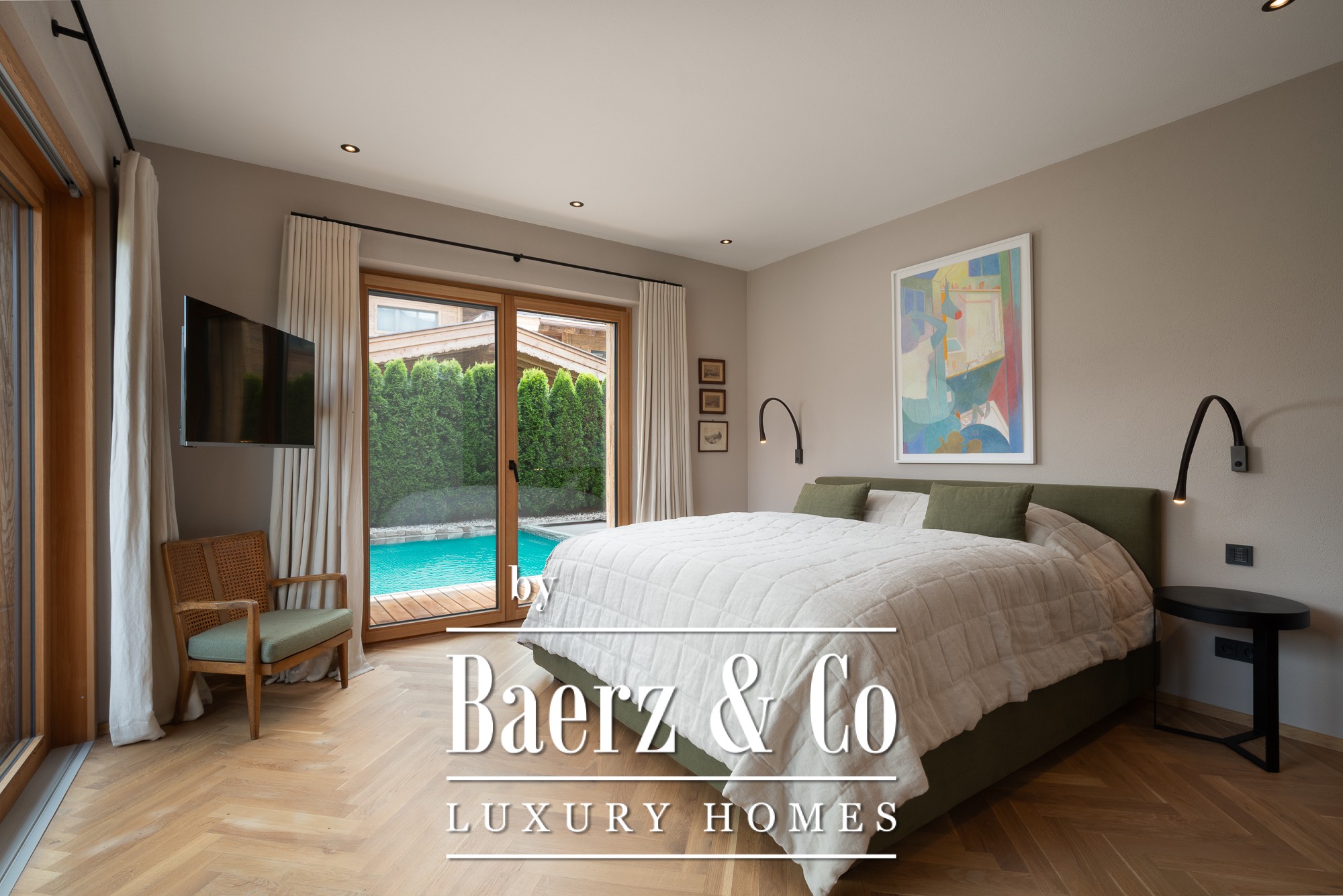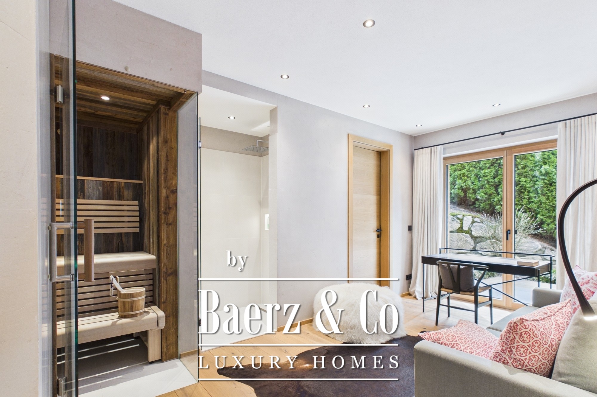 Op de eerste verdieping bieden twee ruime slaapkamers elk een eigen badkamer en direct toegang tot een beschut, op het zuiden gelegen terras, waar het zwembad een perfecte plek creëert om te ontspannen met uitzicht op weilanden en de bergen Kitzbüheler Horn, Fleckalm, Maierl, Gaisberg en Hohe Salve.