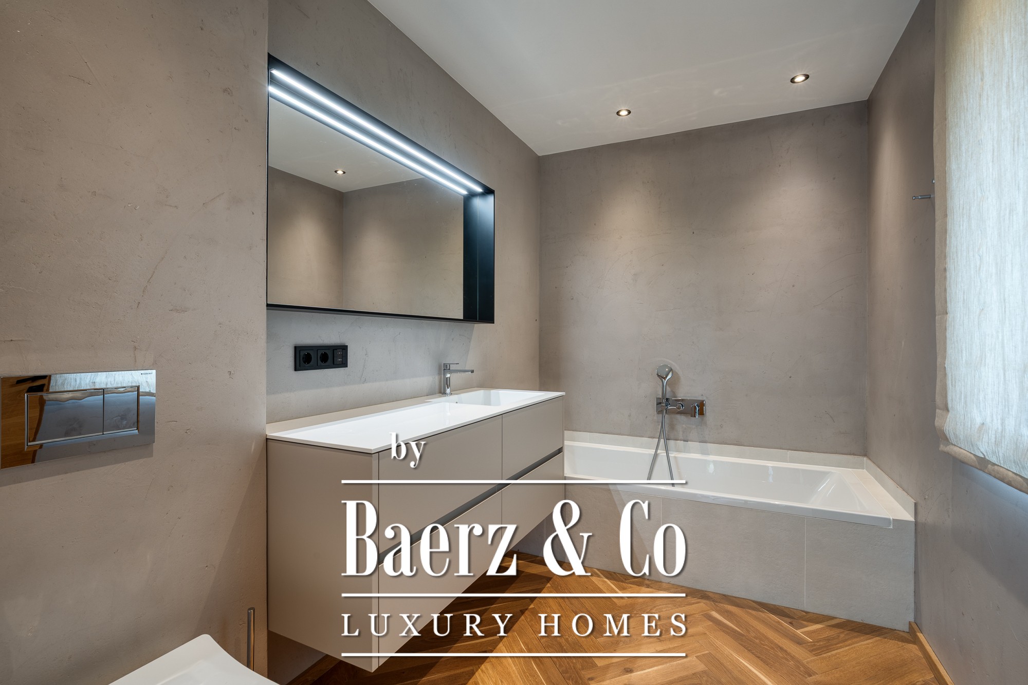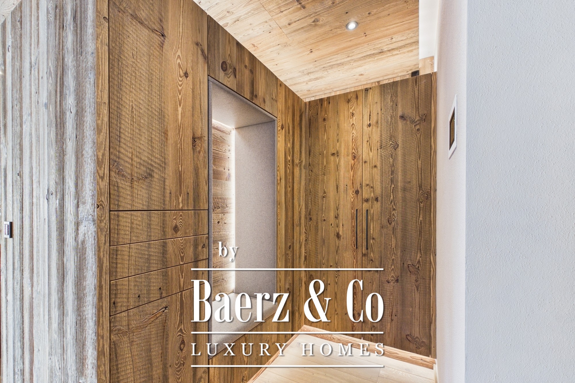 De bovenste etage onthult een open leefruimte met woonkamer, eetgedeelte en keuken, voorzien van een open haard, op maat gemaakte keuken, visgraat eiken vloeren en zichtbare balken van gerecycled hout. Het ruime balkon van 45 m² laat veel daglicht binnen en kadreert het Alpenpanorama.