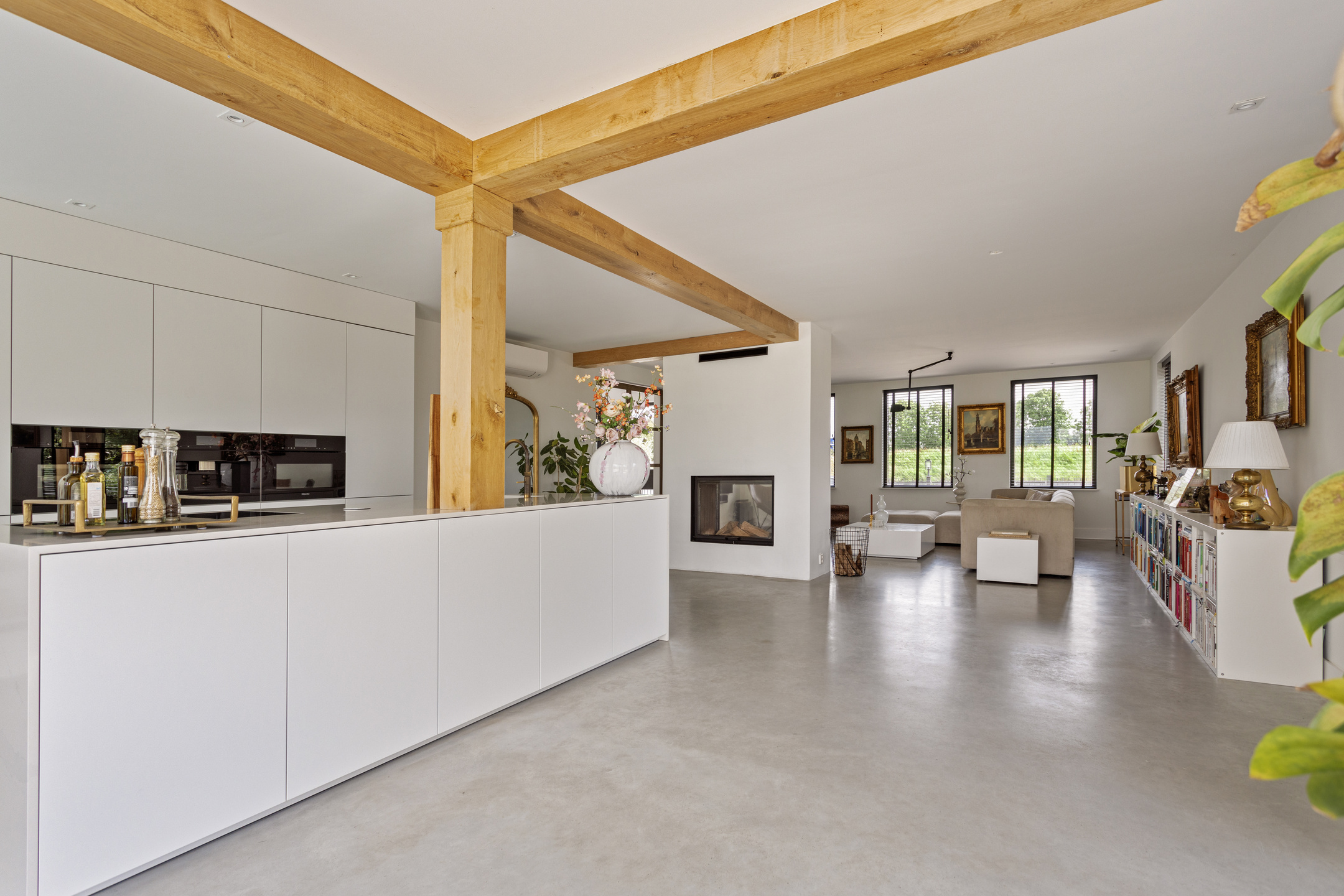 A spacious entrance with a mezzanine (creating a high ceiling) and custom-made steel pivot doors in bronze metal that lead to the living room. The living room, featuring beautiful French oak beams, is bright and airy thanks to the large windows and sliding glass doors. At its heart is an open fireplace with double-sided glass, creating a cozy atmosphere in both the living room and the kitchen.