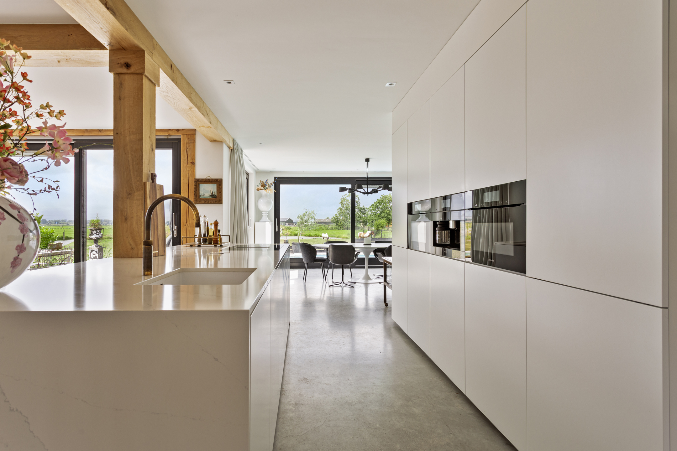 The open-plan kitchen is sleek and modern, equipped with a cooking island and built-in appliances. With ample storage and high-quality appliances, including Miele built-ins, a Quooker tap, and Hotbath Cobber faucets, it’s designed for culinary enthusiasts. The dining area at the rear of the house is ideal for a large family table, offering stunning views of the pool and surrounding meadows.