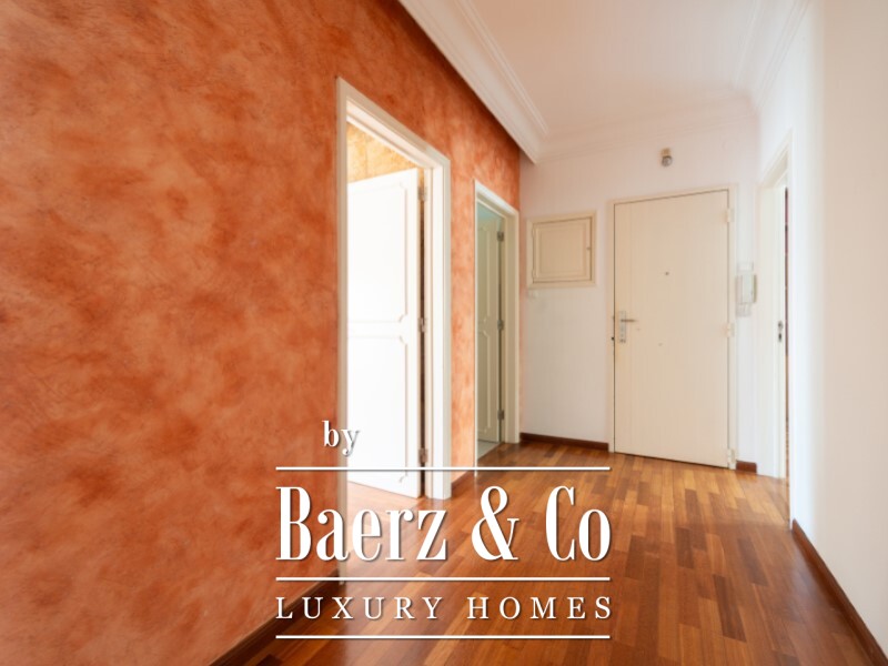 The three bedrooms offer distinct and versatile features: one with a built-in bookcase, another with a wardrobe, and the third with an enclosed sunroom and built-in storage cabinets. There is also a large closet for household linen, two full bathrooms, and a balcony.