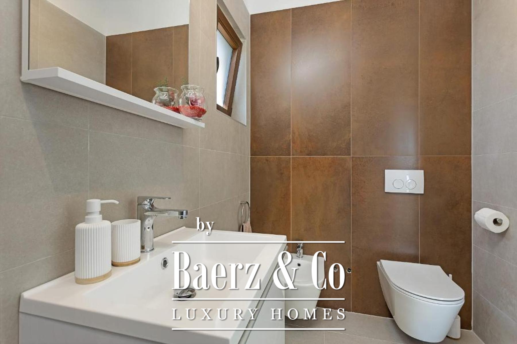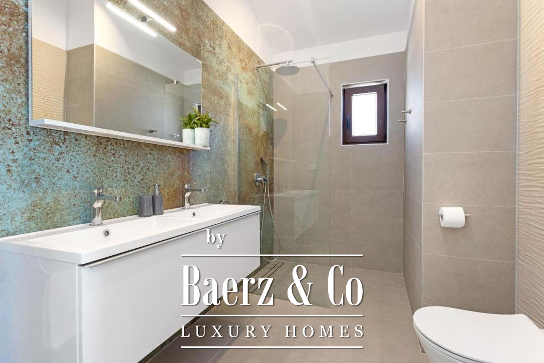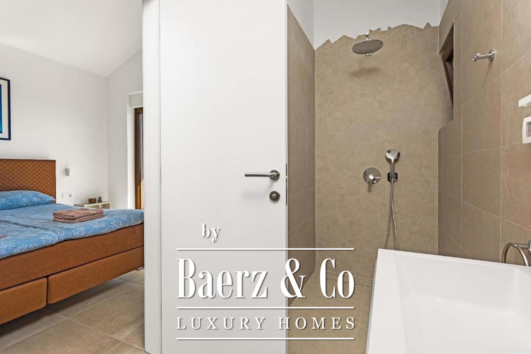 Op de eerste verdieping bevinden zich twee rustige slaapkamers, elk met een en-suite badkamer en een privéterras, die prachtig uitzicht op zee bieden en een gevoel van geborgenheid creëren. Vloerverwarming en airconditioning bieden het hele jaar door comfort, terwijl Italiaanse keramische tegels en een zorgvuldig vervaardigde houten trap getuigen van materialen van hoge kwaliteit en oog voor detail in het hele huis.