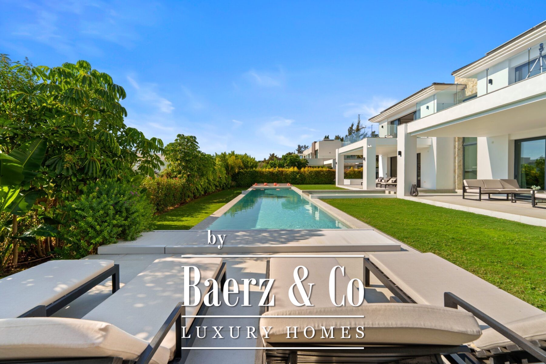 Buiten ligt de focus op een royaal zwembad met een intrekbare cover, omgeven door zonneterrassen en diverse overdekte zitgedeelten. Grenzend aan het zwembad vindt u een lounge met vuurplaats, een buitenkeuken en eetruimte, wat zorgt voor een ontspannen sfeer voor stijlvol buitenleven en entertainment het hele jaar door. Zes slaapkamers en vijf badkamers garanderen privacy en comfort, waarbij elke slaapkamer beschikt over een eigen terras en een eigentijdse afwerking.